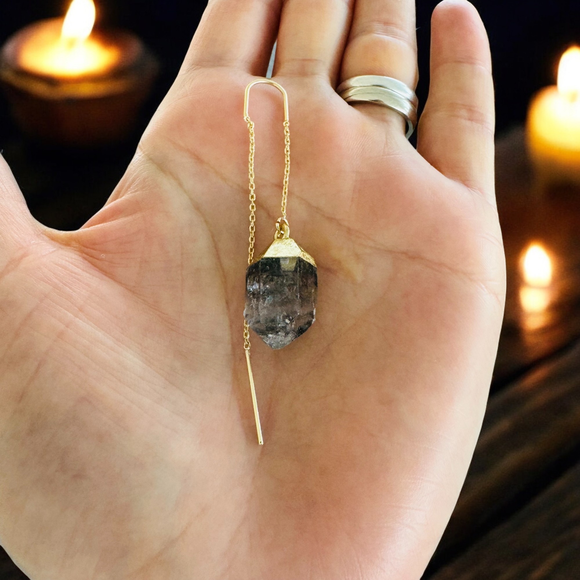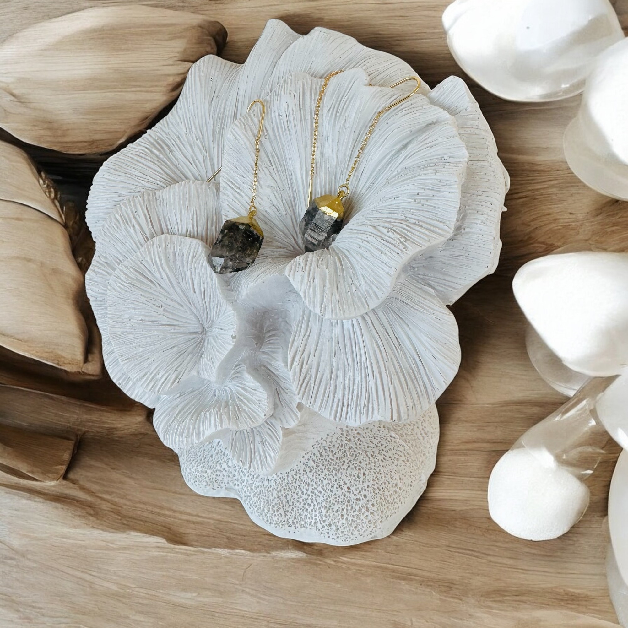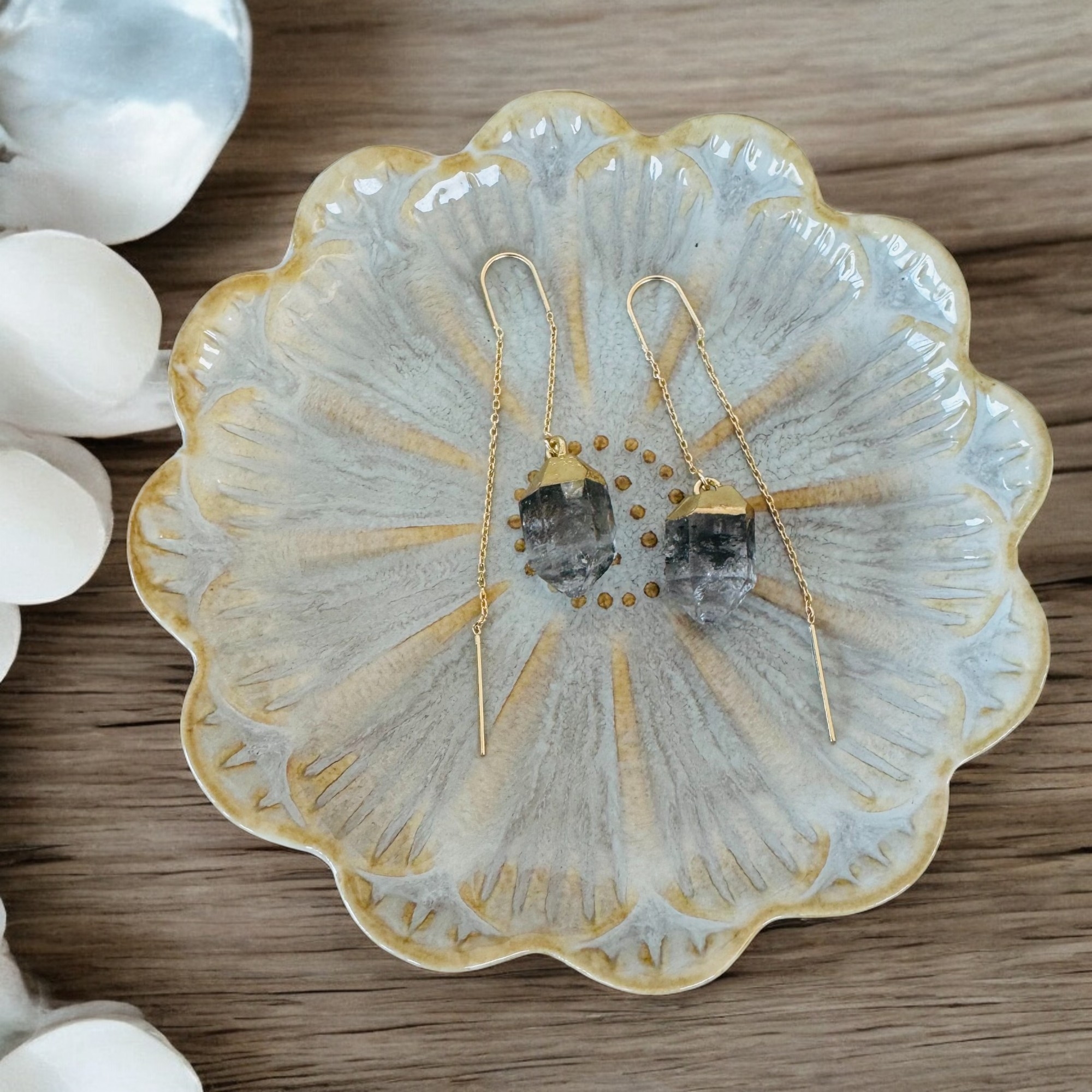 Cerceii lungi drop cu cristal brut de Diamant Herkimer placati cu aur sunt o alegere inspirata pentru femeile care iubesc eleganta simpla si naturala. Designul lor deosebit, cu cristale naturale de Diamant Herkimer, adauga o nota de unicitate fiecarei tinute. Fiecare cristal brut este selectat cu atentie pentru a pastra forma sa autentica, astfel incat cerceii sa pastreze toata frumusetea si energia naturala a pietrei.