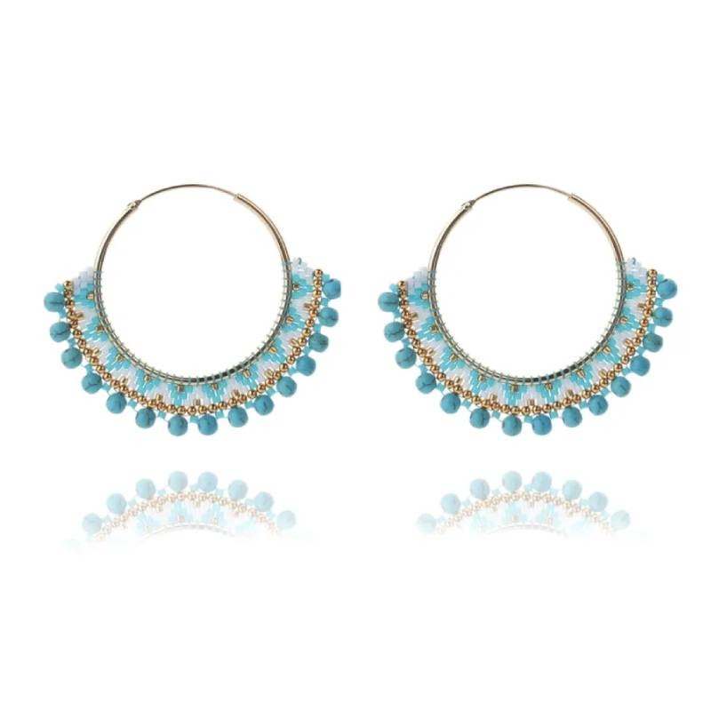 Cerceii rotunzi Priya sunt o dovada a designului boho-chic. Margelele delicate Miyuki adauga un aer de mistic stilului tau. Acesti cercei sunt versatili, ideali pentru orice ocazie - de la festivaluri de muzica pana la intalniri intime.