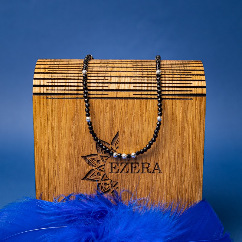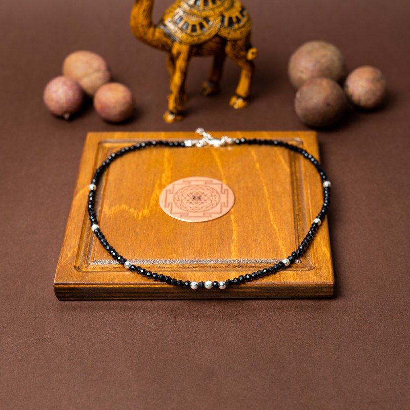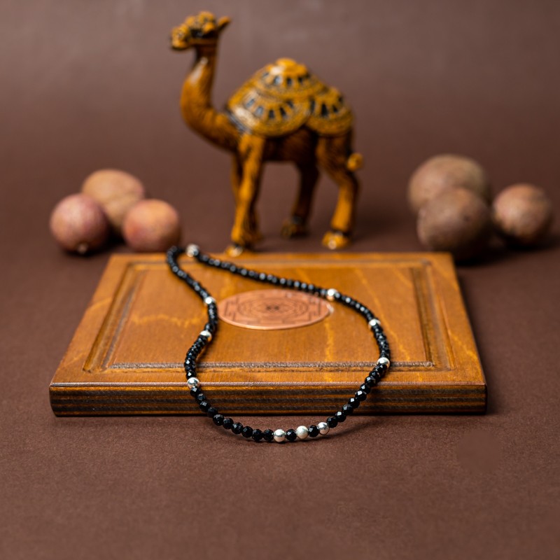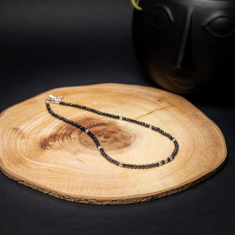 Fabricat din margele naturale de Spinel negre, acest colier elegant este un accesoriu vestimentar atemporal. Constructia sa robusta si duritatea pietrelor semipretioase asigura o rezistenta indelungata, putand fi purtat perioade lungi de timp. Colierul emana stralucire si farmec mistic, facandu-l o piesa versatila care poate fi asortata cu orice vestimentatie eleganta sau de tip casual.