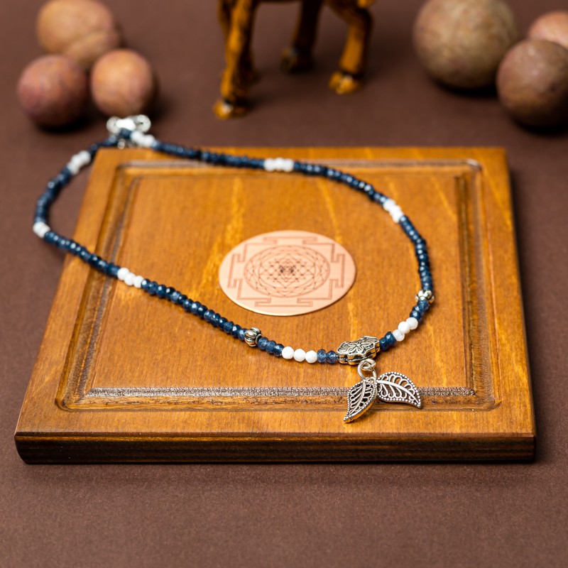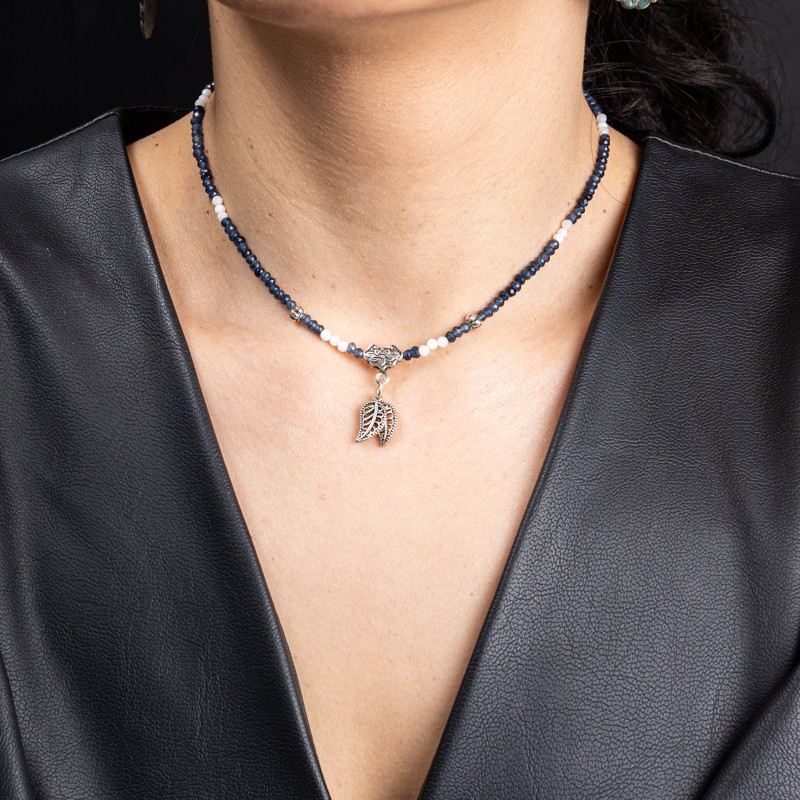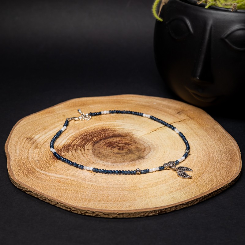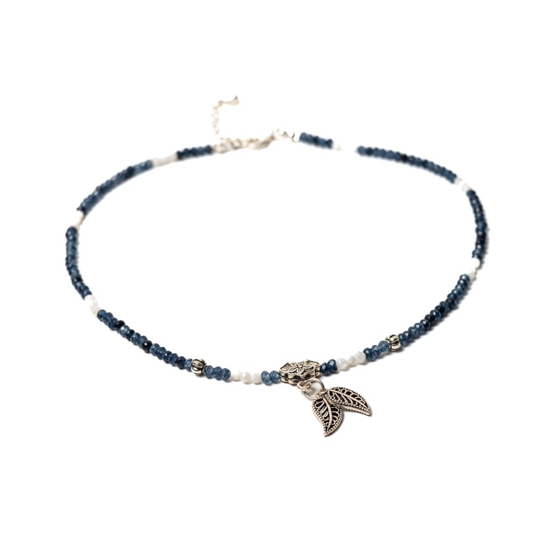 Colierul mai contine cristale de piatra lunii. Dimensiunea pietrelor de safir fatetate este de 2x3 mm.