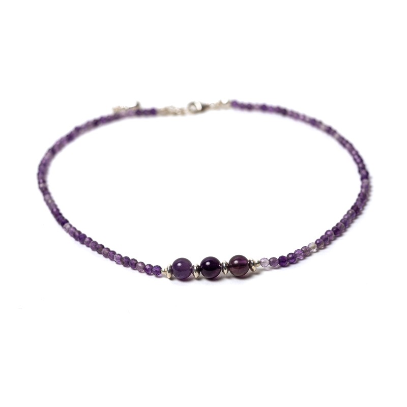 Colierul este la baza gatului si masoara aproximativ 35 cm plus 3.5 cm de lant prelungitor. Inchiderea si accesoriile sunt din argint 925. Dimensiunea pietrelor de ametist este de 3mm respectiv de 6 mm.