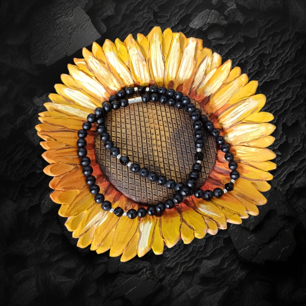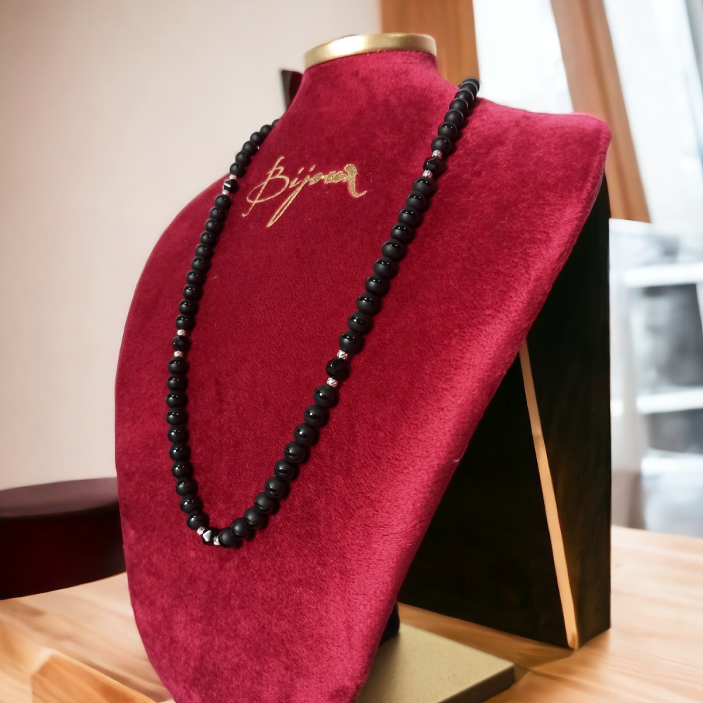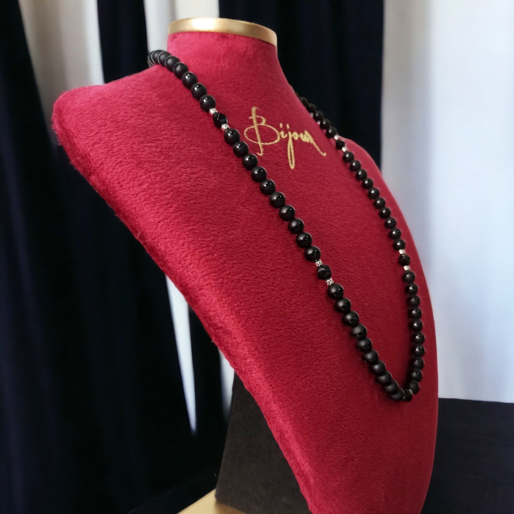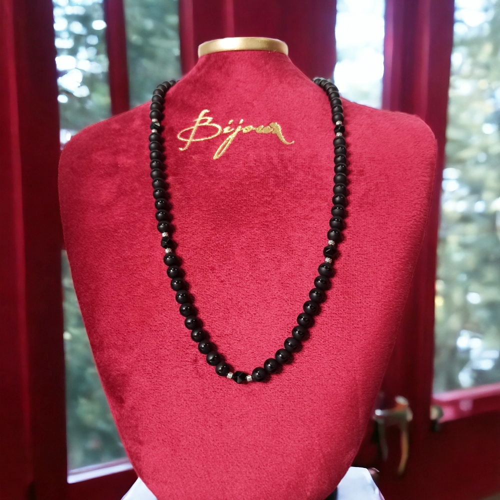 Fiecare margeluta de agat negru si onix este asemanatoare unui peisaj natural, aducand cu sine o poveste unica si o energie stabila. Accentele din otel inoxidabil completeaza armonios designul, oferind colierului o nota moderna si masculina.