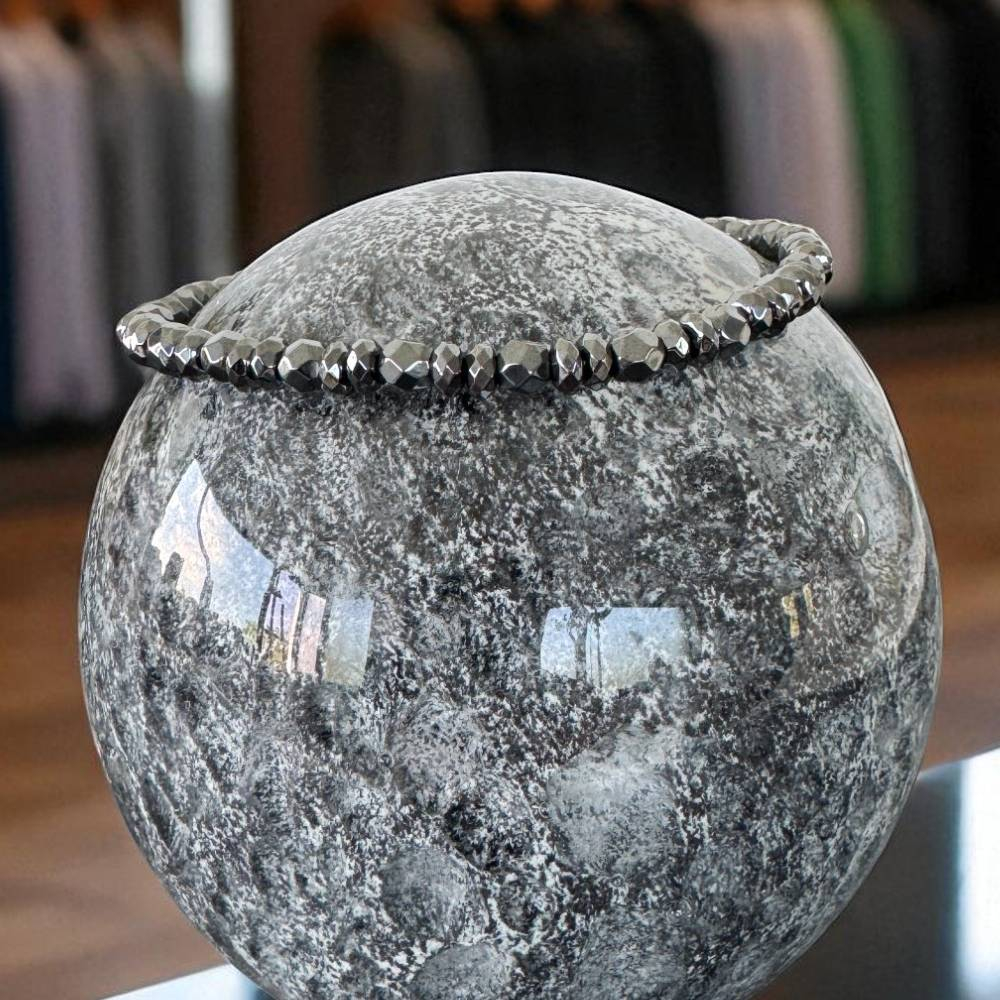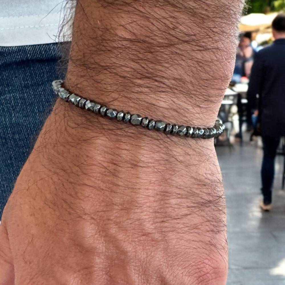 Bratara Leander este lucrata manual cu pasiune, fiecare margica de hematit fatetat fiind atent selectata pentru a crea un joc captivant de lumini si umbre. Fatetele precise ale pietrelor reflecta lumina sub unghiuri multiple, oferind un aspect dinamic si elegant.