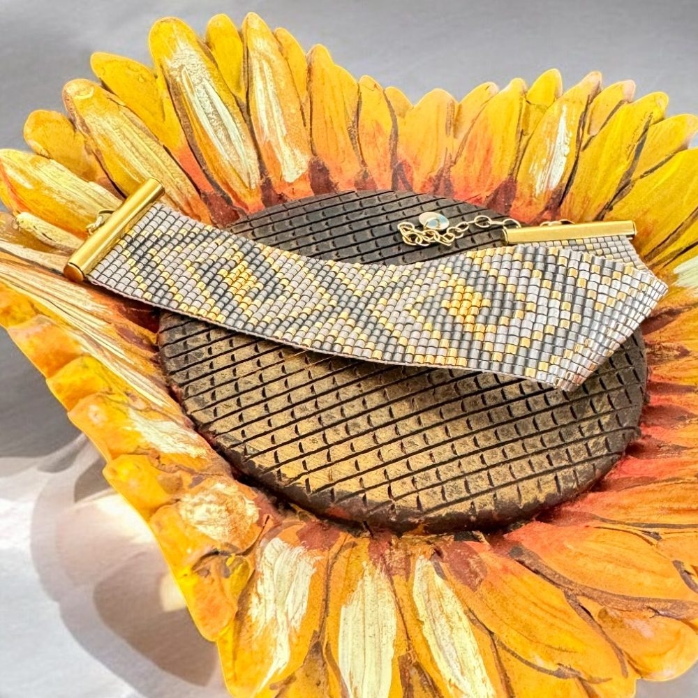 - **Materiale de inalta calitate**: margele Miyuki Delica 11/0 in culori vibrante, sarma de bijuterii Miyuki B Nylon de 0,25 mm intr-o nuanta de bej, terminatie tub placat PVD cu aur fin - Aur de 24K - 999/1000, lant prelungitor din alama cu charm marcat 1/20, umplut cu aur de 14K (gold filled)