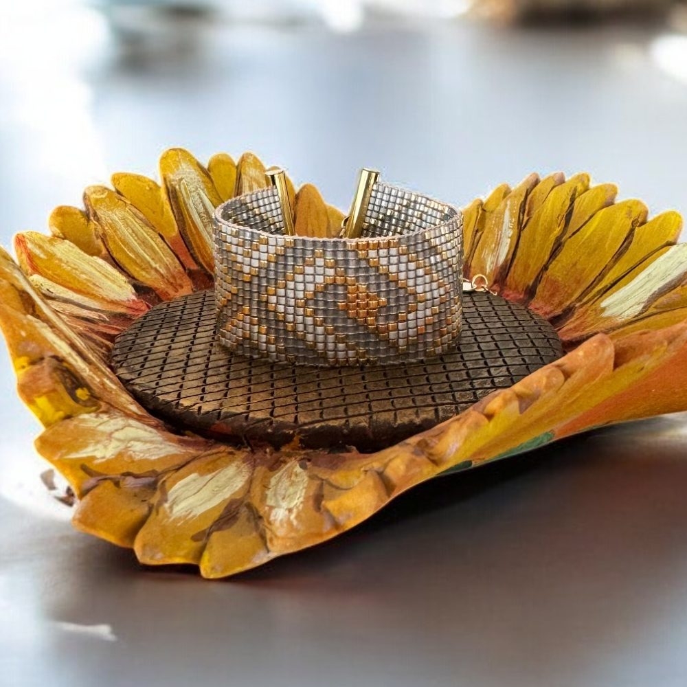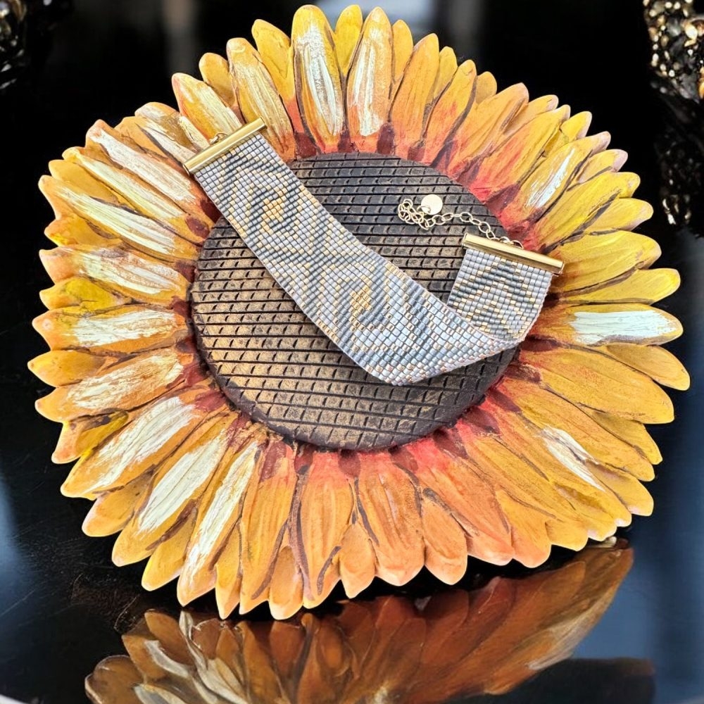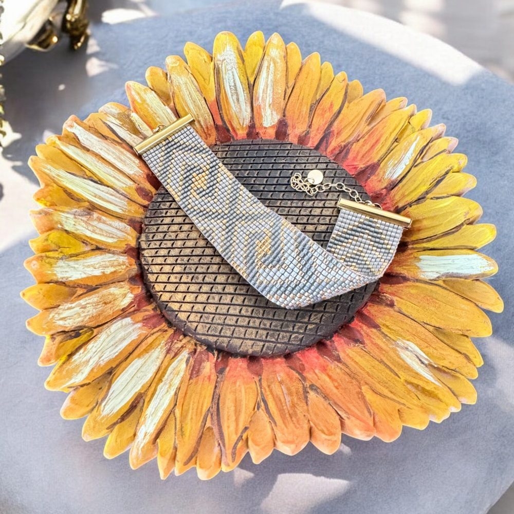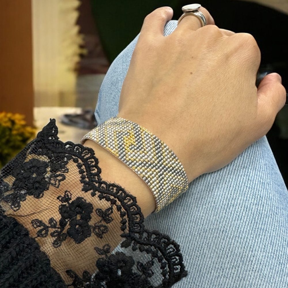 Adauga o nota de eleganta moderna tinutei tale cu bratara multistrat realizata manual din margele de nisip Miyuki. Designul sofisticat imbina tonurile de gri metalizat deschis si inchis cu accente aurii, creand un accesoriu versatil, perfect pentru orice ocazie.