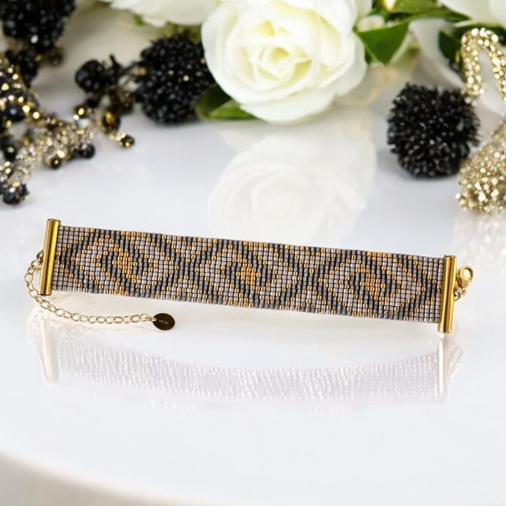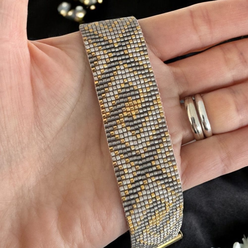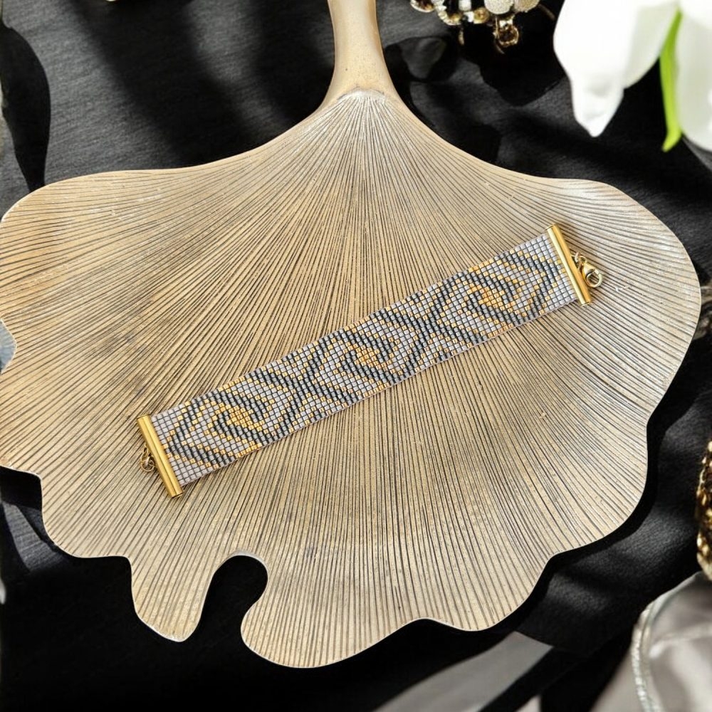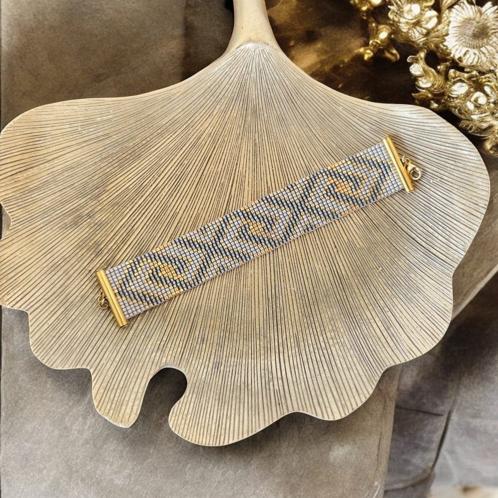 Bratara dama multistrat handmade – rafinament in tonuri de gri metalizat si auriu
