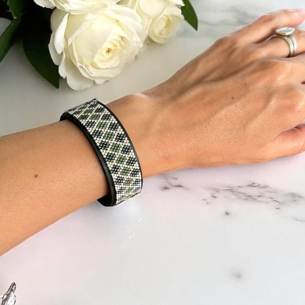 Bratara rigida Lira din margele miyuki in nuante de verde este un accesoriu deosebit, elegant si modern. Bratara cu margele de sticla este cusuta manual si aplicata pe un suport din piele naturala. Cu o lungime de 18 cm, aceasta bratara este potrivita atat pentru ocazii speciale, cat si pentru outfituri de zi cu zi. Combinatia dintre margelele verzi si argintii ofera un contrast subtil, dar plin de stil, ideal pentru iubitoarele de accesorii sofisticate.