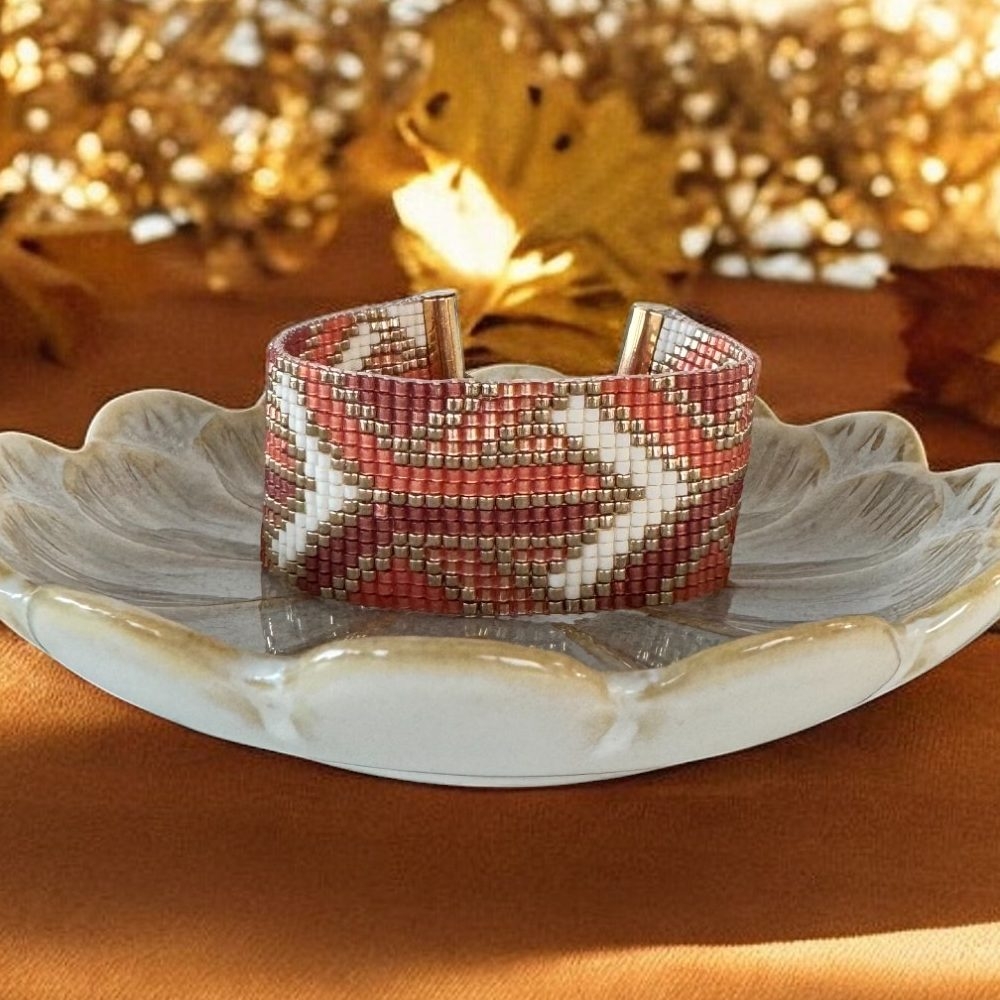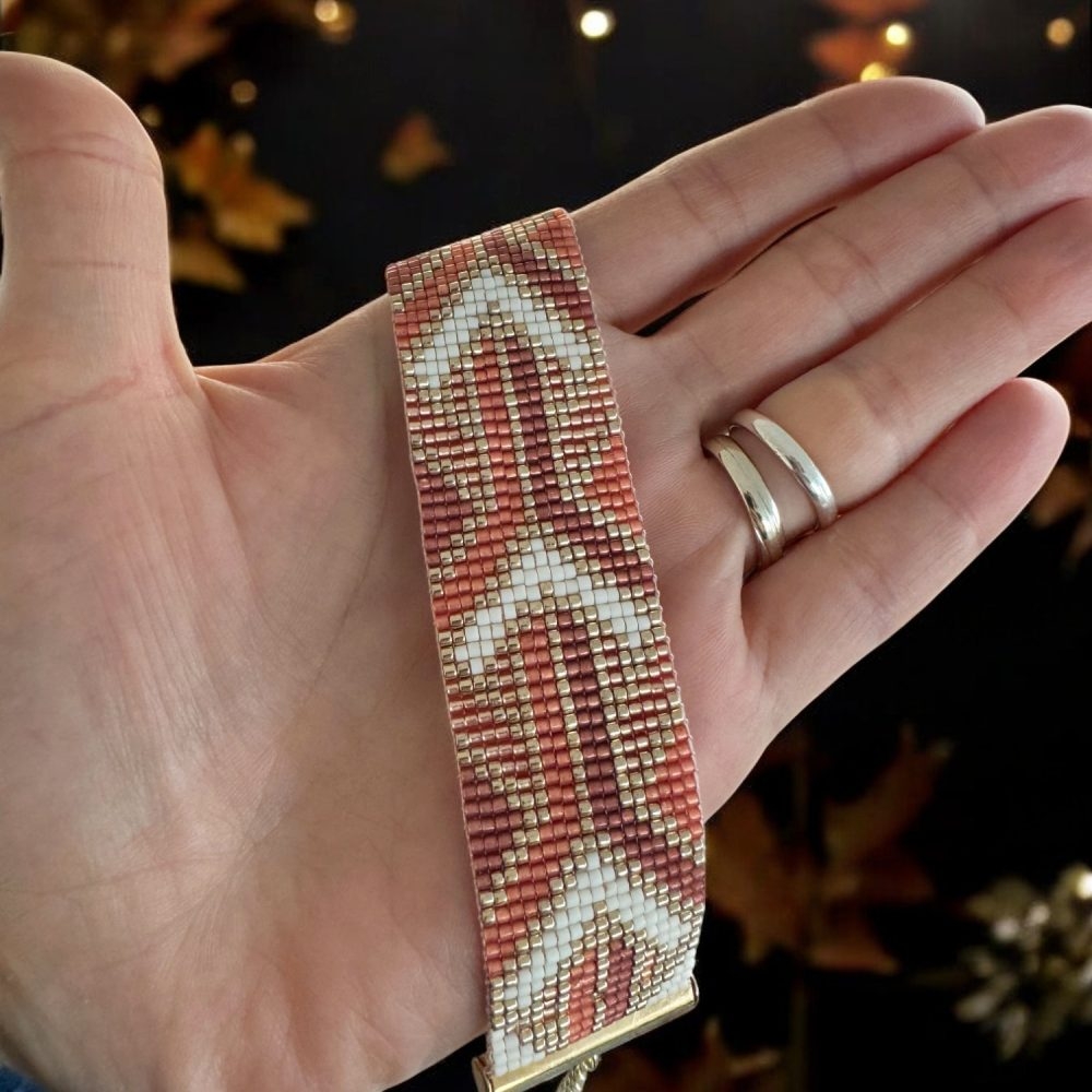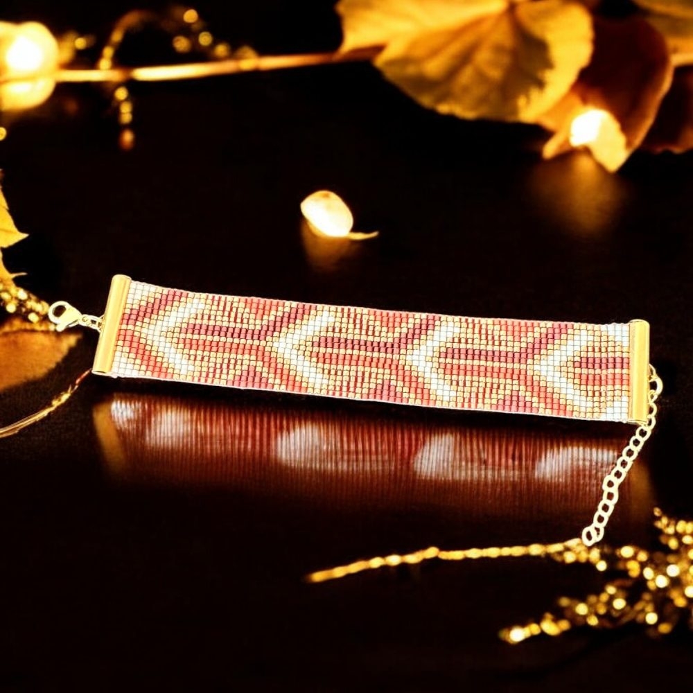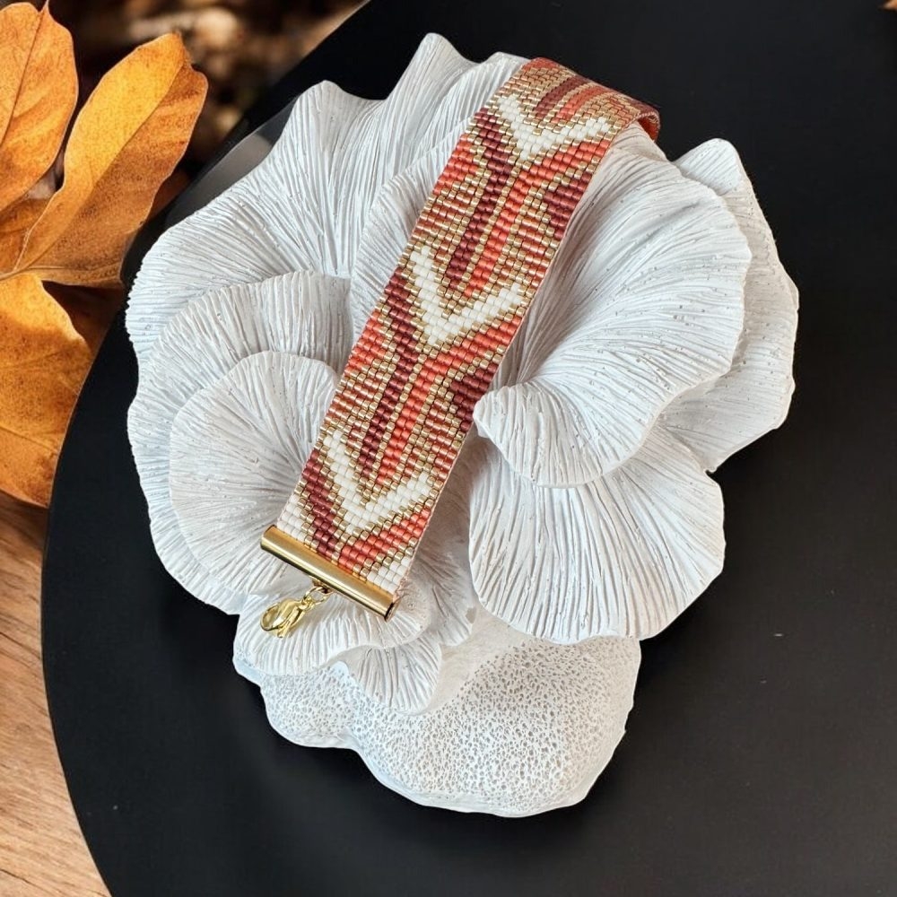Bratara dama handmade Lamia – eleganta lucrata manual in nuante calde de portocaliu si auriu