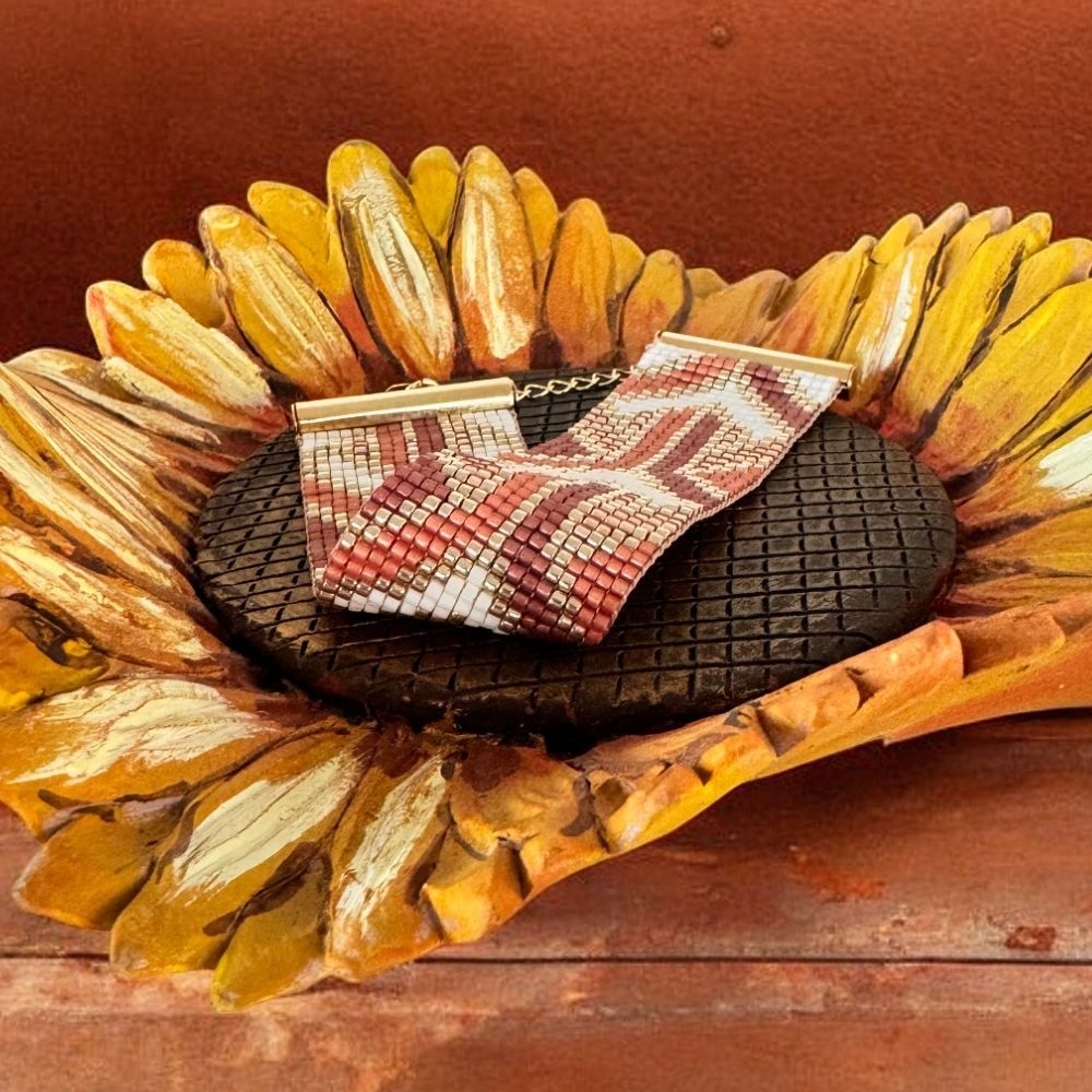 Bratara Lamia este mai mult decat un simplu accesoriu – este o expresie a feminitatii si a pasiunii pentru detalii. Realizata cu migala din margele Miyuki de inalta calitate, bratara impresioneaza prin combinatia vibranta de portocaliu si auriu, evocand energia si caldura apusului.