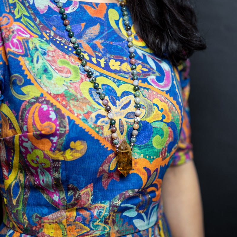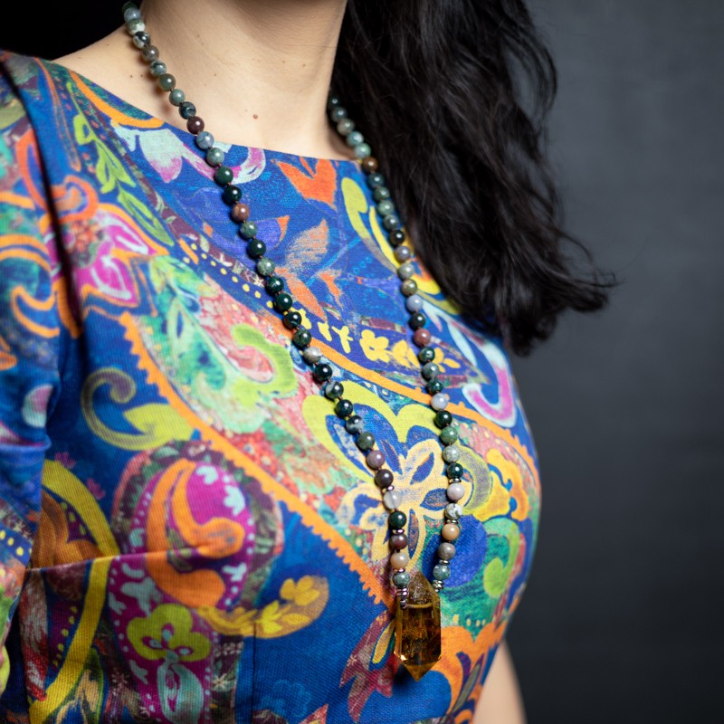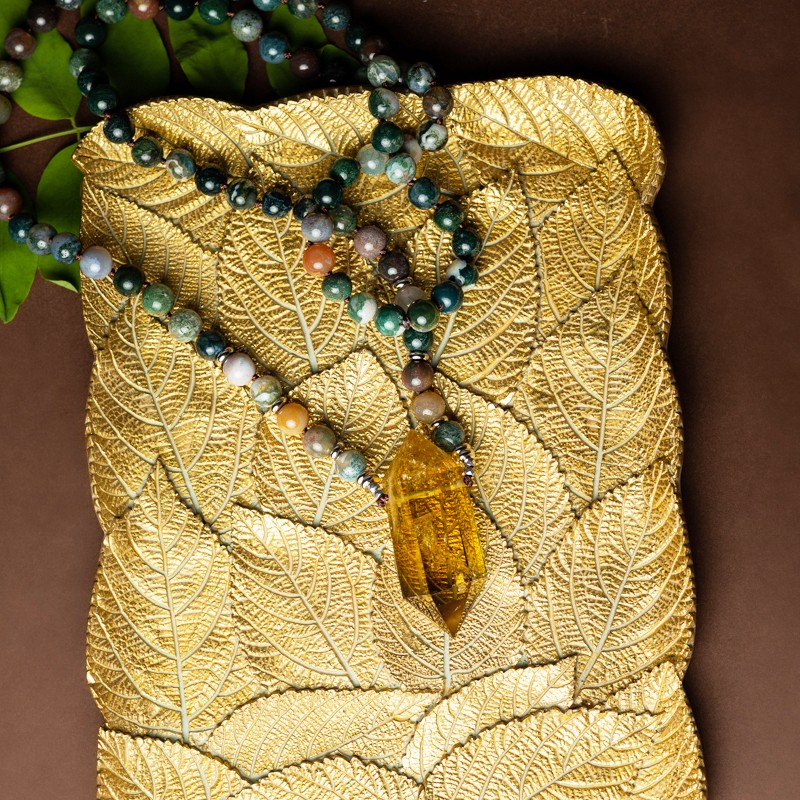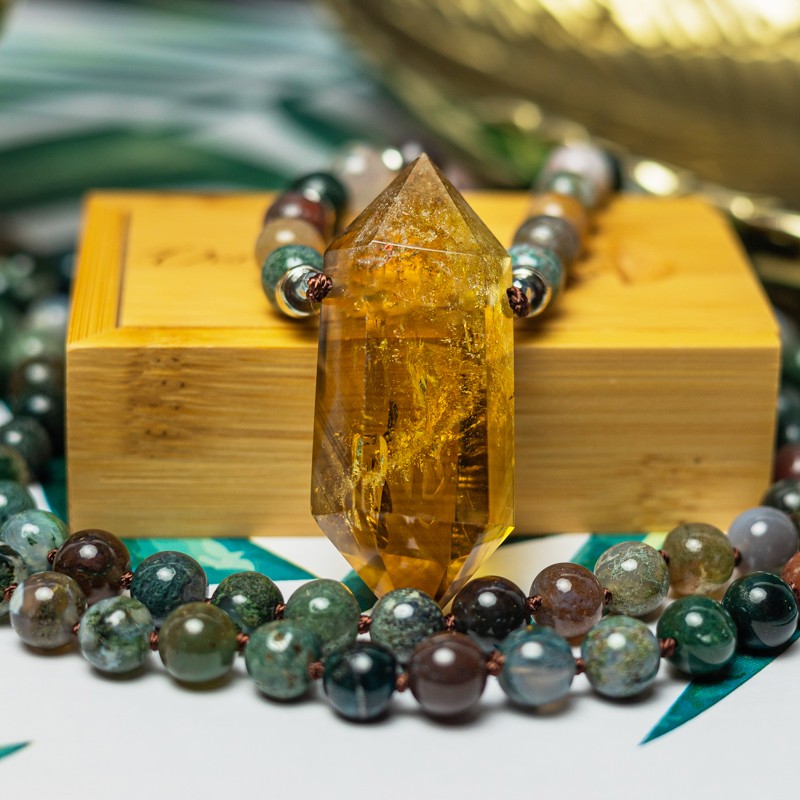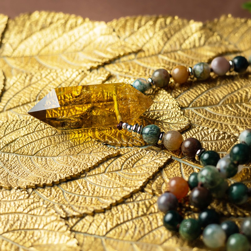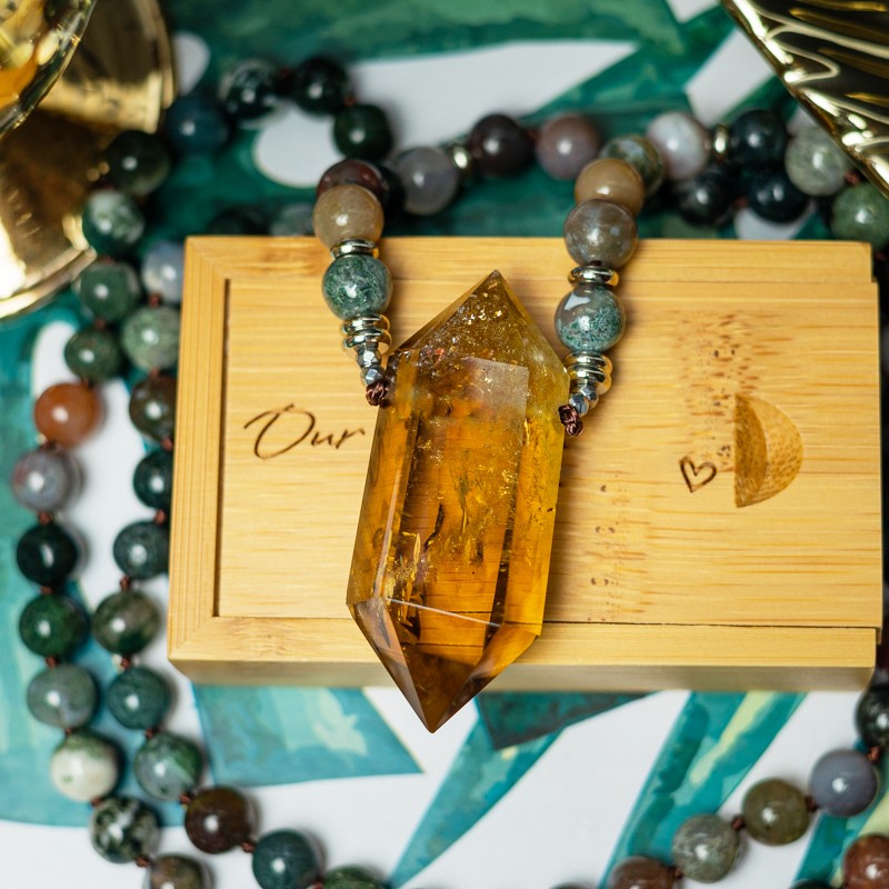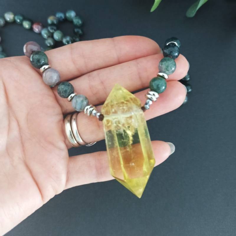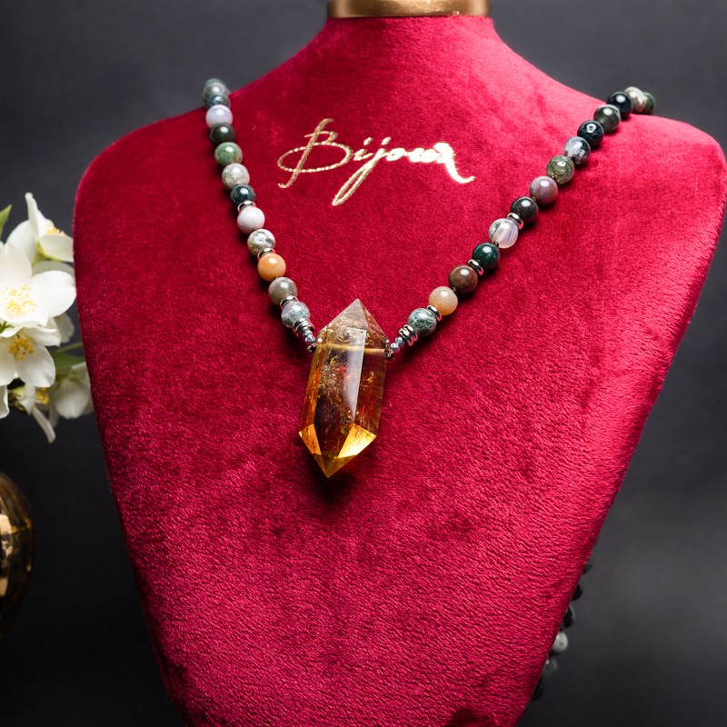 Colierul Alisha are ca pandantiv un cristal mare de citrin cu dubla terminatie.