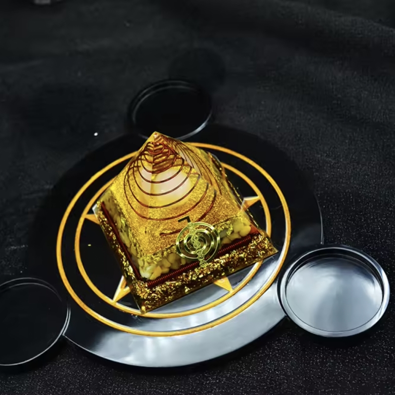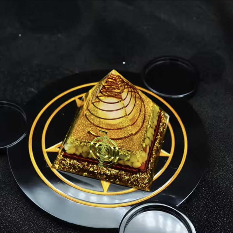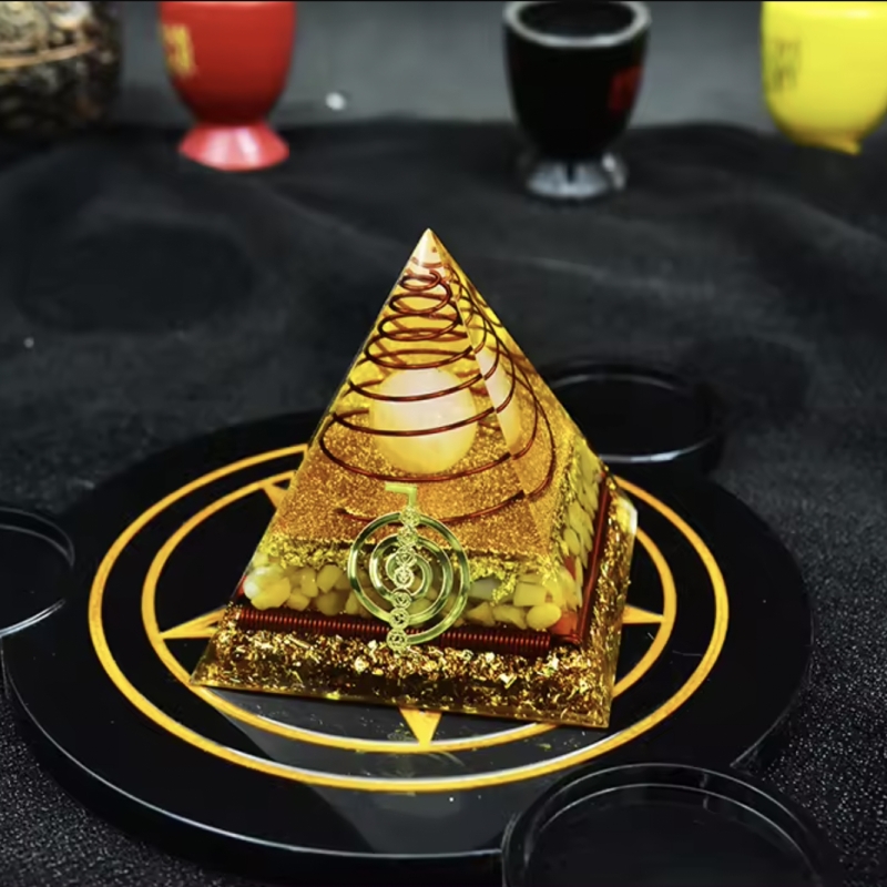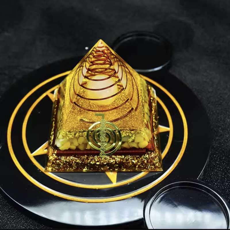 Te invit sa alegi puterea si armonia piramidei orgonice energetice Nidhi cu cristale de jad galben si sfera de cuart, intr-un design ce include simbolul Reiki Cho Ku Rei si spirala de cupru! Aceasta minunata creatie este mai mult decat o simpla piesa de decor - este un instrument pentru meditatie si echilibru energetic, conceput pentru a-ti sprijini calatoria spre bunastare si abundenta.
