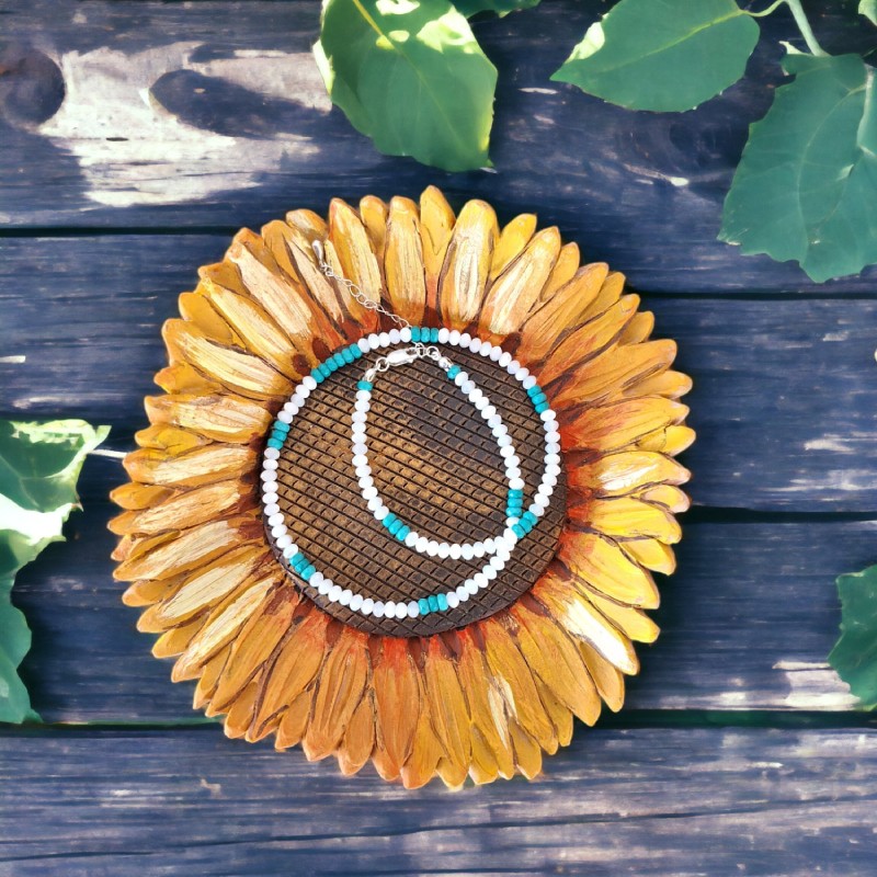 Priveste frumusetea captivanta a colierului choker Casandra, o bijuterie care imbina farmecul sidefului de perla si frumusetea senina a margelelor turcoaz. Acest colier este o simfonie poetica, un contrast linistitor care evoca viziuni despre cer senin si mare turcoaz. Aceste margele, ca niste fragmente de cer, aduc un sentiment de calm si echilibru. Tonurile lor blande de azur creeaza un duet armonios cu irizatiile sidefului de perla.