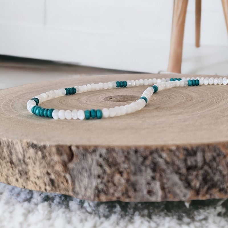 Fie ca alegi sa-l porti pentru latura sa estetica, pentru energia senina a turcoazului sau pur si simplu ca o emblema personala a afinitatii tale cu, comorile naturii, acest colier choker din sidef de perla si turcoaz va deveni o piesa pretuita in colectia ta.