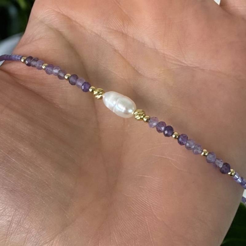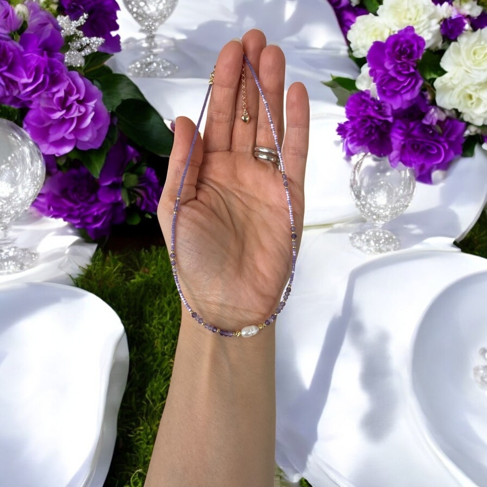 Colier choker Elina din margele Miyuki mov cu cristale de Ametist si argint placat cu aur 925