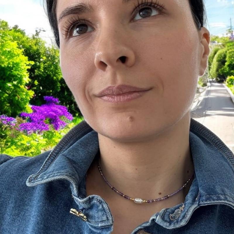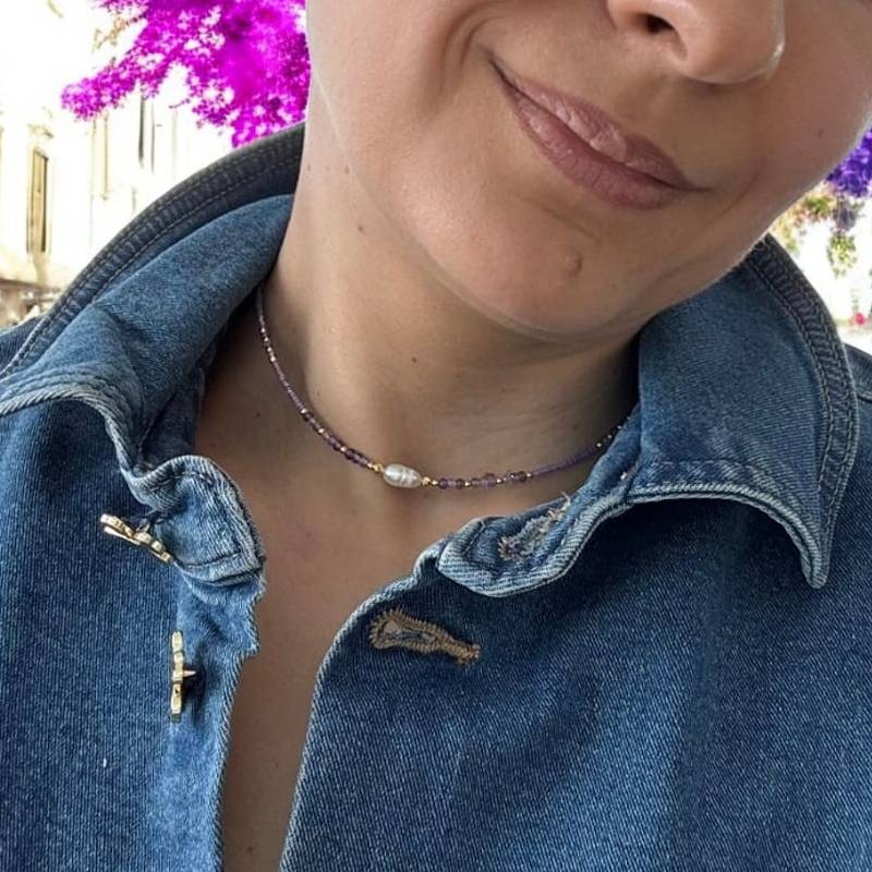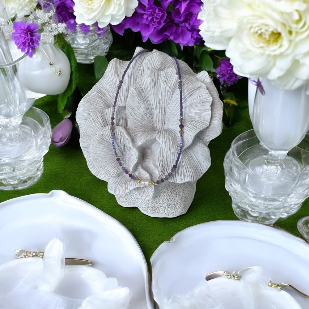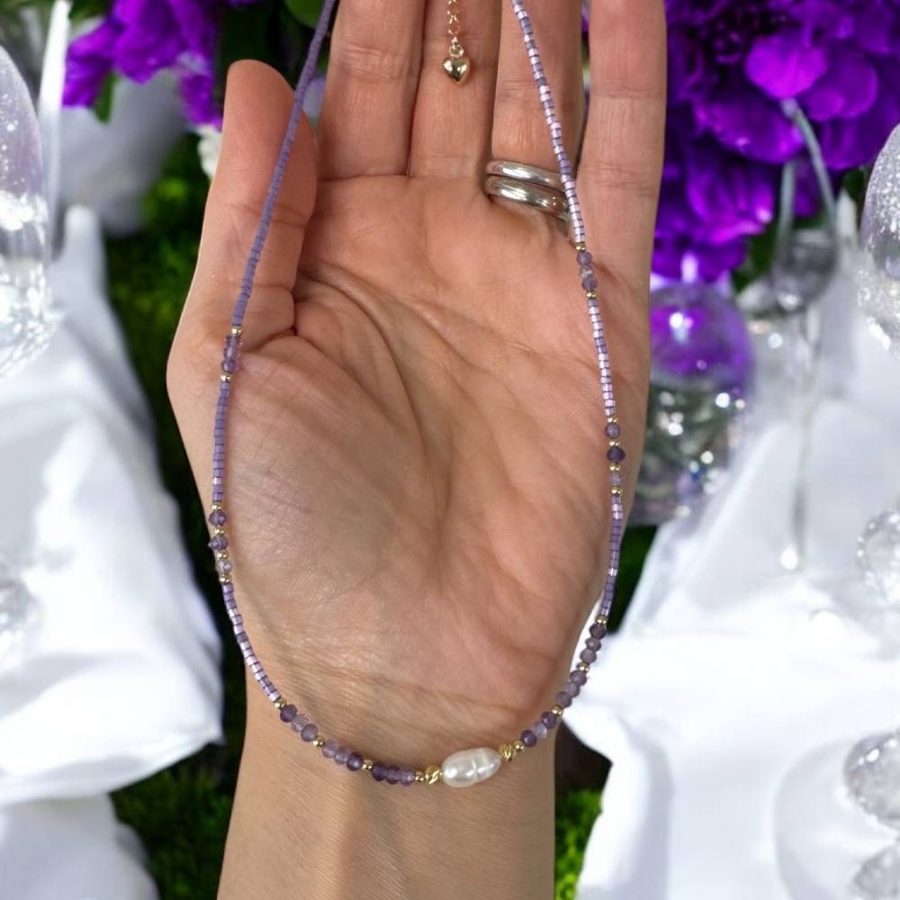 Colierul choker Elina este un accesoriu handmade, realizat din miyuki mov si cristale naturale de Ametist. Acest colier de dama la baza gatului iti va infrumuseta zilele insorite de vara.