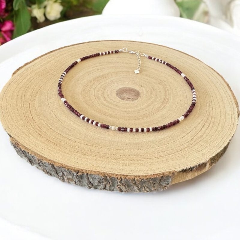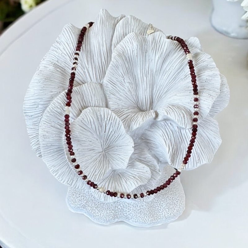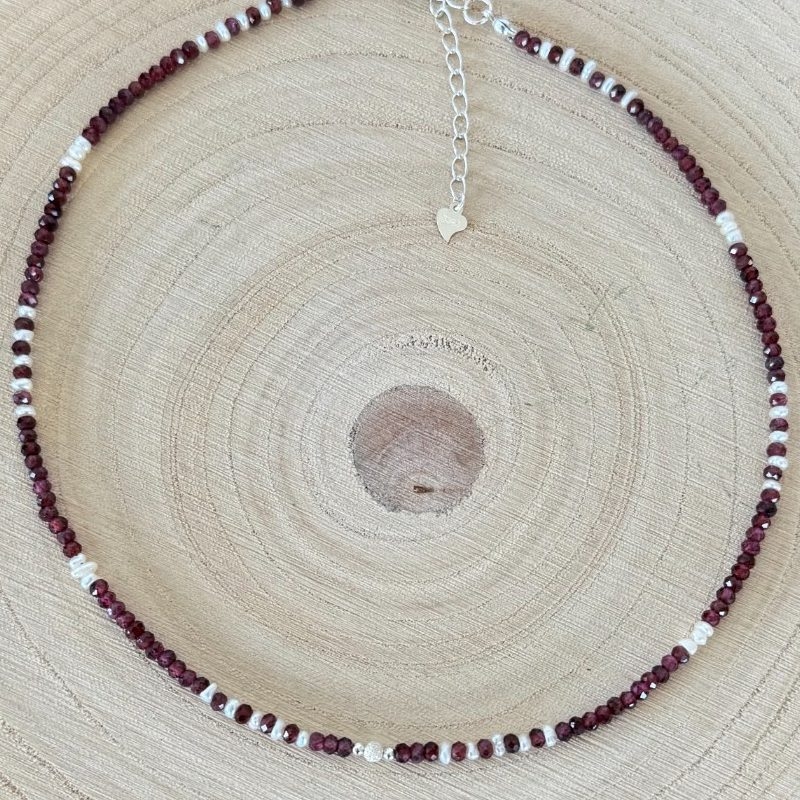 Am folosit mici perle de cultura pentru a adauga o nota clasica si feminina colierului. Perlele creeaza un contrast delicat si sofisticat cu granatul. Perlele simbolizeaza puritatea si intelepciunea, iar combinatia lor cu granatul face din acest colier o piesa versatila, potrivita atat pentru evenimente speciale, cat si pentru a-ti innobila tinutele de zi cu zi.