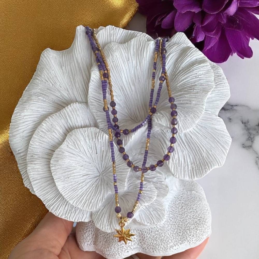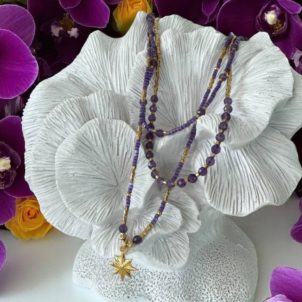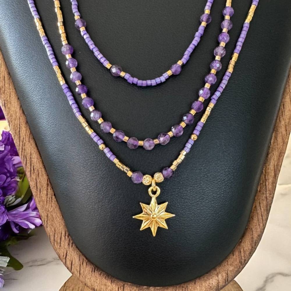 Am realizat acest colier minunat pentru o clienta draga mie. Combinatia ametist si margele Miyuki mov cu argint placat cu aur a fost atat de reusita incat am decis sa-l postez si in micul meu magazin. Consider ca este alegerea perfecta pentru o tinuta deosebita. Colierul cu 3 straturi va fi cu siguranta un accesoriu distinctiv ce capteaza atentia. Pandantivul in forma de Steaua Nordului completeaza designul, simbolizand ghidajul si protectia.