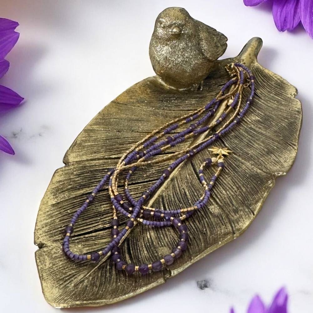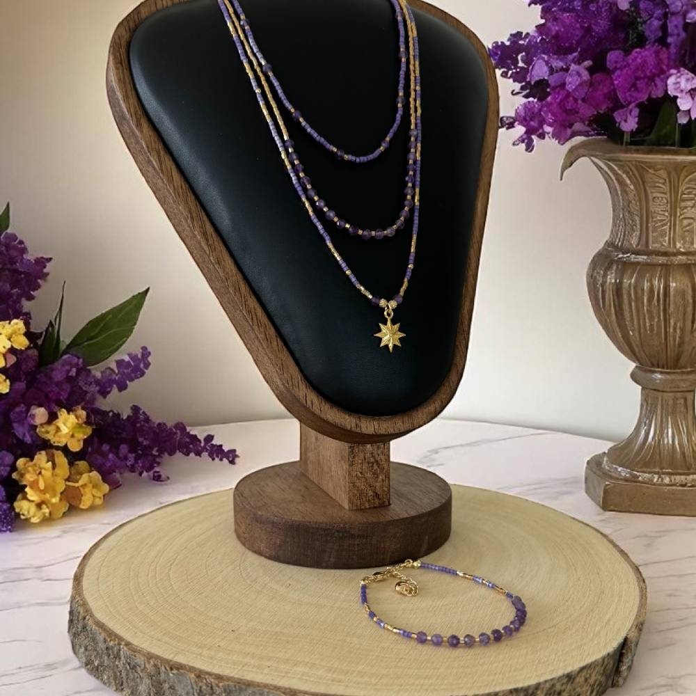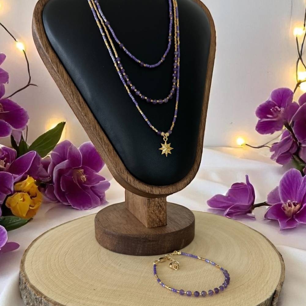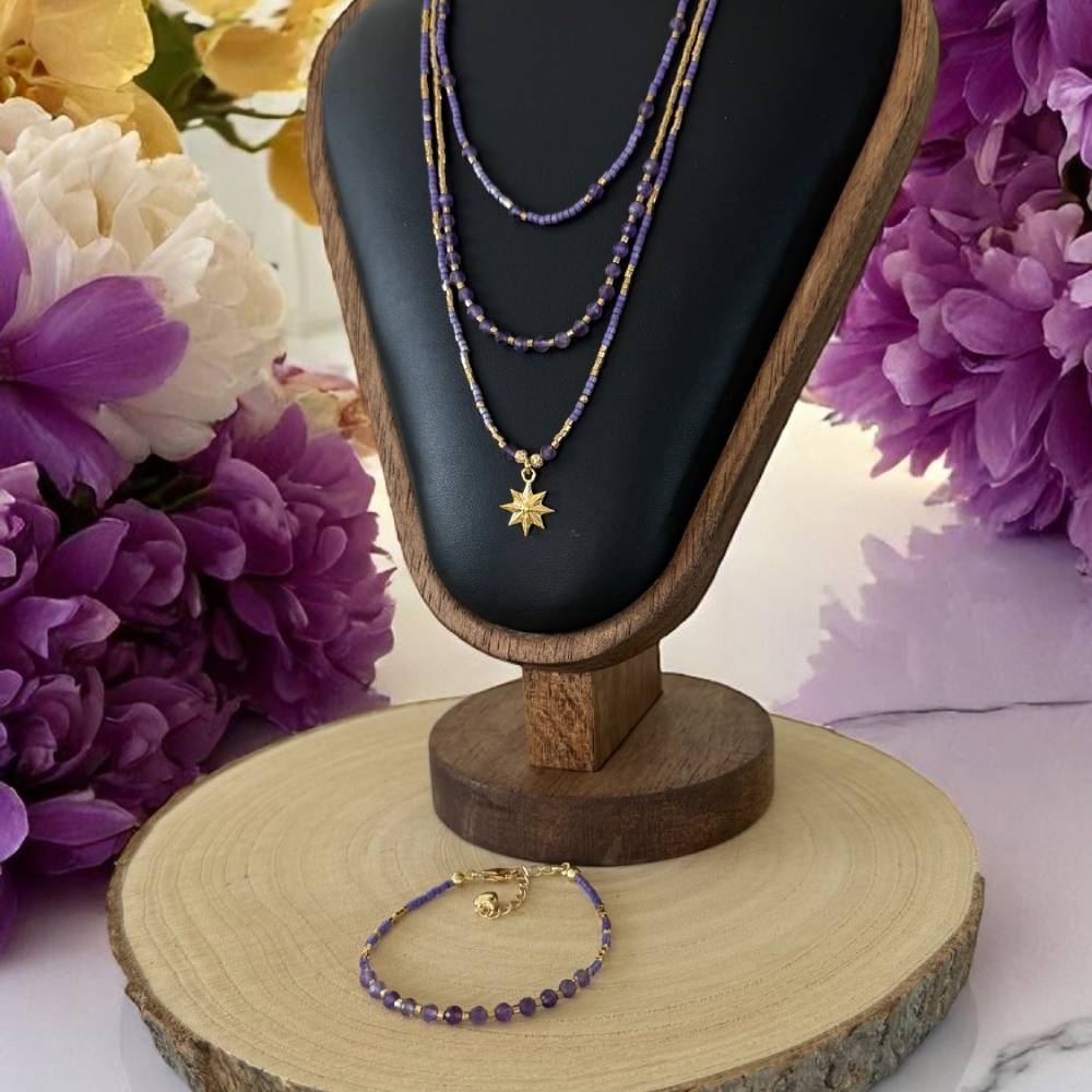 Am realizat acest colier minunat pentru o clienta draga mie. Combinatia ametist si margele Miyuki mov cu argint placat cu aur a fost atat de reusita incat am decis sa-l postez si in micul meu magazin. Consider ca este alegerea perfecta pentru o tinuta deosebita. Colierul cu 3 straturi va fi cu siguranta un accesoriu distinctiv ce capteaza atentia. Pandantivul in forma de Steaua Nordului completeaza designul, simbolizand ghidajul si protectia.