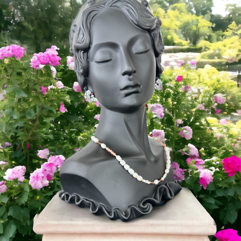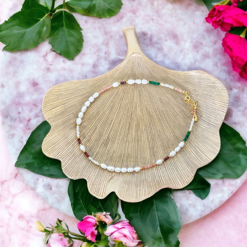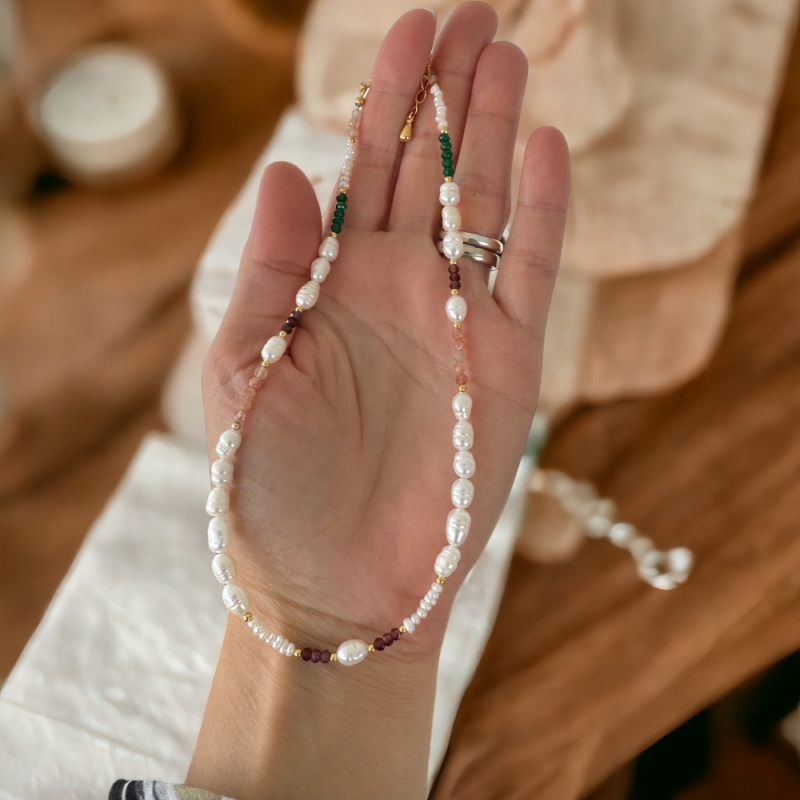 Acest colier deosebit combina frumusetea perlelor cu eleganta pietrelor semipretioase, fiind ideal pentru orice ocazie speciala din viata ta.