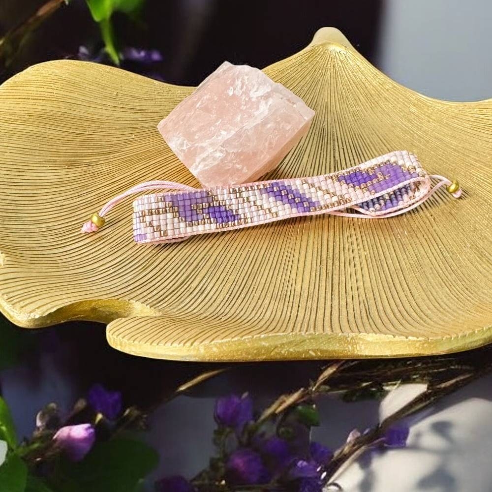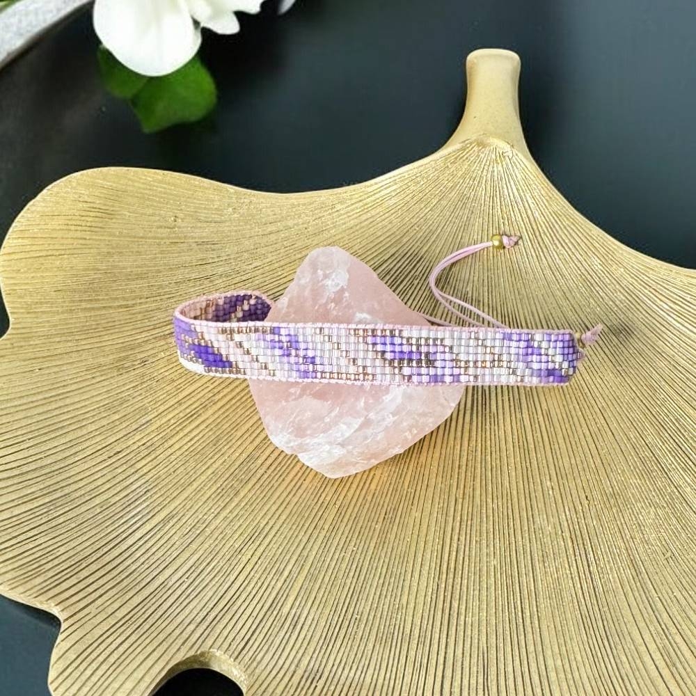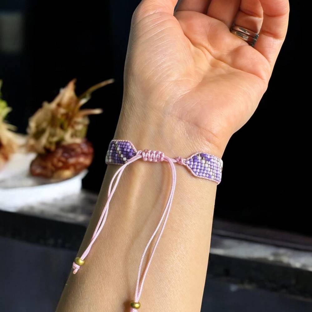 Bratara snur pentru femei Nour, realizata manual din margele Miyuki in nuante de mov si roz pal, este alegerea perfecta pentru un look rafinat si modern. Fiecare margea este atent aleasa si impletita cu maiestrie pentru a crea un accesoriu unic, deosebit.