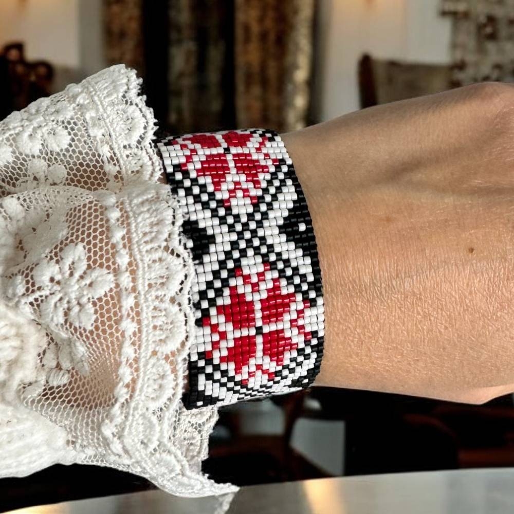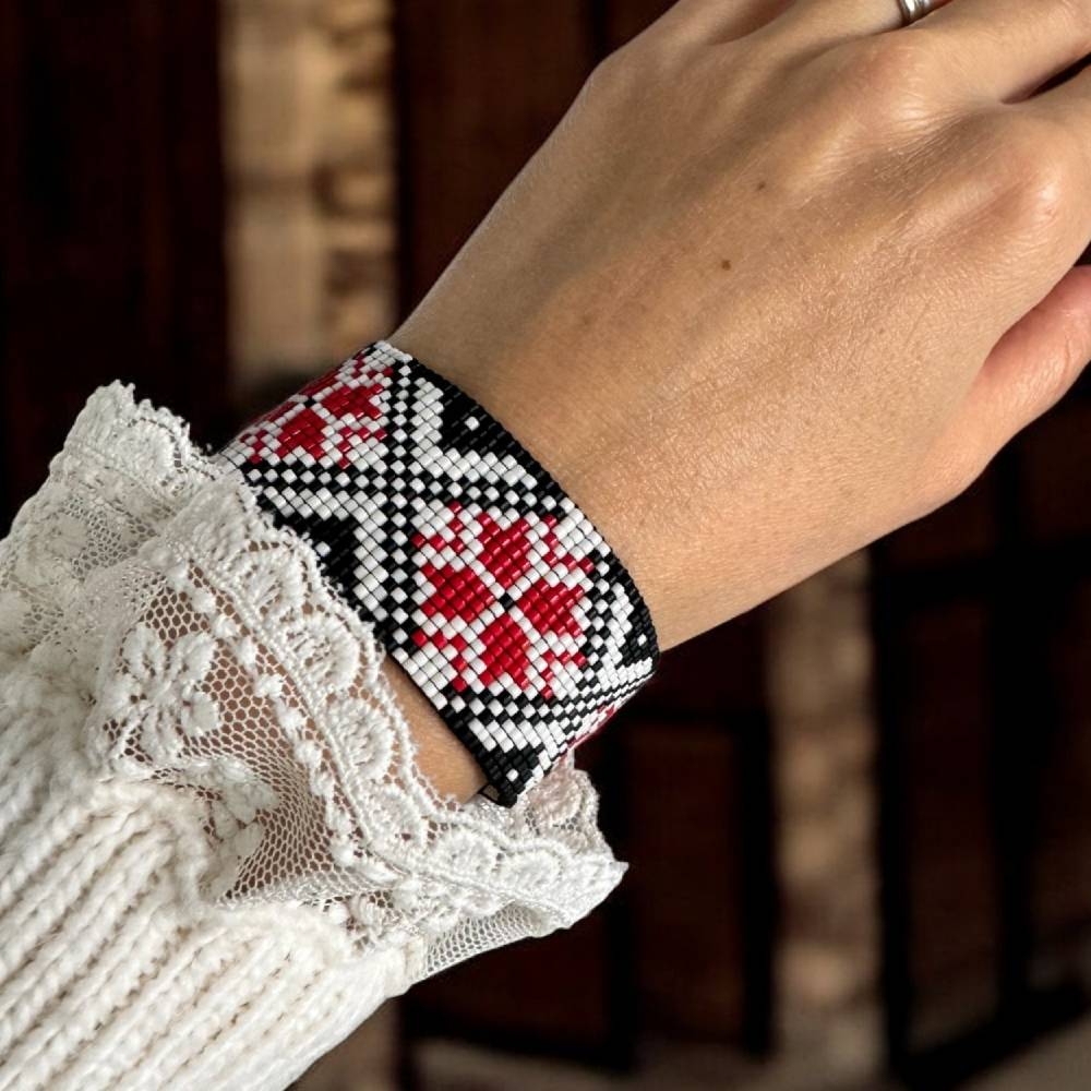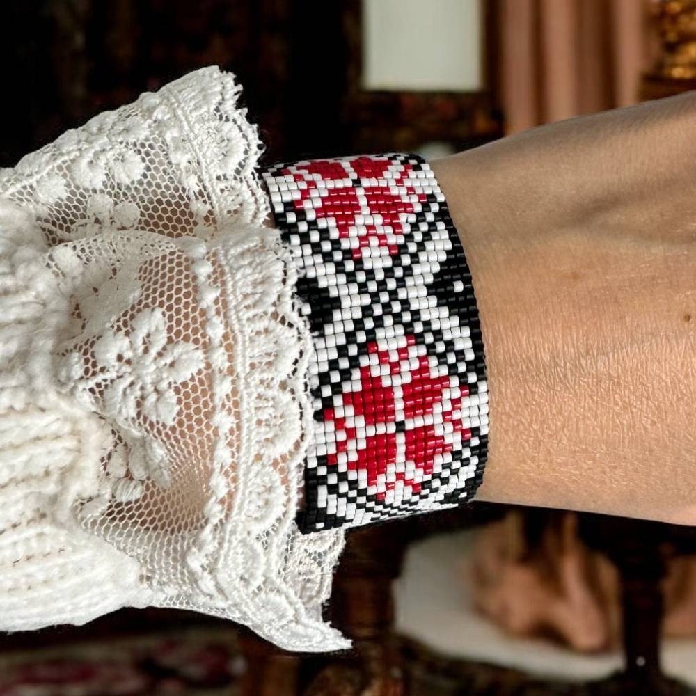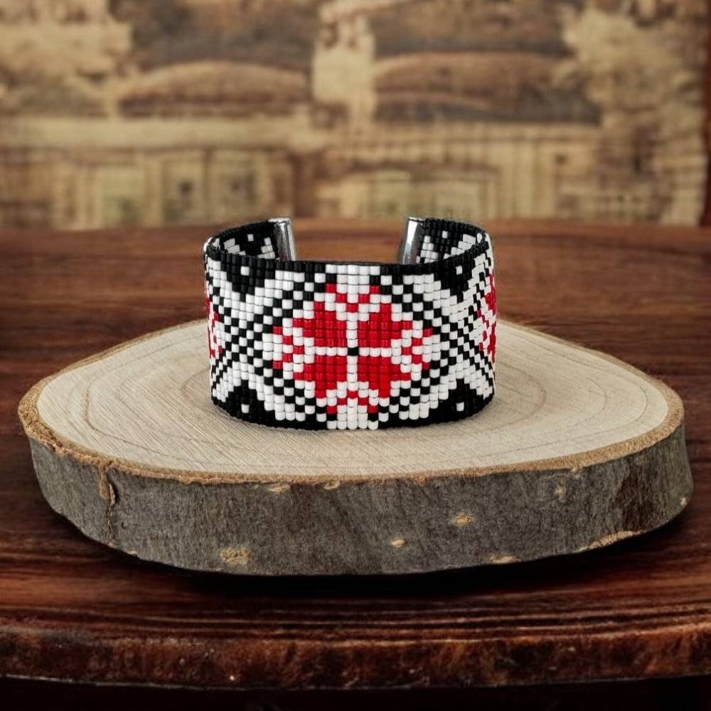 Bratara lata impletita manual cu margele Miyuki, un omagiu adus frumusetii traditiei romanesti si simbolurilor autentice ale iei nationale. Fiecare margea este atent asezata pentru a crea un model unic, inspirat de cusaturile traditionale care au impodobit straiele romanilor de-a lungul veacurilor.
