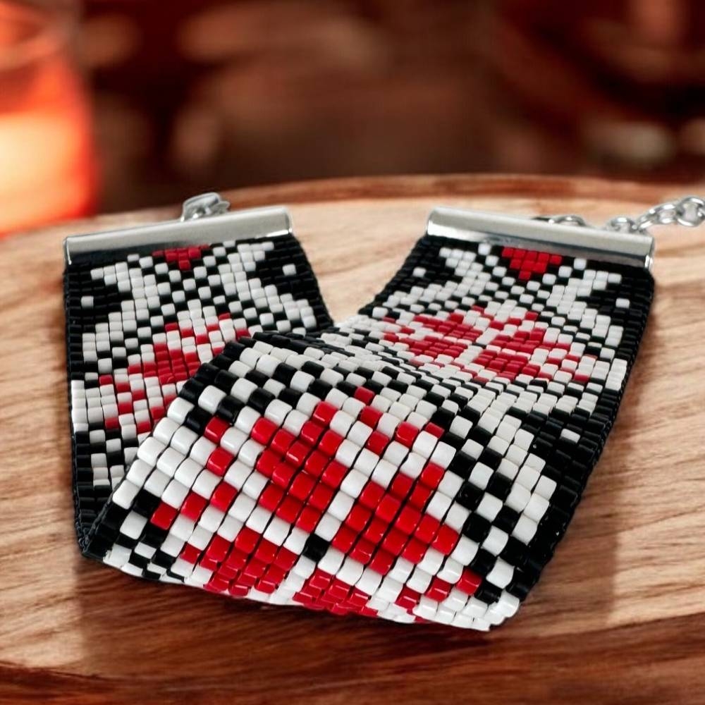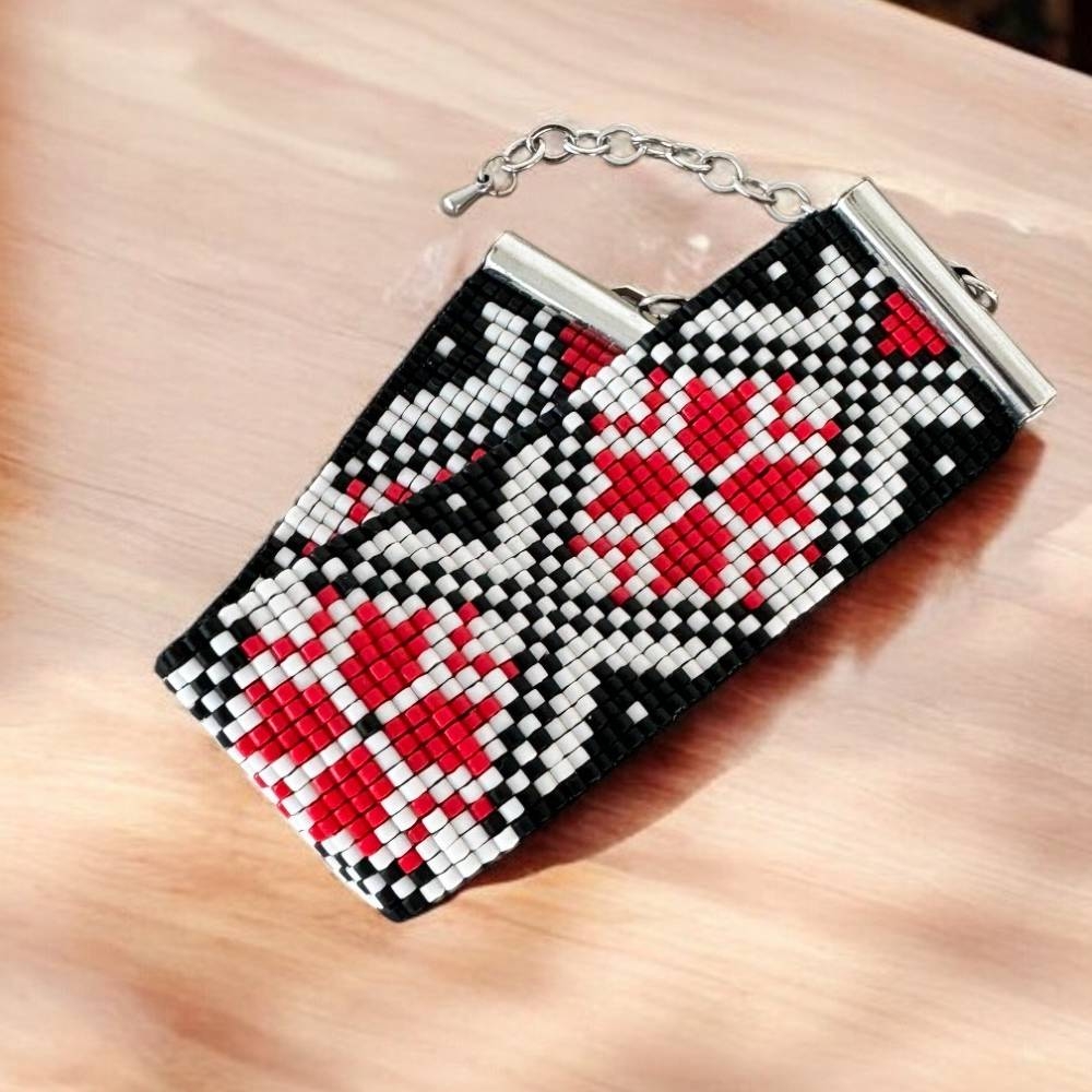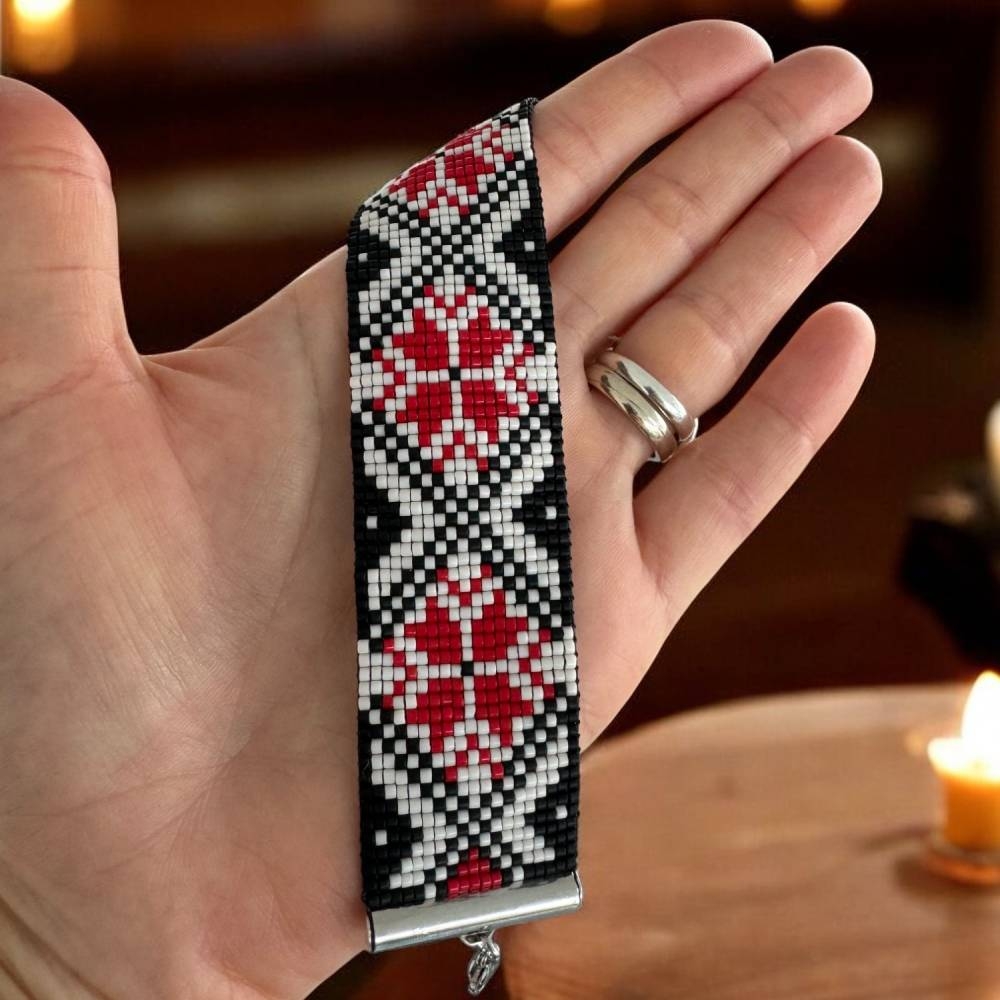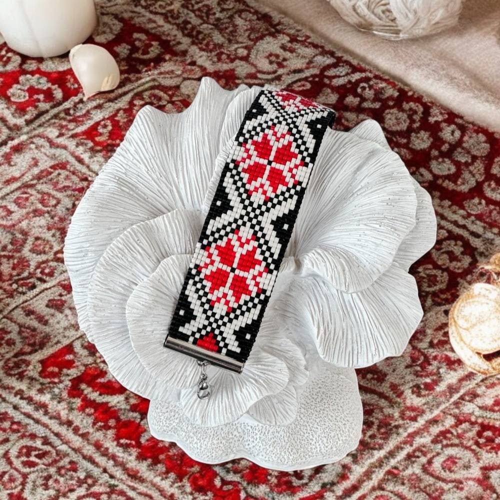 Bratara lata impletita manual cu margele Miyuki, un omagiu adus frumusetii traditiei romanesti si simbolurilor autentice ale iei nationale. Fiecare margea este atent asezata pentru a crea un model unic, inspirat de cusaturile traditionale care au impodobit straiele romanilor de-a lungul veacurilor.