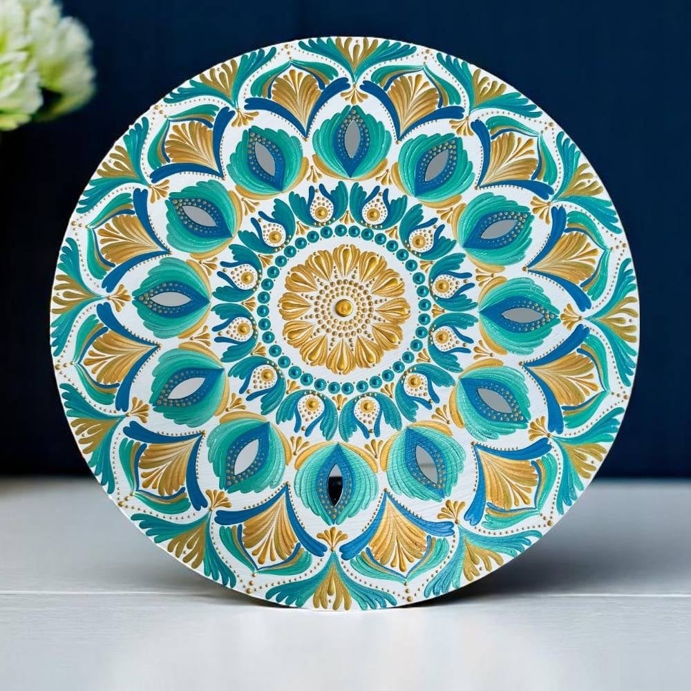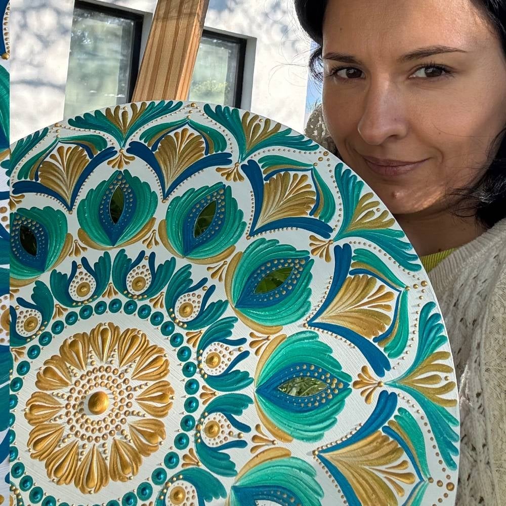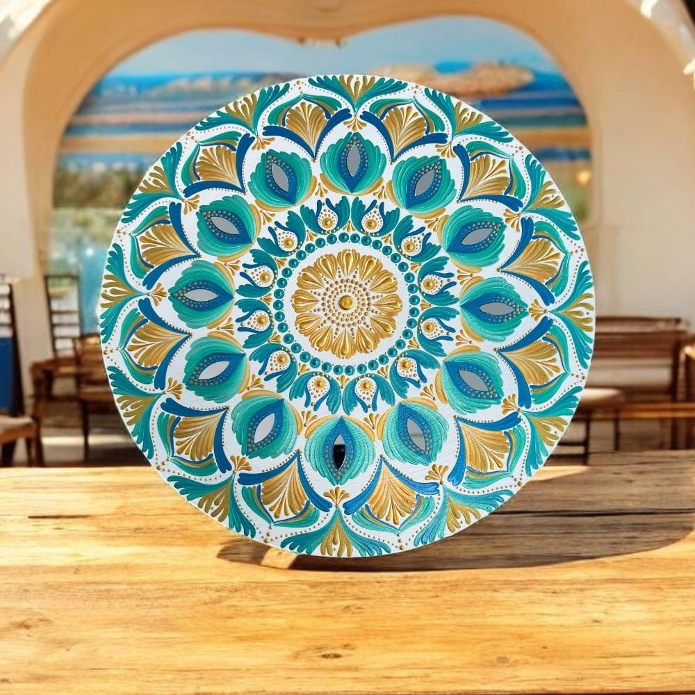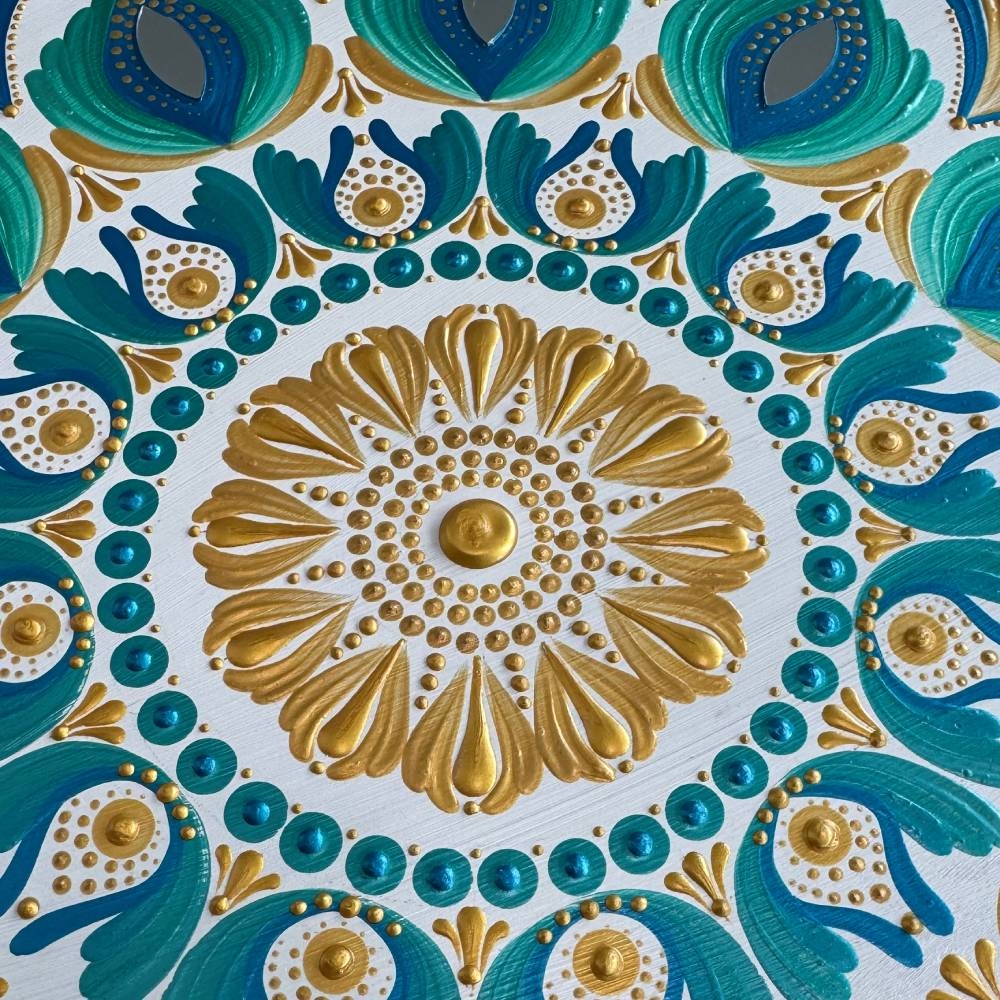 Pentru iubitoarele culorilor auriu si turcoaz, va invit sa adaugati un strop de vara in casa voastra cu tabloul unicat *Cu gandul la vacanta*. Pictat manual, acest tablou mandala aduce in prim-plan culorile soarelui, apei si energiei bune. Fiecare model este unic, iar acest tablou de 40 cm va adauga lumina si energie pozitiva in orice incapere vei decide sa-l pui. Nu voi crea doua modele identice, asa ca acest tablou va fi cu adevarat al tau.