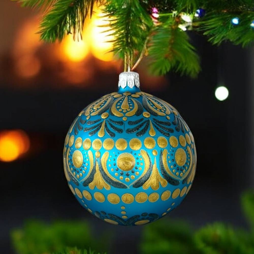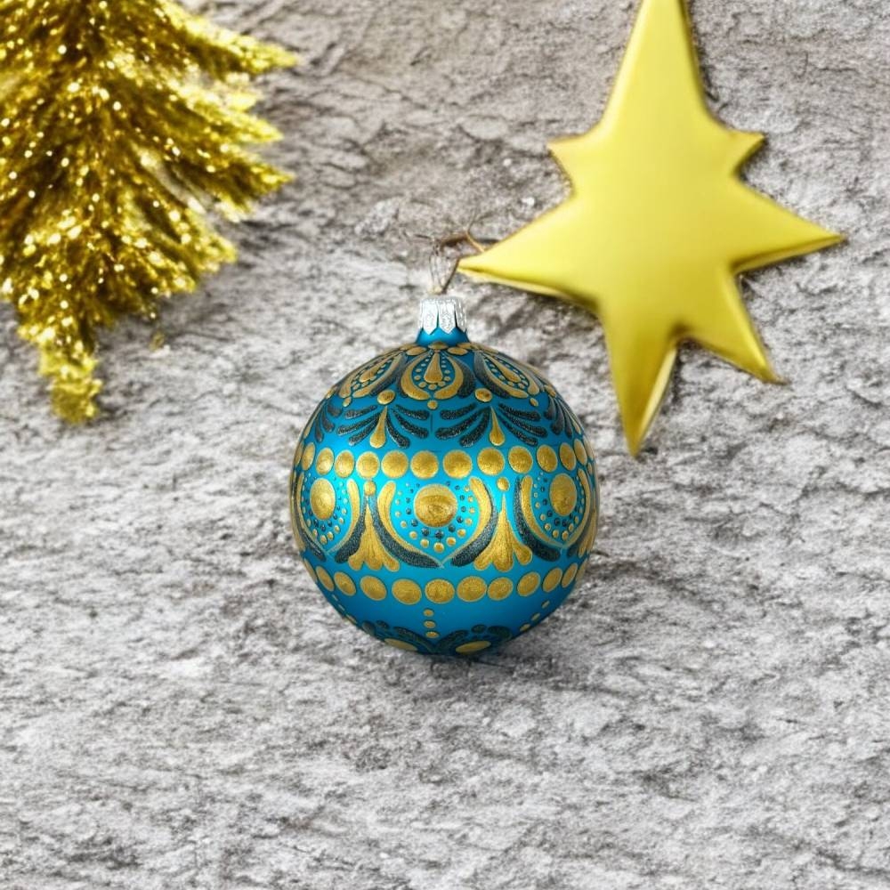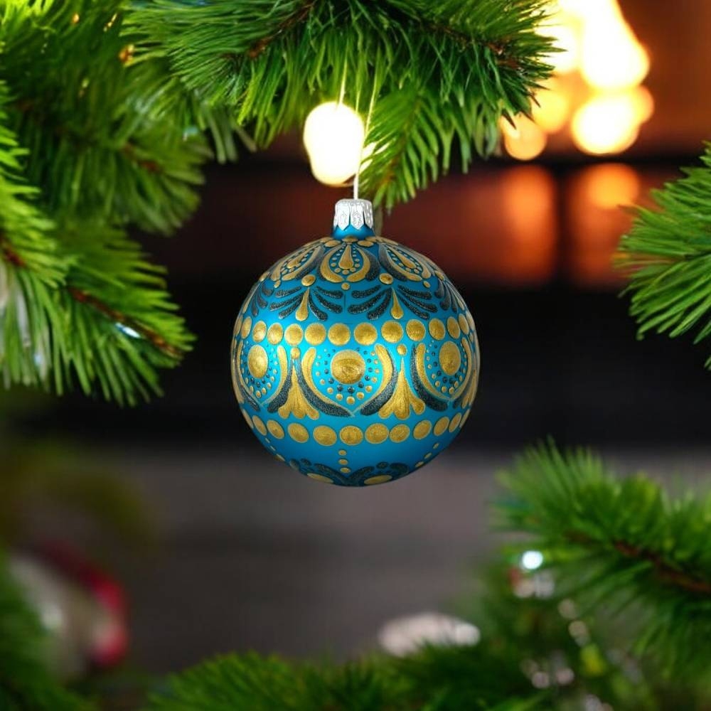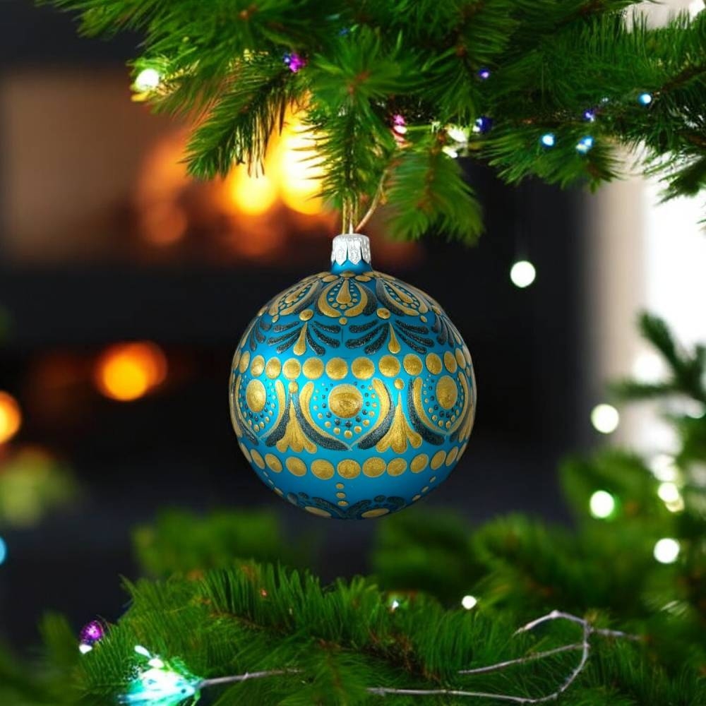 Adaugati un strop de magie si unicitate bradului de Craciun cu acest glob de sticla pictat manual. Modelul mandala, realizat cu migala, transforma acest ornament intr-o decoratiune deosebita. Fiecare detaliu este lucrat cu atentie, astfel incat fiecare glob este unic, perfect pentru a aduce caldura si eleganta sarbatorilor voastre.