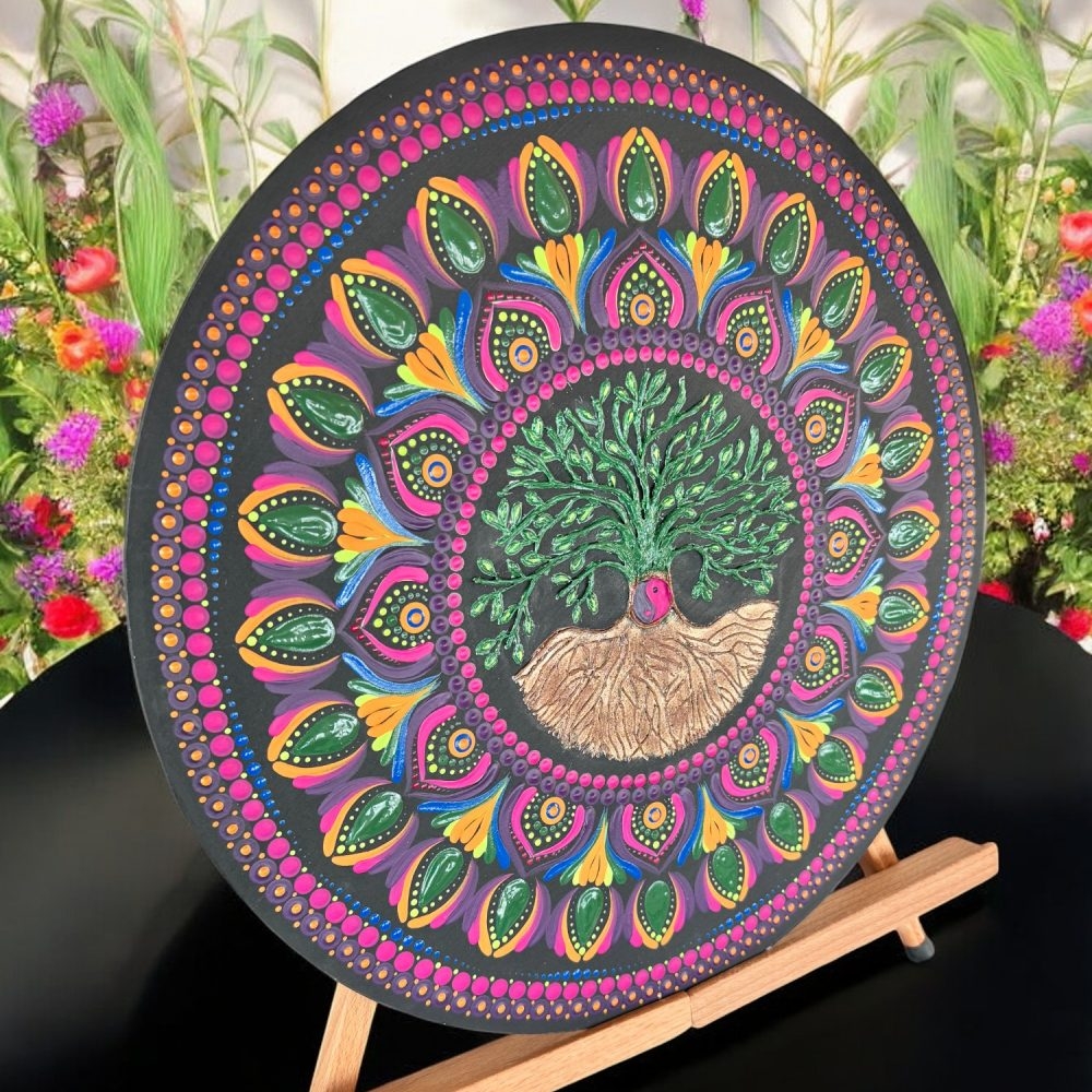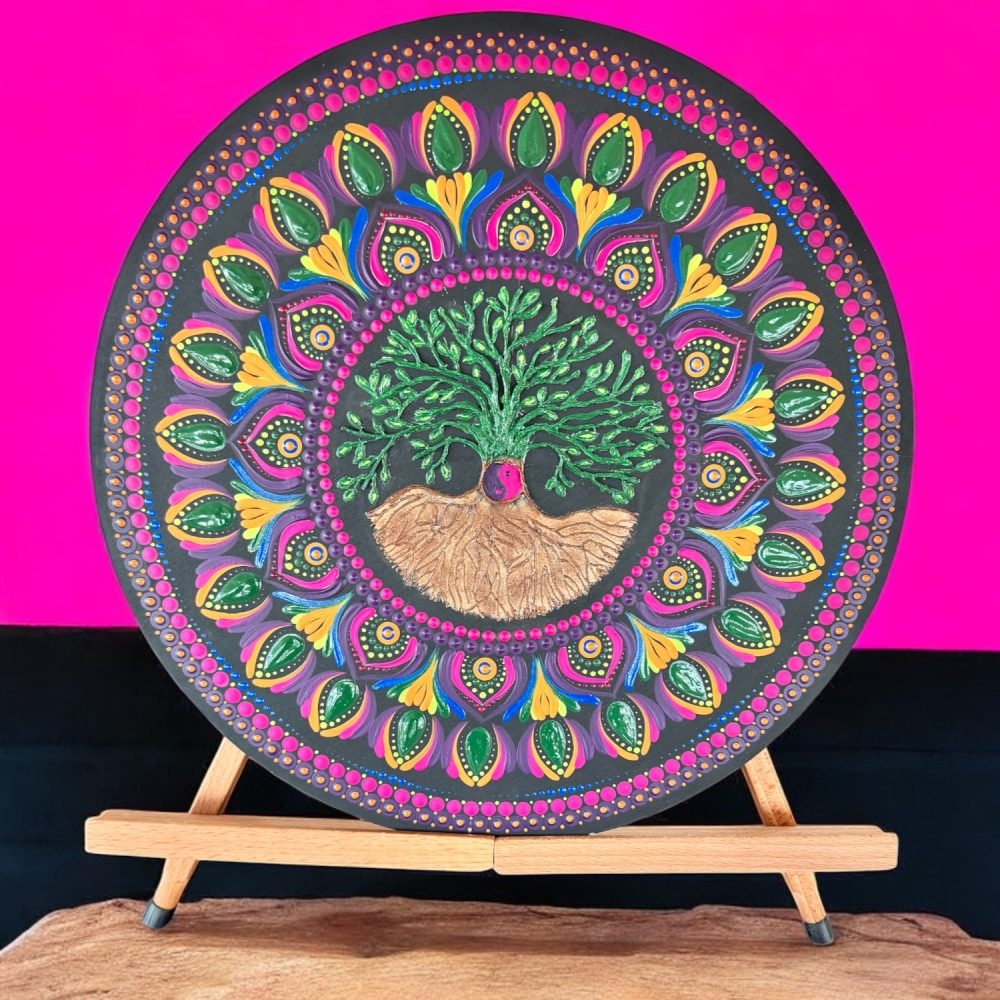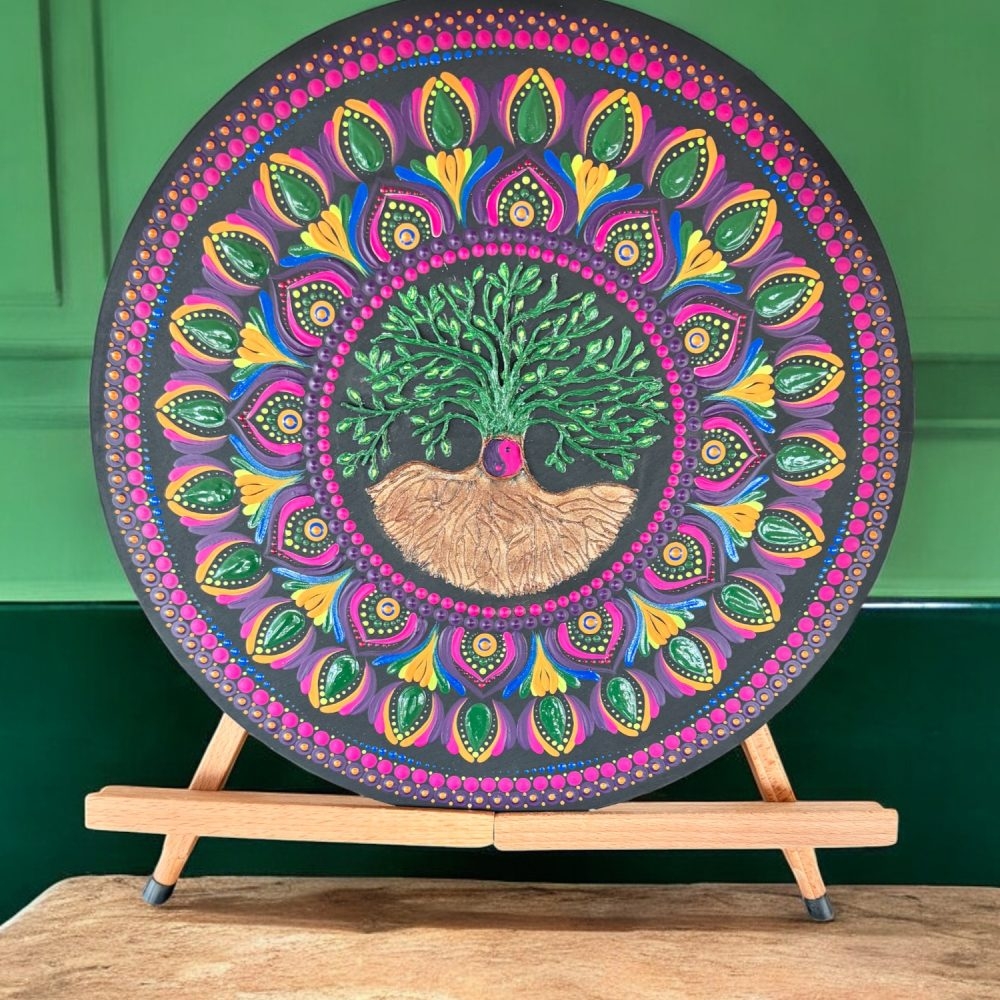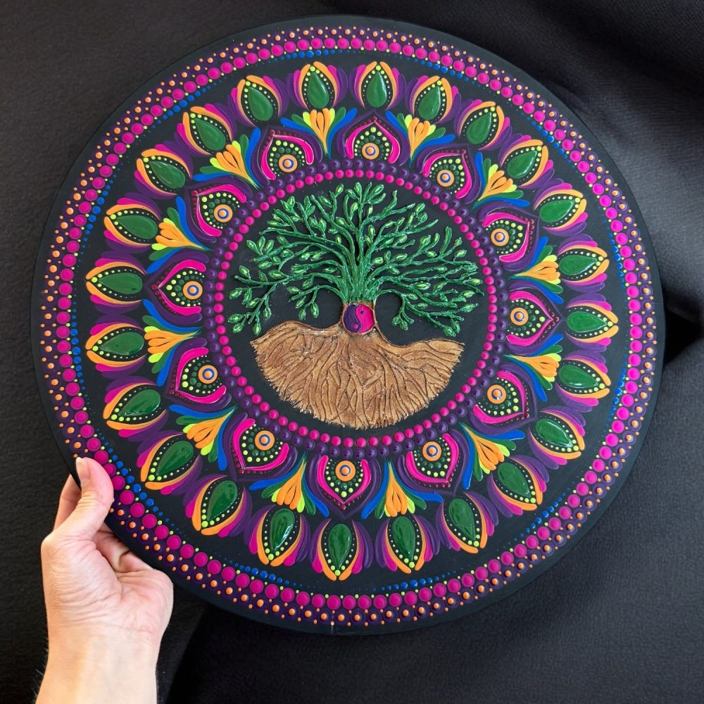 Aceasta mandala pictata manual are in centru simbolul puternic al Copacului Vietii, un semn al intelepciunii si al legaturii noastre cu natura.
