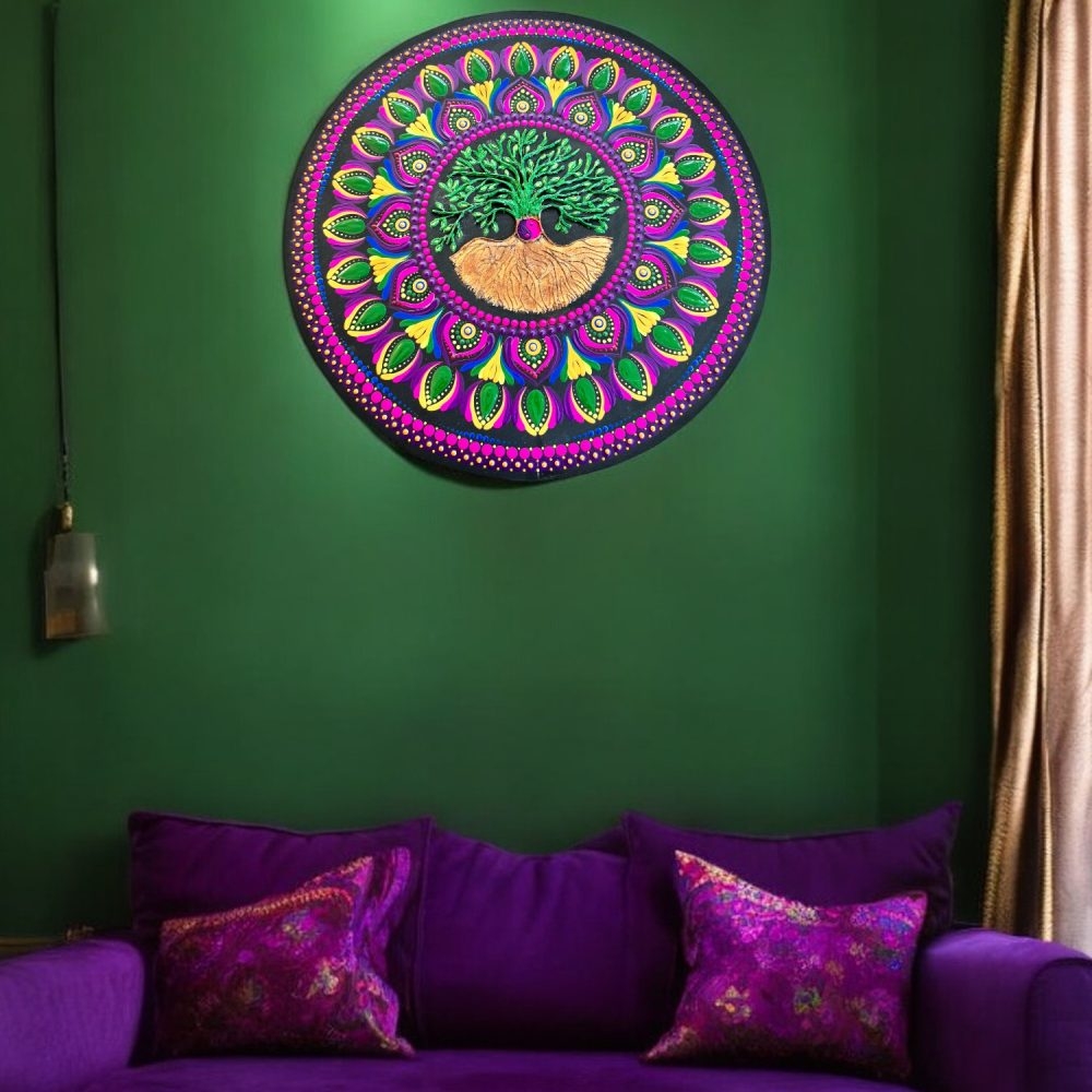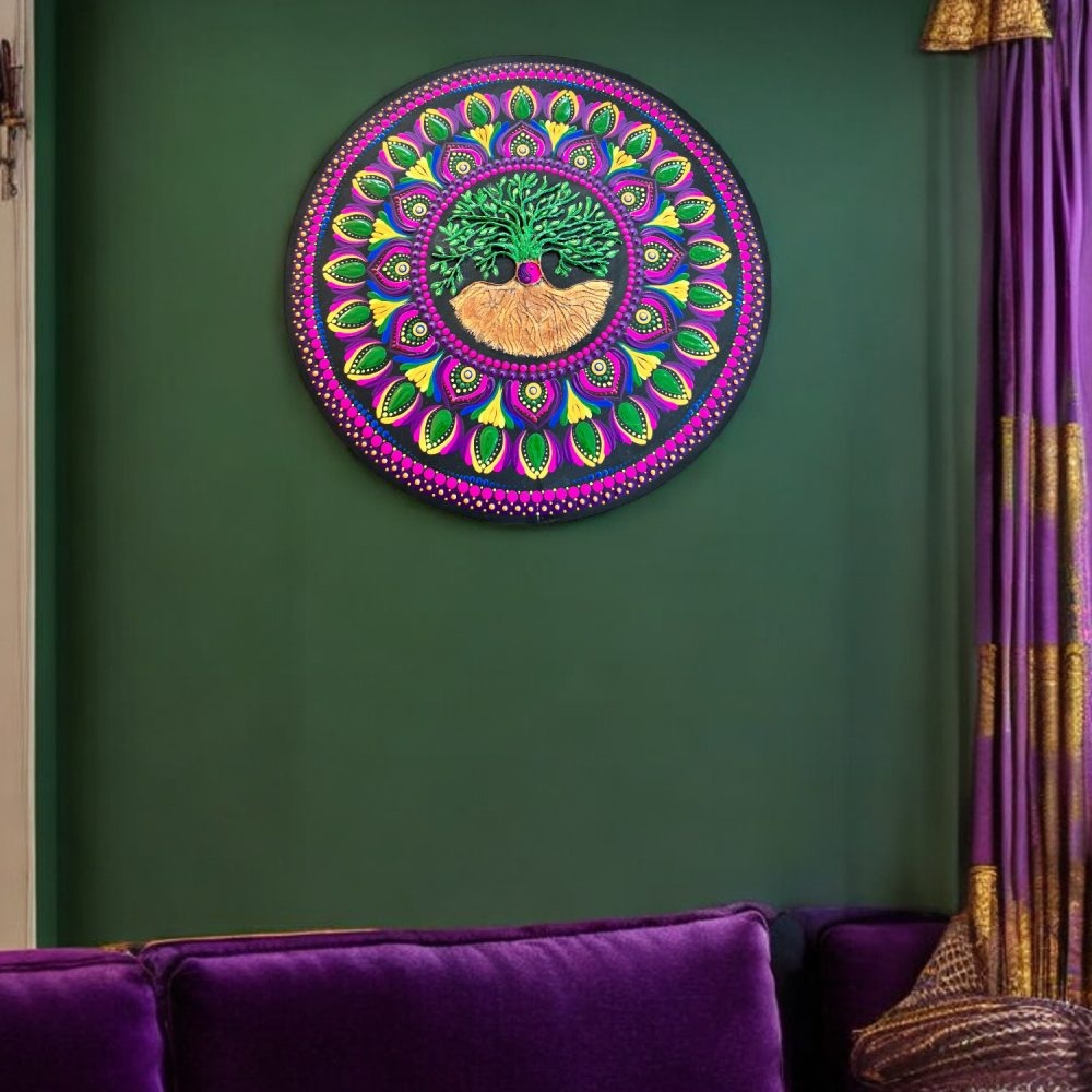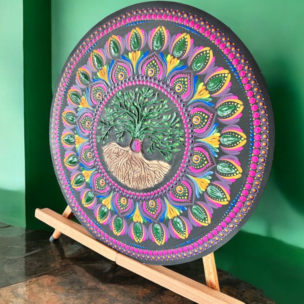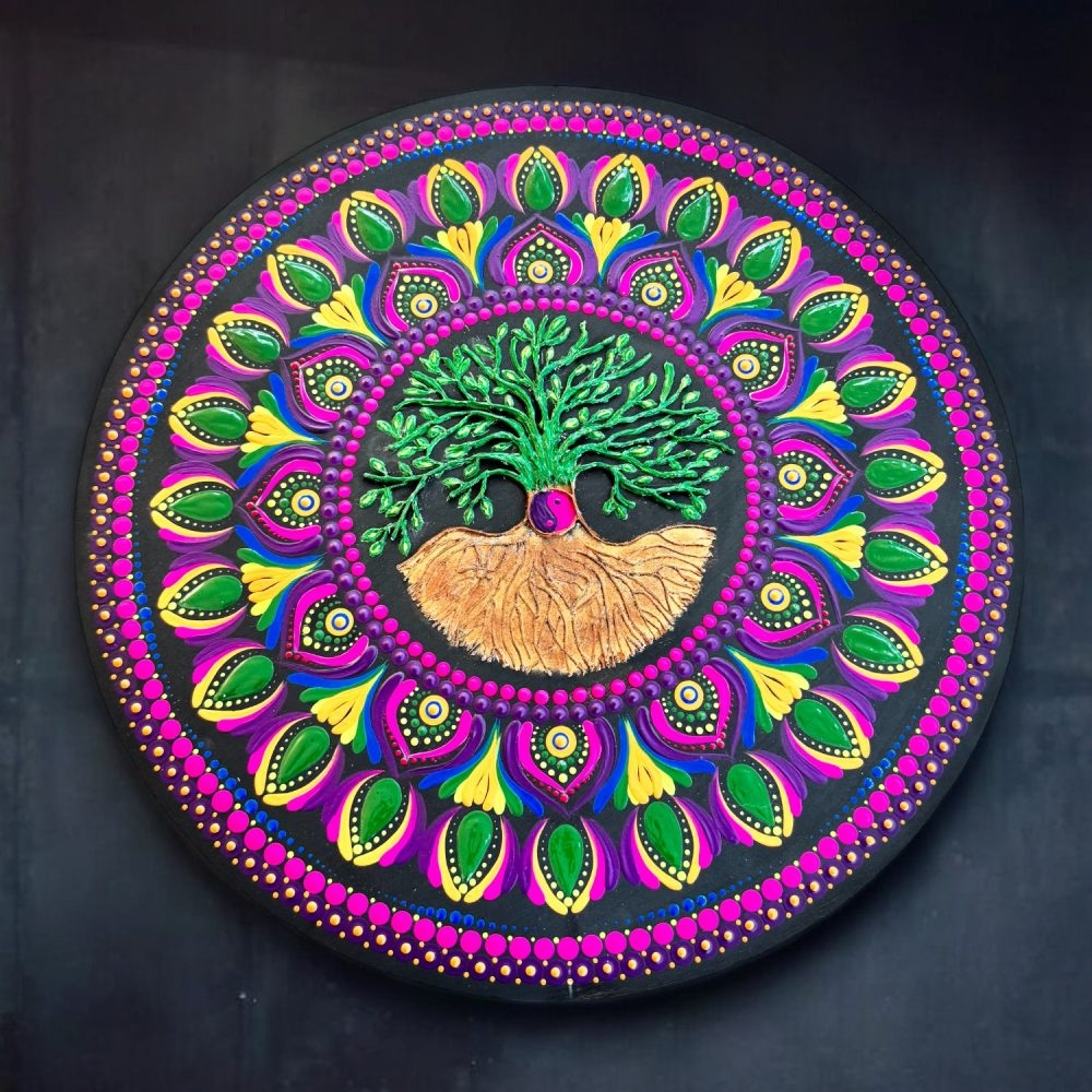 Aceasta mandala pictata manual are in centru simbolul puternic al Copacului Vietii, un semn al intelepciunii si al legaturii noastre cu natura.