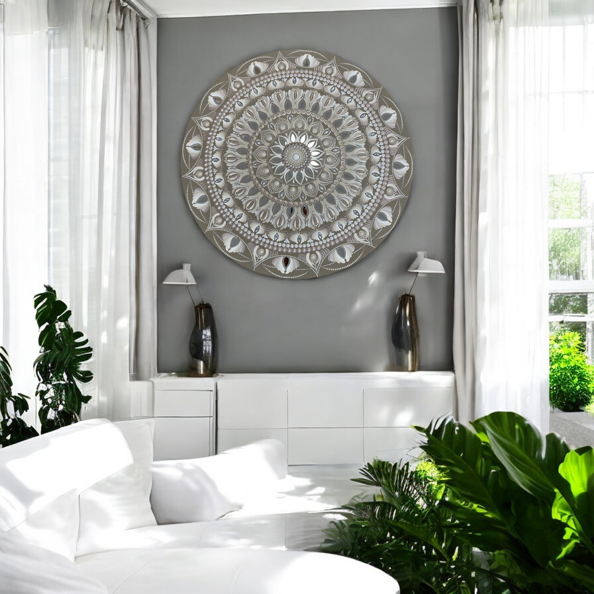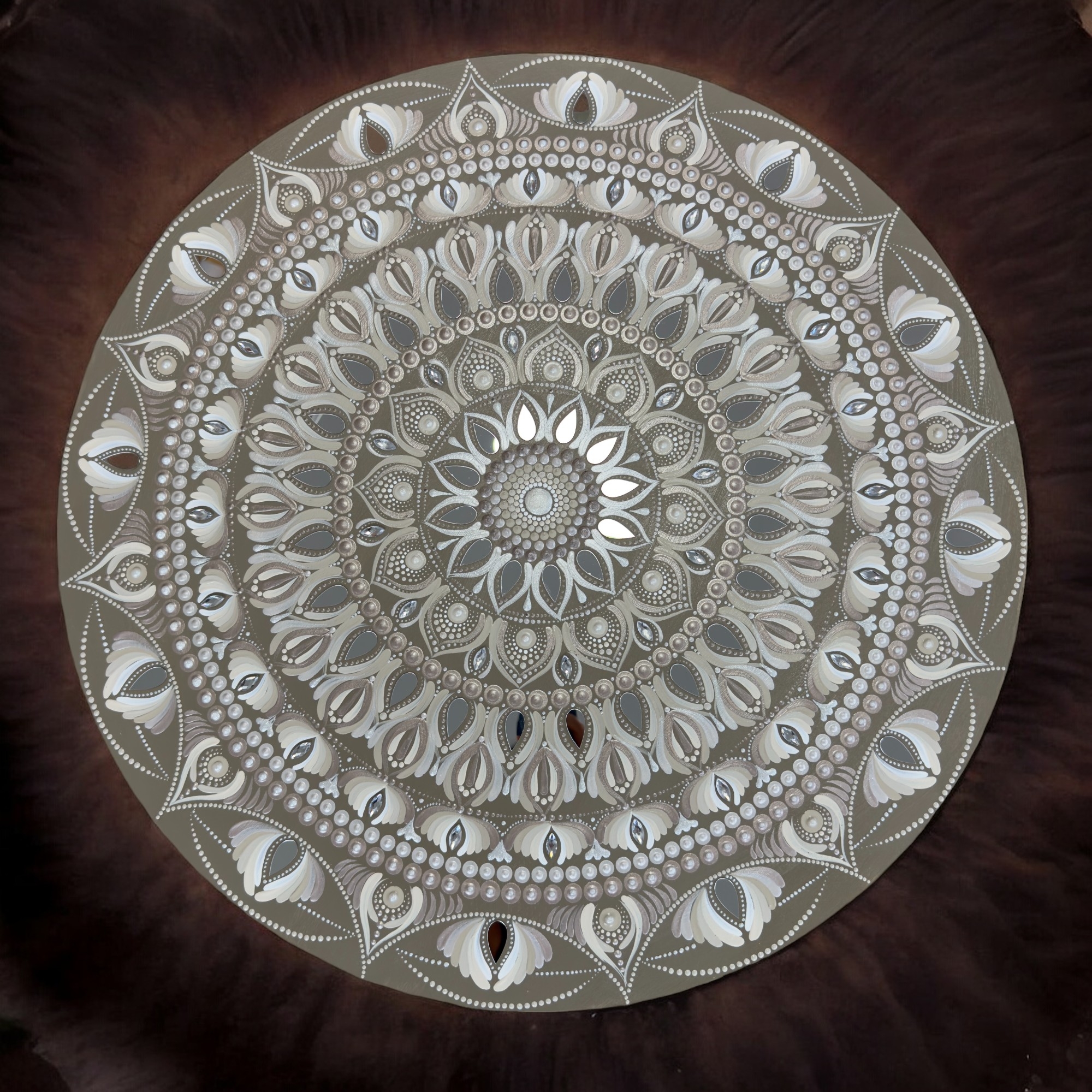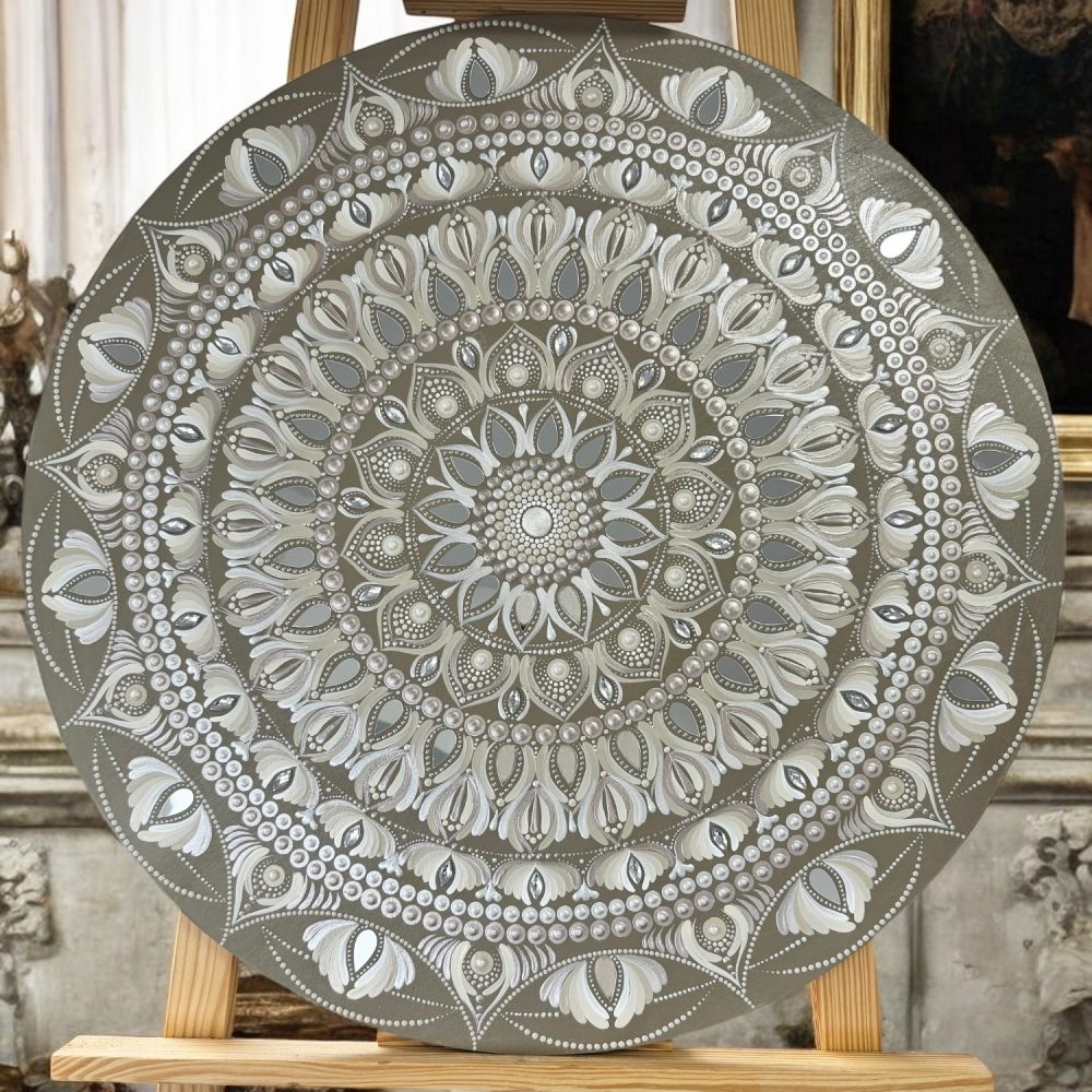 Am pictat acest tablou cu drag si bucurie ca sa aduc in spatiul tau un sentiment de armonie si inspiratie. Noua Mandala emana o eleganta discreta in tonuri de bej, alb si gri. Paleta moale de tonuri neutre sporeste energia linistitoare a Mandalei.