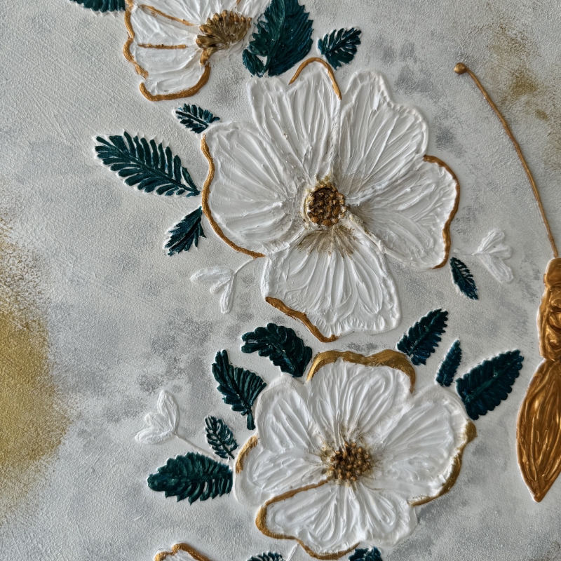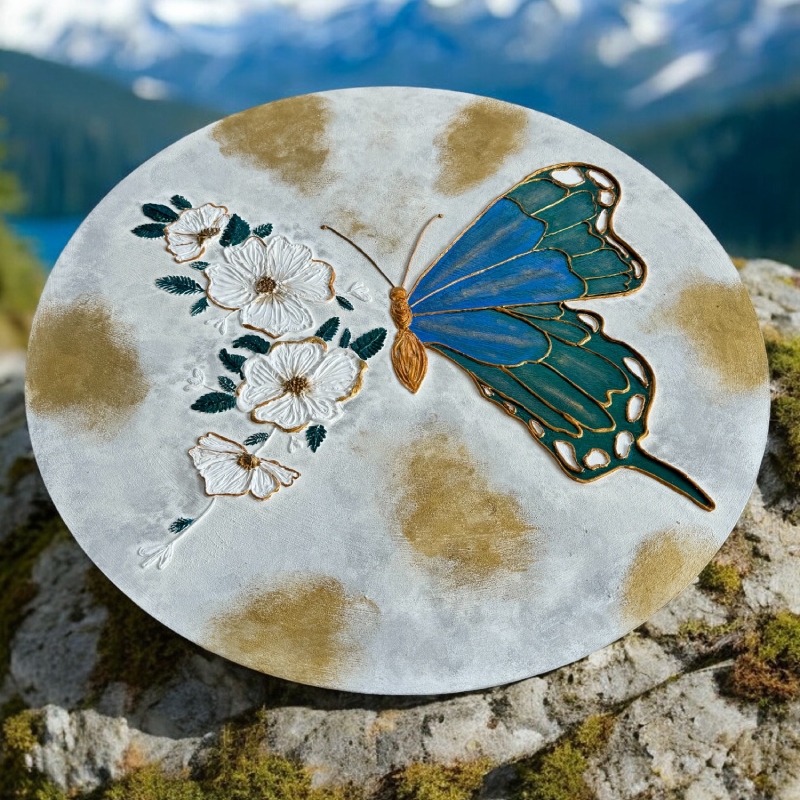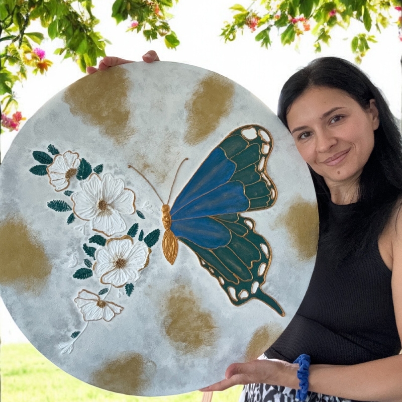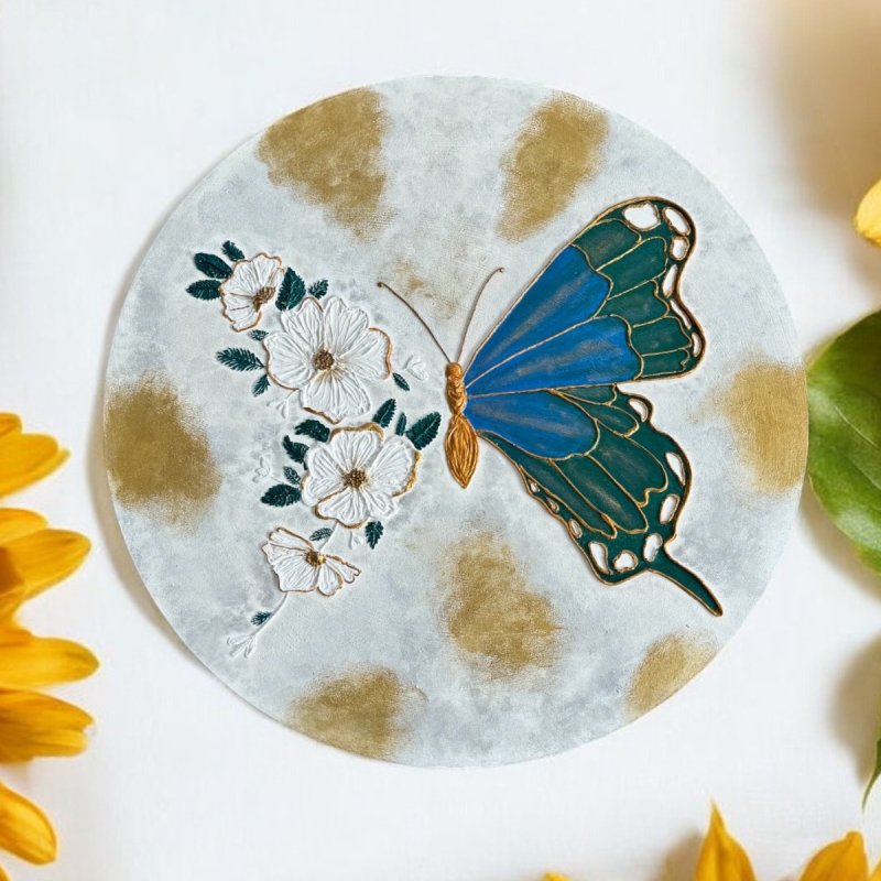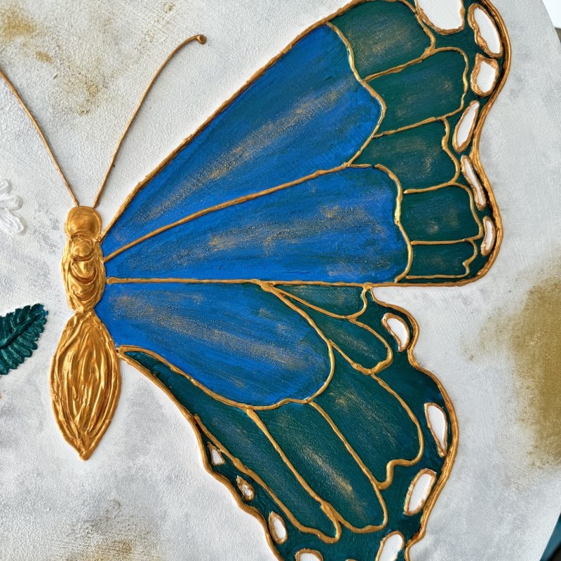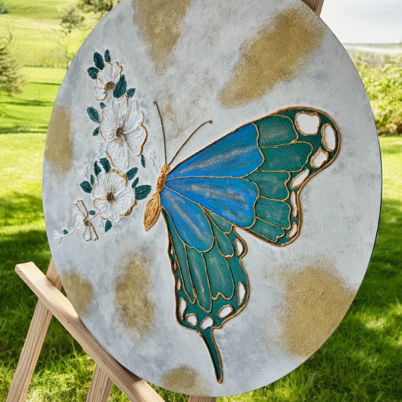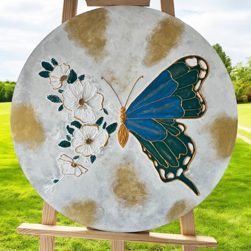Fiecare detaliu al acestui tablou l-am creat cu pasiune, am utilizat pasta de relief si culorile acrilice pentru a conferi adancime si textura. Aripile fluturelui, una in nuante de albastru-verde, iar cealalta inlocuita de flori, simbolizeaza dualitatea naturii – puterea transformarii si frumusetea efemera.