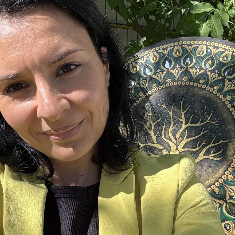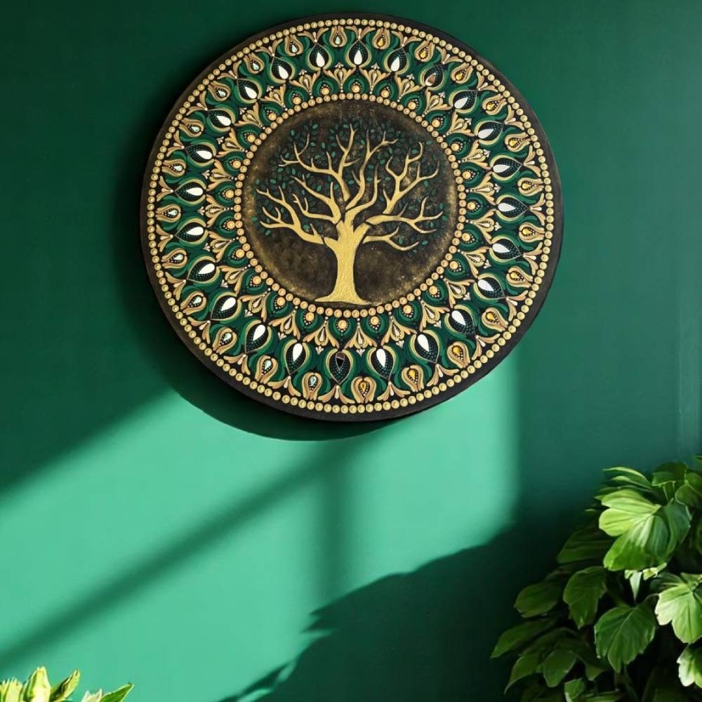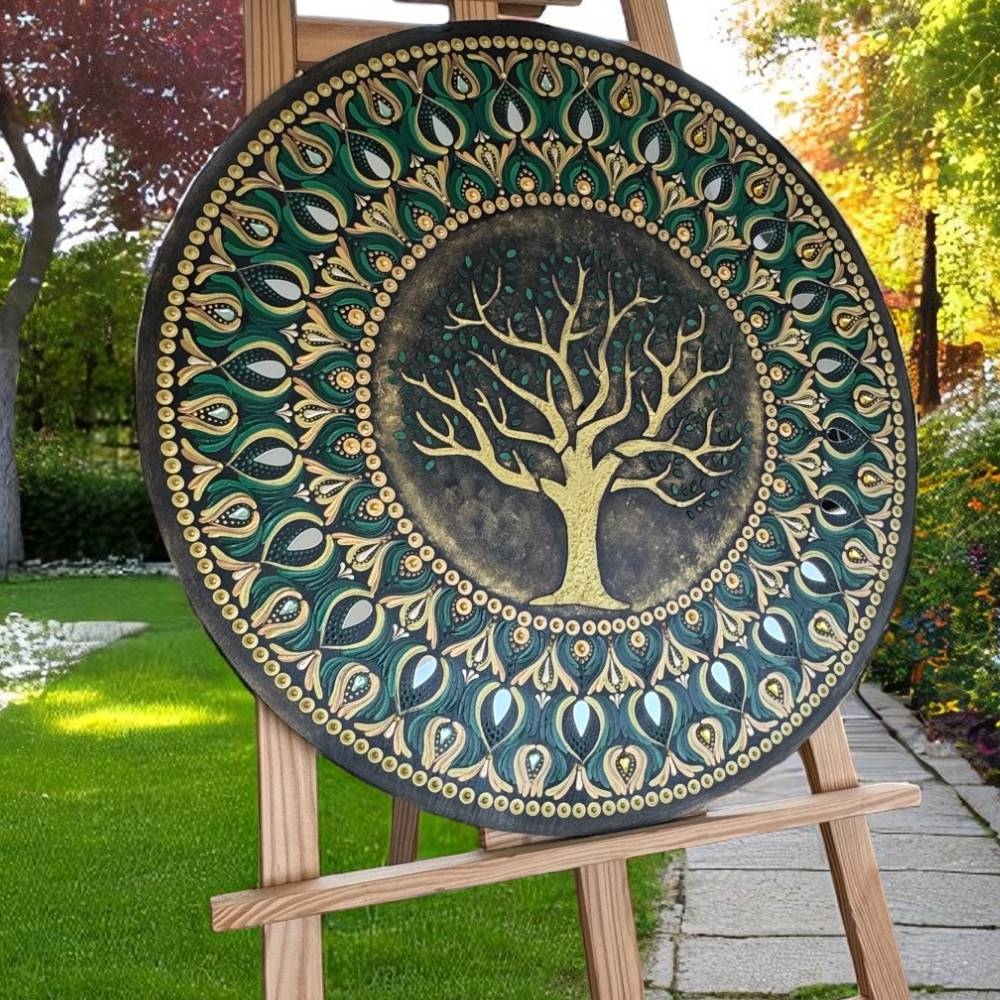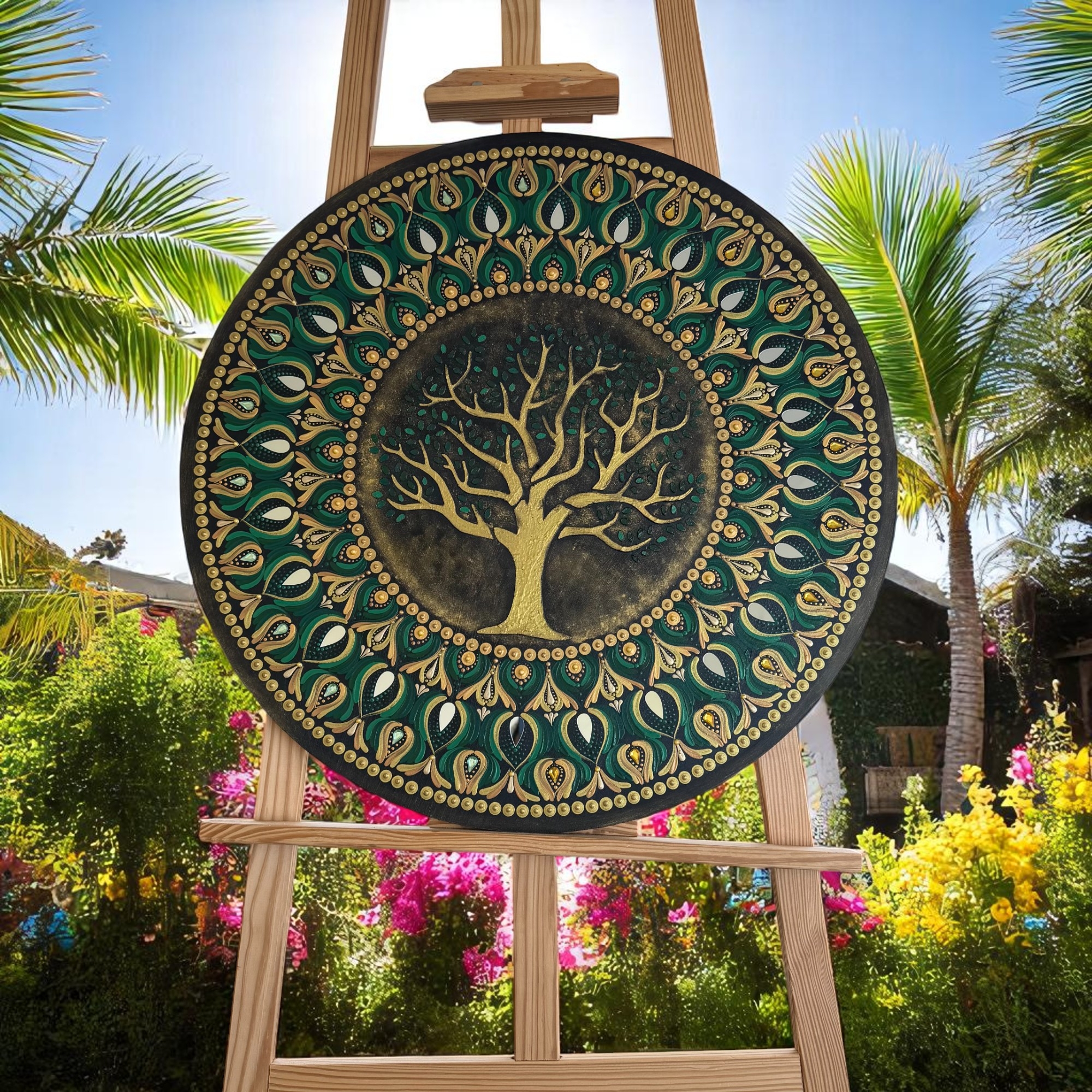 Tabloul Mandala cu Copacul Vietii in nuante de verde si auriu este o piesa unicat pe suport de lemn, in nuante magice de verde si auriu, care poate aduce echilibru si abundenta in fiecare colt al casei tale.