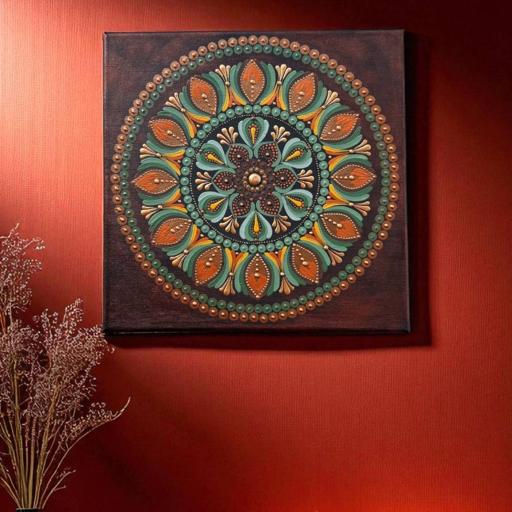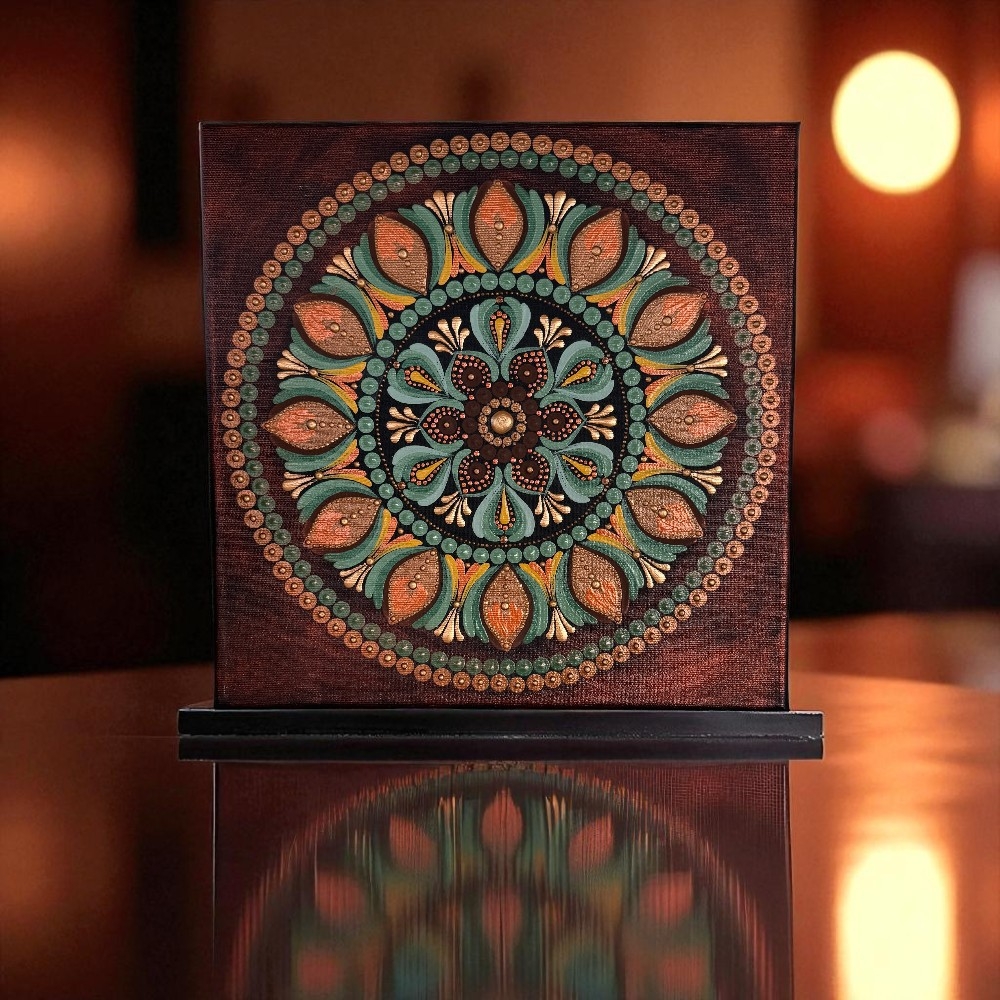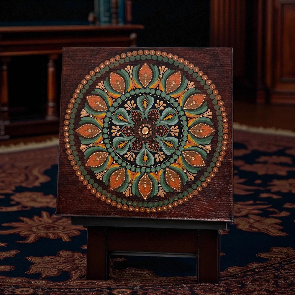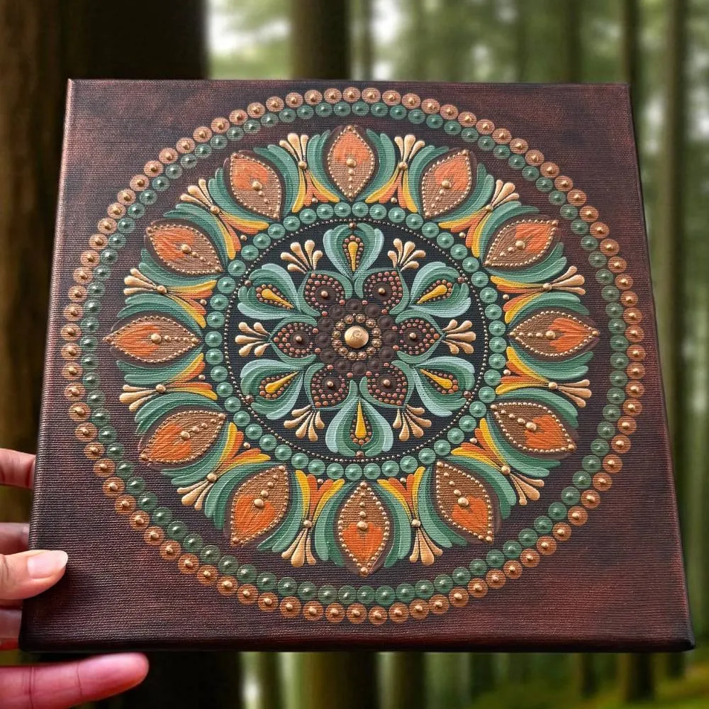 Descopera frumusetea si linistea unei mandale pictate manual pe canvas de 30 cm, in nuante calde ale pamantului – maro, ocru, bej si verde masliniu. Acest tablou patrat este creat cu atentie la detalii si are un design unic, menit sa aduca echilibru si armonie in orice spatiu. Culorile naturale inspira stabilitate, calm si o conexiune profunda cu energia pamantului, fiind ideale pentru decorul livingului, biroului sau spatiului de relaxare.