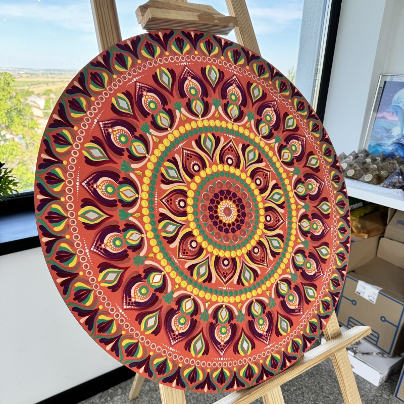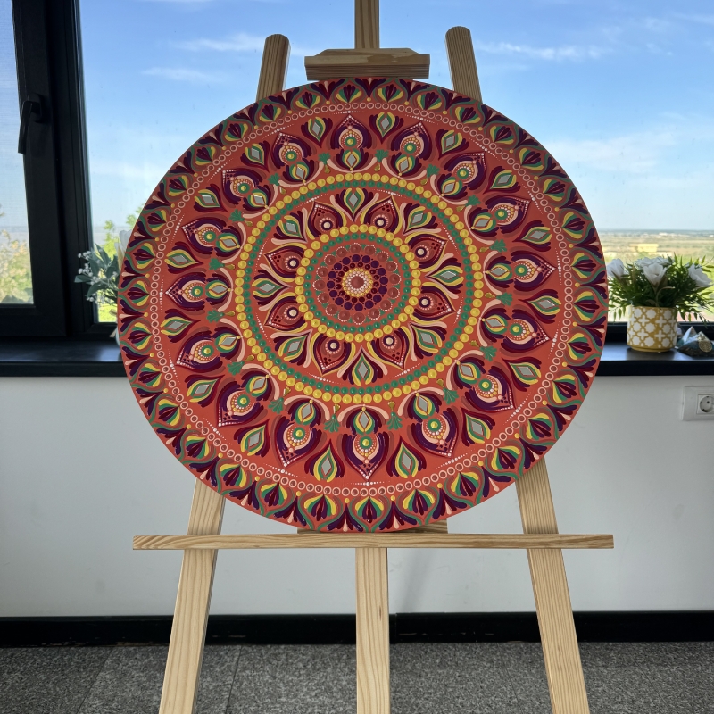 Aceasta noua Mandala pe care am creat-o este o explozie vibranta de culoare si are un design placut, invitandu-te sa faci o pauza, sa respiri si sa apreciezi frumusetea momentului prezent.
