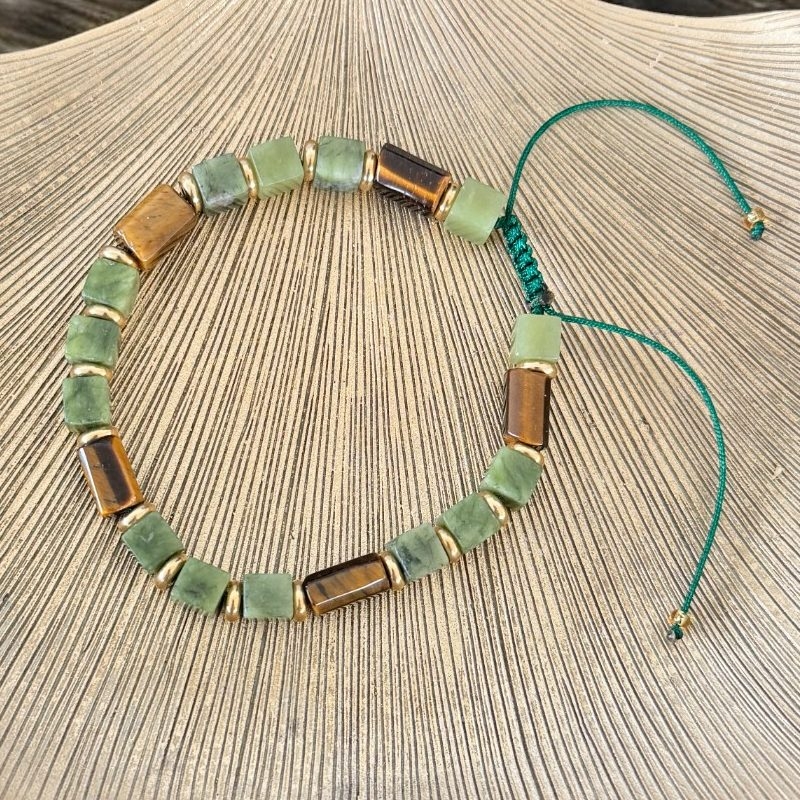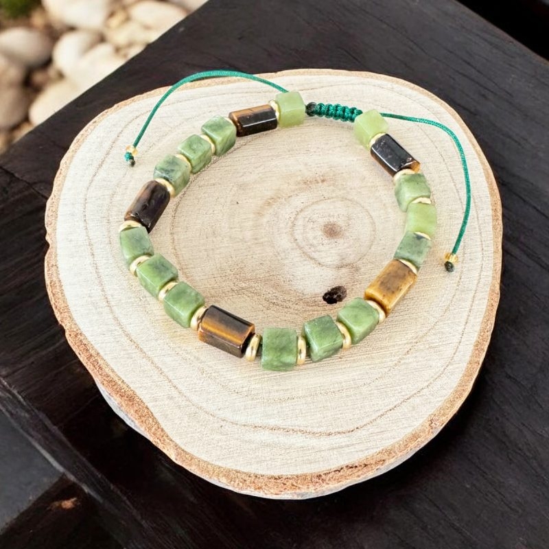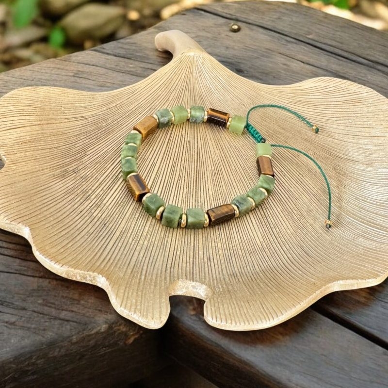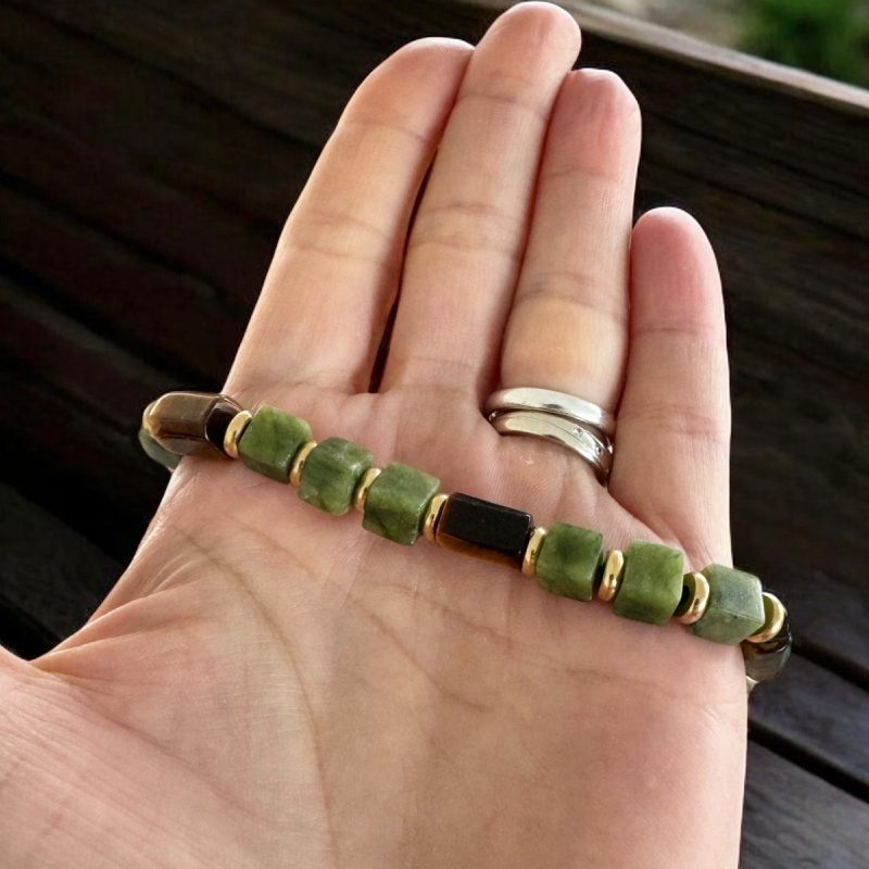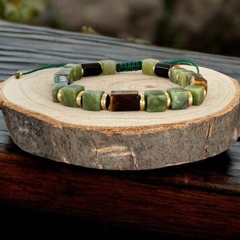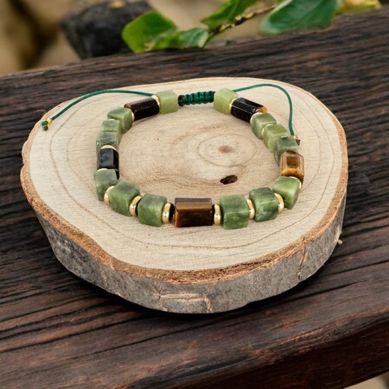 Bratara pentru barbati **Andy** combina elemente clasice si moderne intr-un design cu adevarat special. Cu cristale de jad verde in forma patrata si tuburi din ochi de tigru, aceasta piesa se remarca imediat prin detaliile sale elegante si neobisnuite. Fiecare piatra este atent aleasa pentru a imbina estetica sofisticata cu proprietatile energetice ale cristalelor naturale.