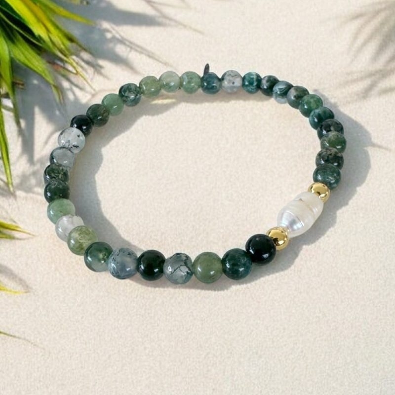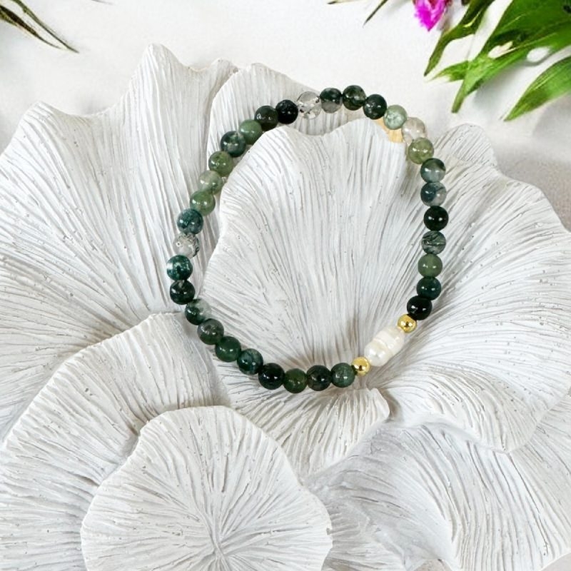 Moss Agate, cunoscut drept „piatra naturii”, are un aspect unic ce aminteste de paduri verzi si peisaje naturale. Este un cristal al cresterii, conexiunii cu natura si al echilibrului emotional. Aceasta bratara nu doar ca adauga un plus de frumusete tinutei tale, dar te conecteaza la energia calmanta si revitalizanta a naturii.