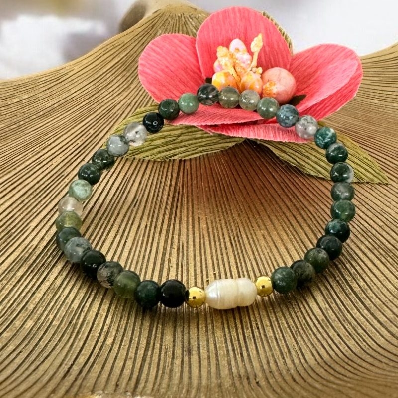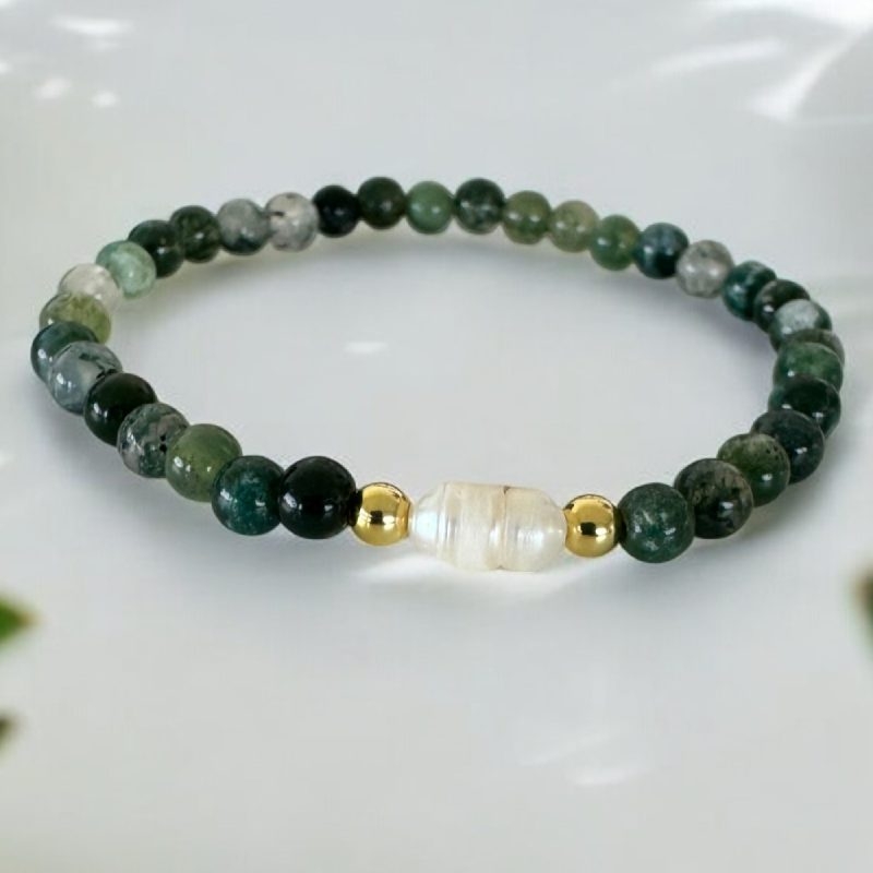 Aceasta bratara delicata aduce impreuna frumusetea naturala a cristalului Moss Agate si eleganta perlei, completate de accente stralucitoare din argint placat cu aur.