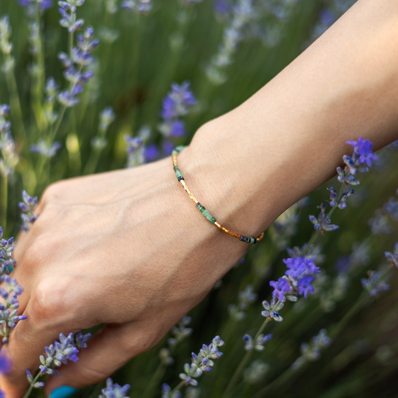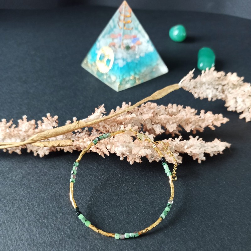Poarta cu tine bratara din cristale de zoisit cu rubin, cristalul este cunoscut ca fiind piatra care imbunatateste legatura dintre inima si creier.
