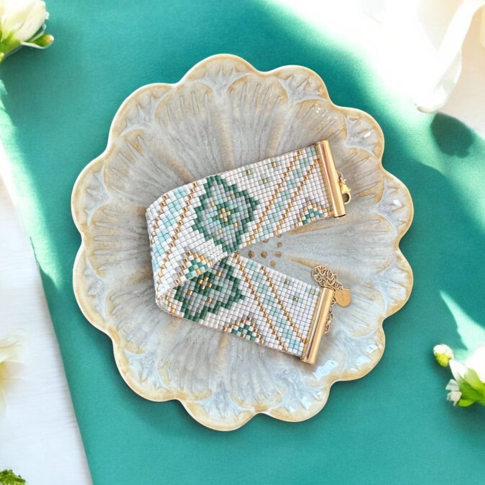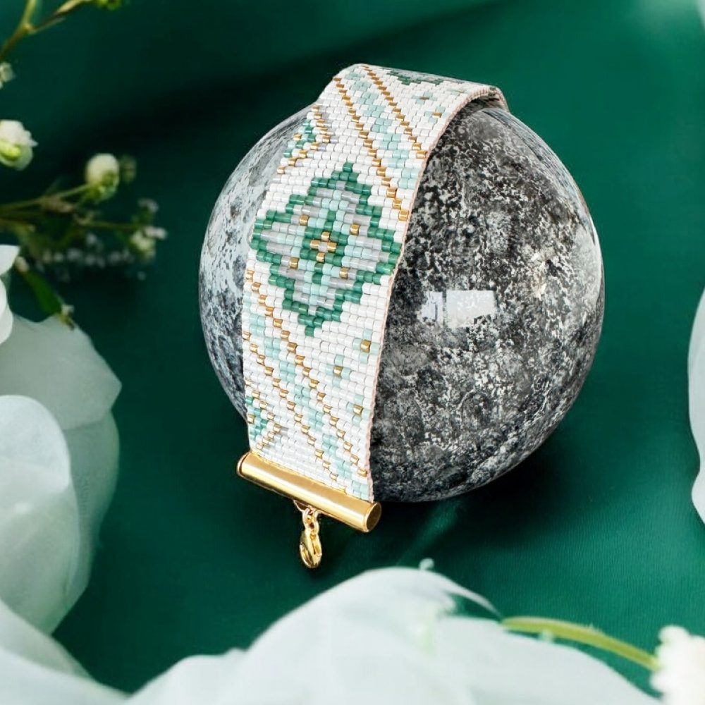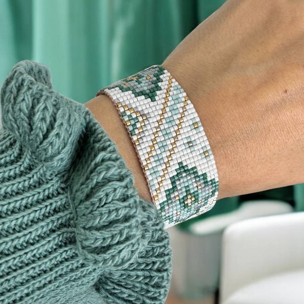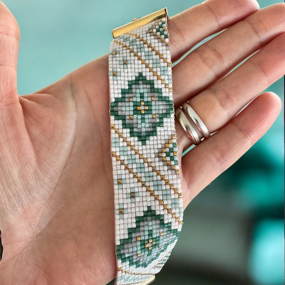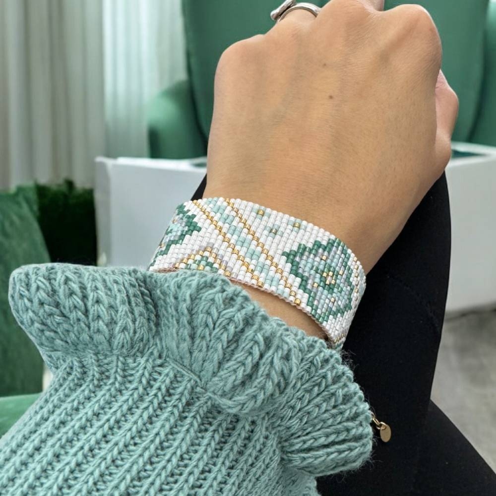Descopera bratara handmade impletita din margele Miyuki, un accesoriu deosebit creat pentru femeile care iubesc bijuteriile unicat. Aceasta bratara captivanta imbina nuante de bleu, verde, gri, auriu si alb, oferind un joc subtil de culori care se potriveste perfect cu orice stil.