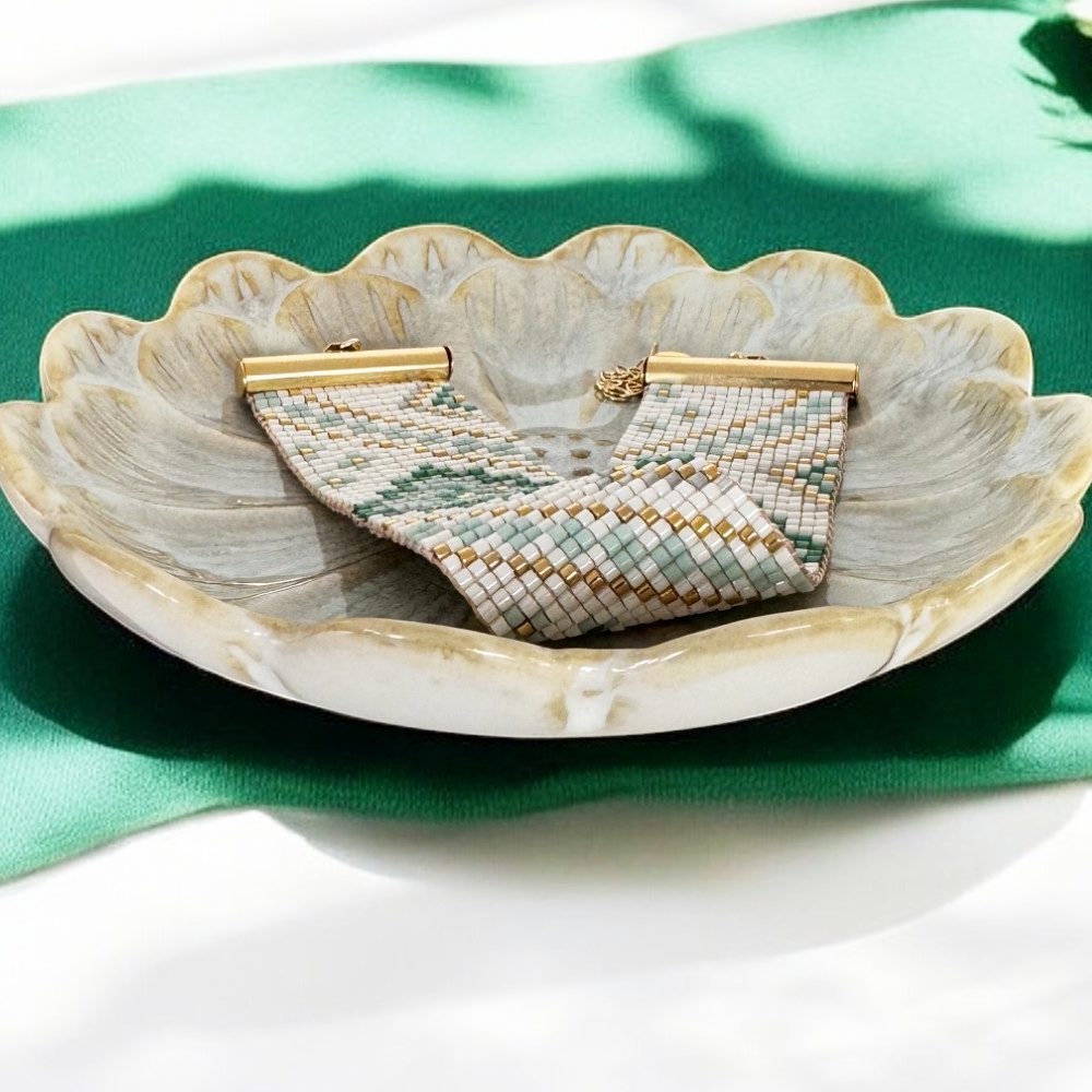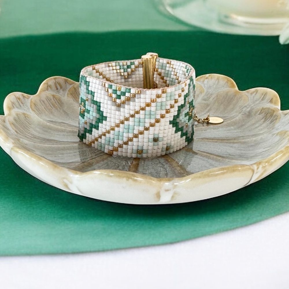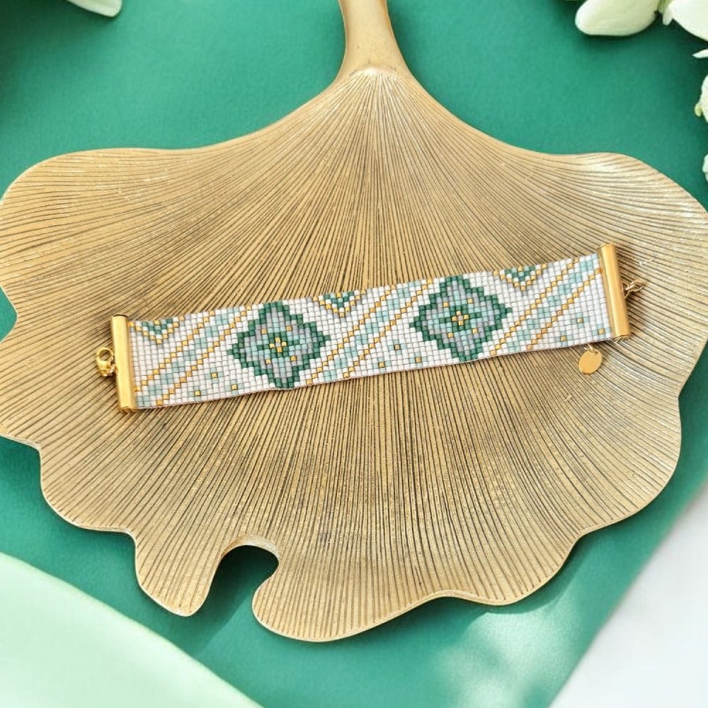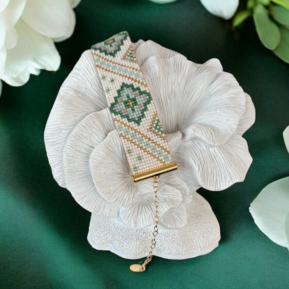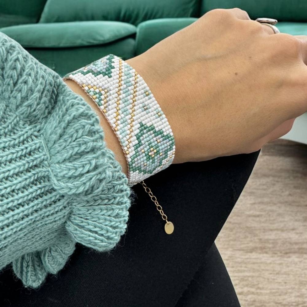 Descopera bratara handmade impletita din margele Miyuki, un accesoriu deosebit creat pentru femeile care iubesc bijuteriile unicat. Aceasta bratara captivanta imbina nuante de bleu, verde, gri, auriu si alb, oferind un joc subtil de culori care se potriveste perfect cu orice stil.