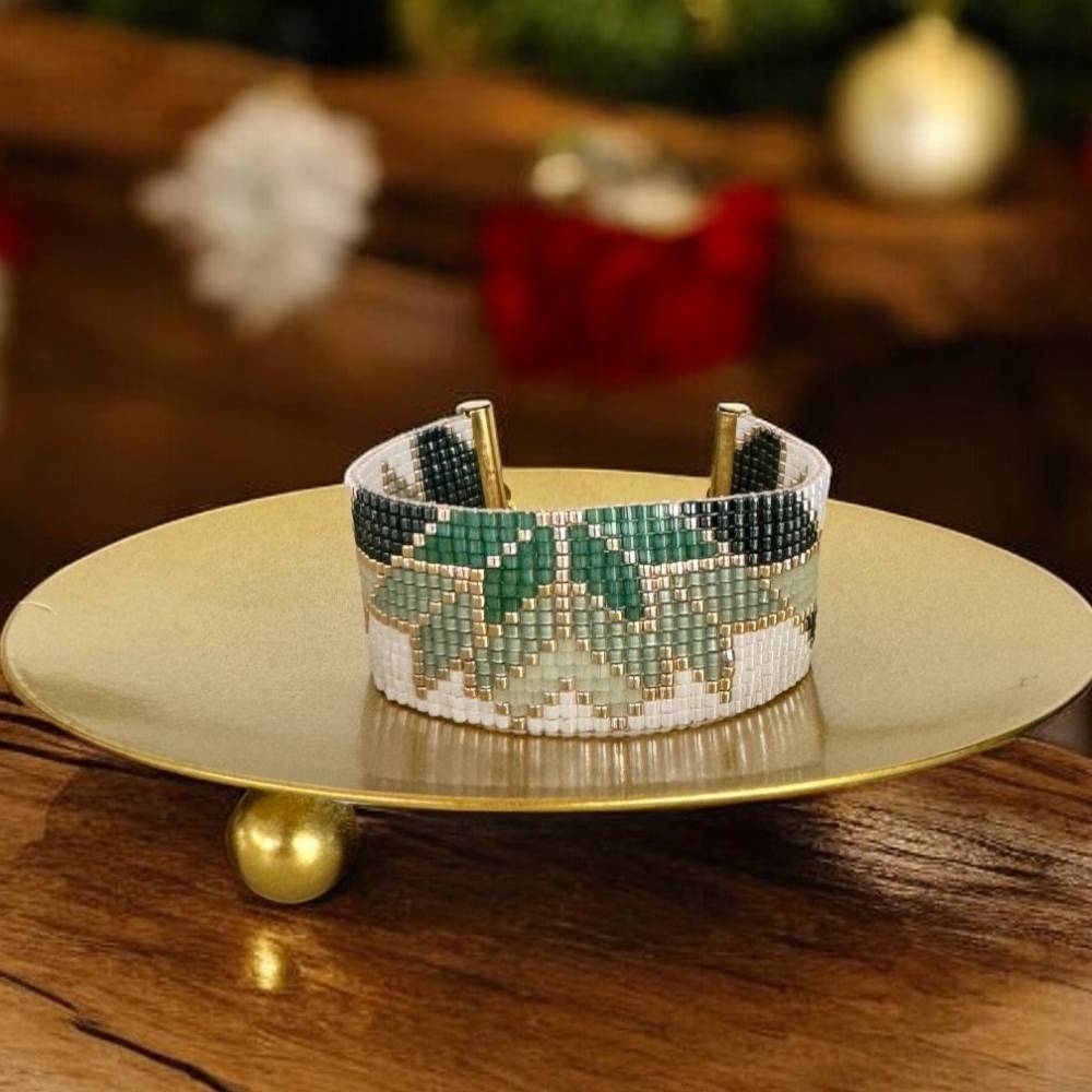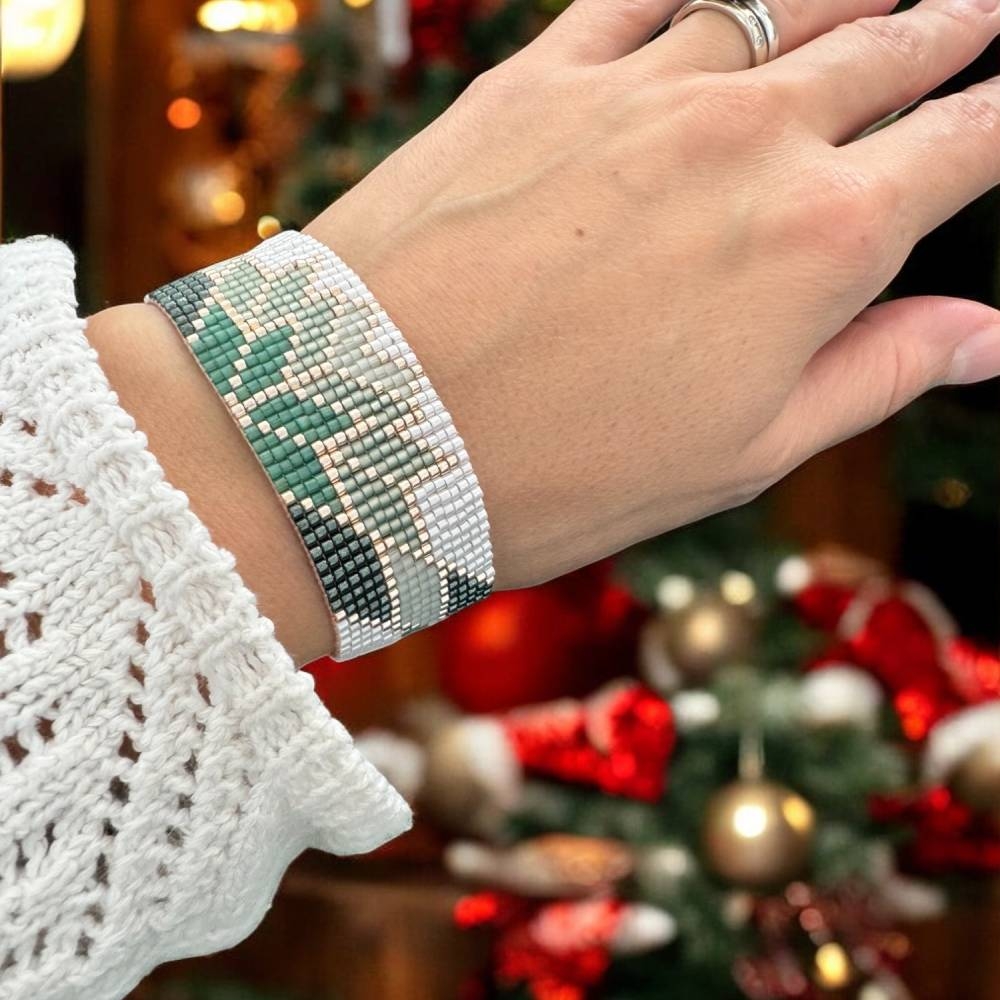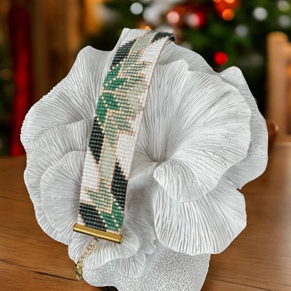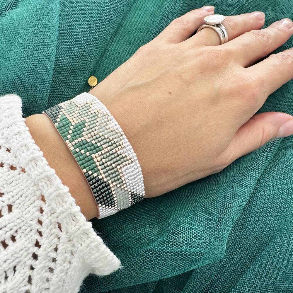 Alege sa iti definesti stilul cu bratara lata din margele miyuki, o creatie unica ce imbina finetea cu un design deosebit. Am realizat-o manual cu migala si pasiune. Fiecare margica in nuante de verde, alb si auriu creeaza un joc subtil de culori, ca o poveste in care simturile se pierd si se regasesc. Este mai mult decat o bijuterie – este o veriga intre tine si universul emotiilor tale.