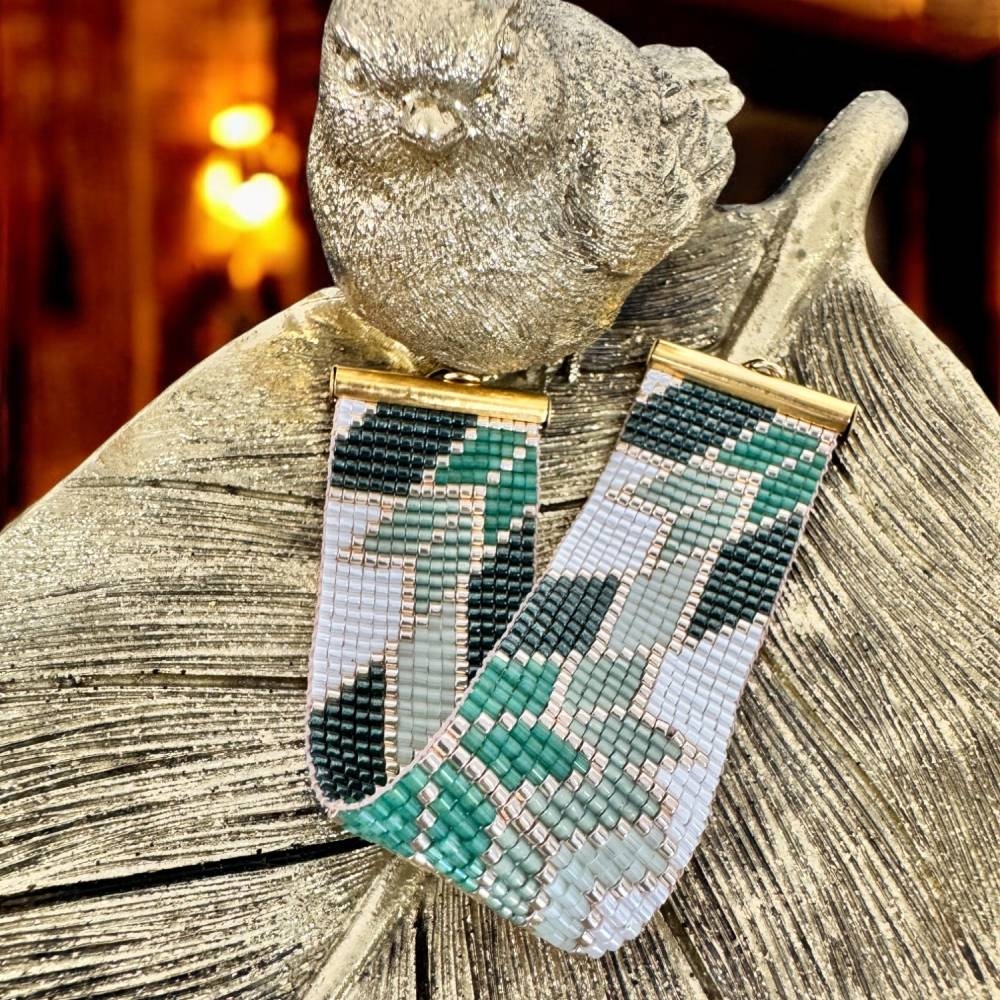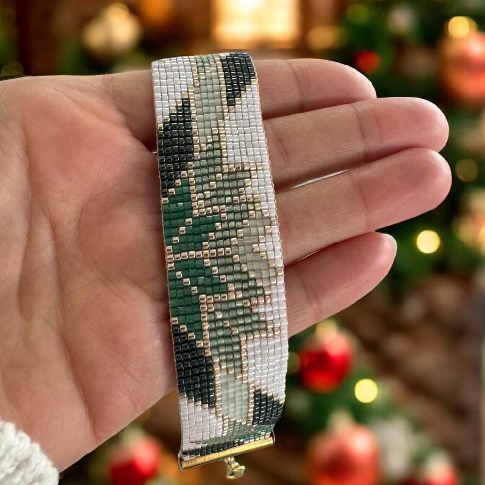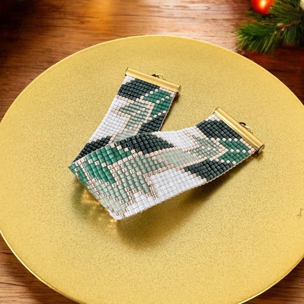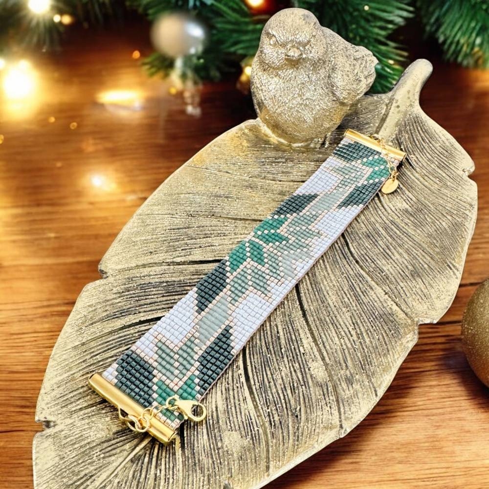 Alege sa iti definesti stilul cu bratara lata din margele miyuki, o creatie unica ce imbina finetea cu un design deosebit. Am realizat-o manual cu migala si pasiune. Fiecare margica in nuante de verde, alb si auriu creeaza un joc subtil de culori, ca o poveste in care simturile se pierd si se regasesc. Este mai mult decat o bijuterie – este o veriga intre tine si universul emotiilor tale.
