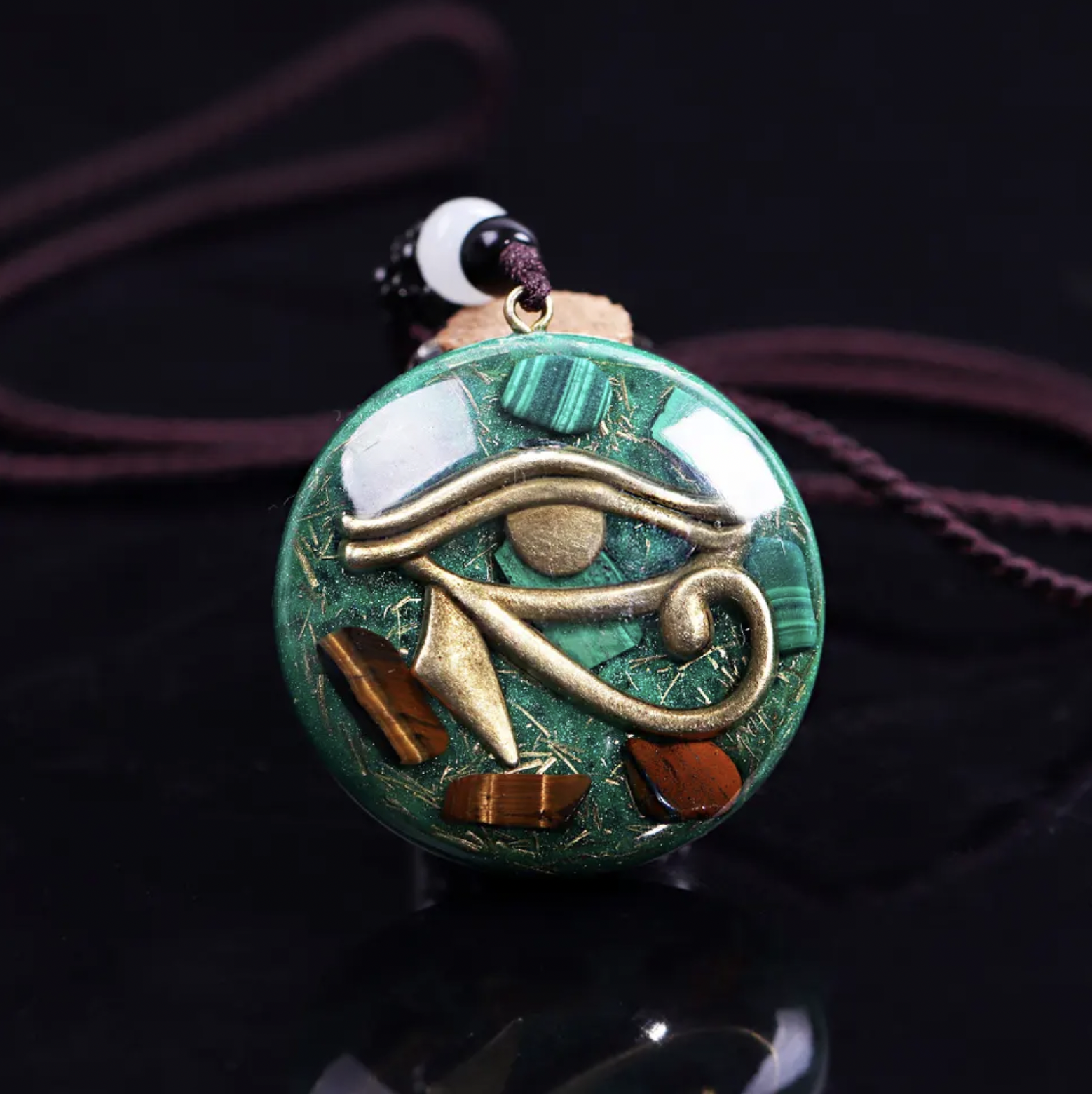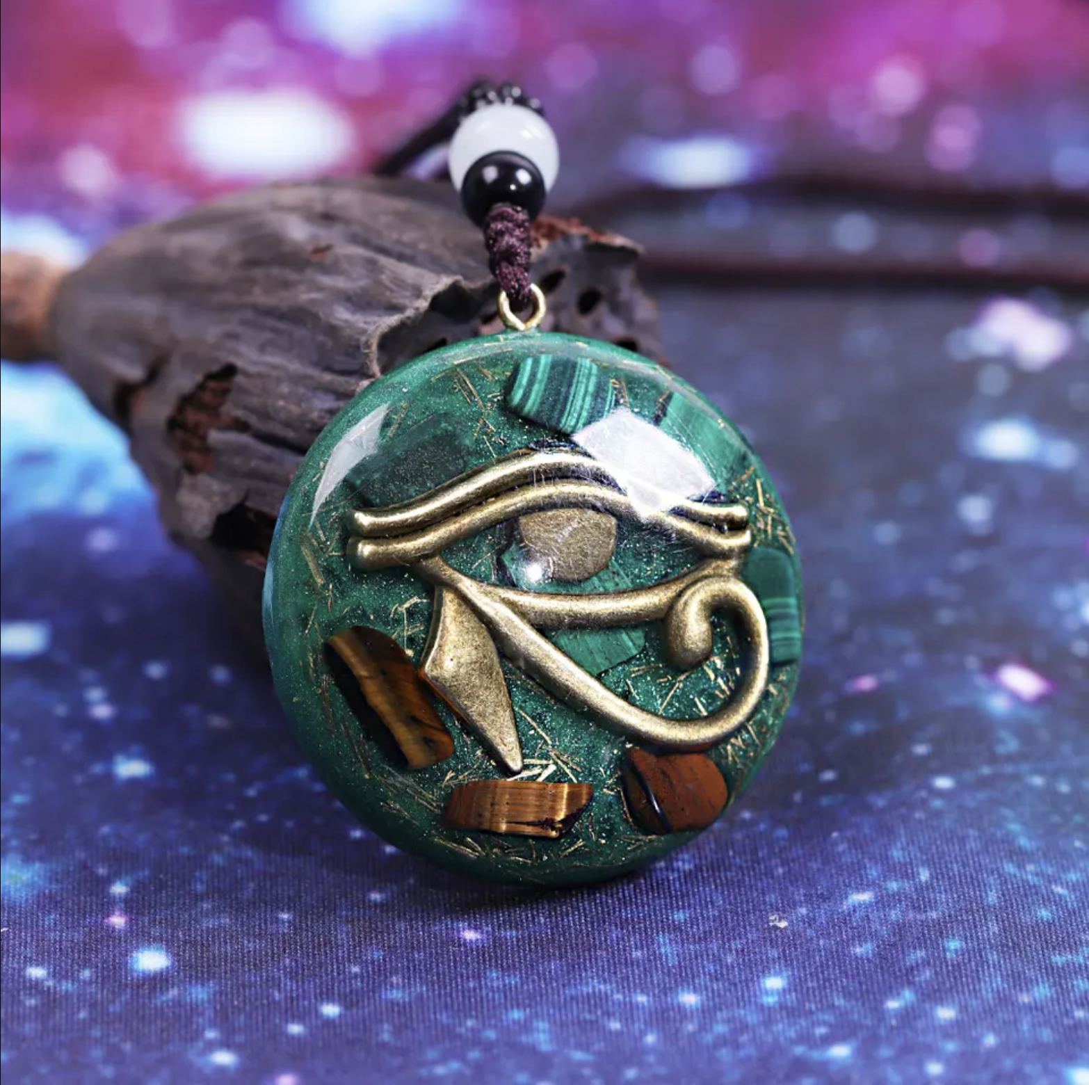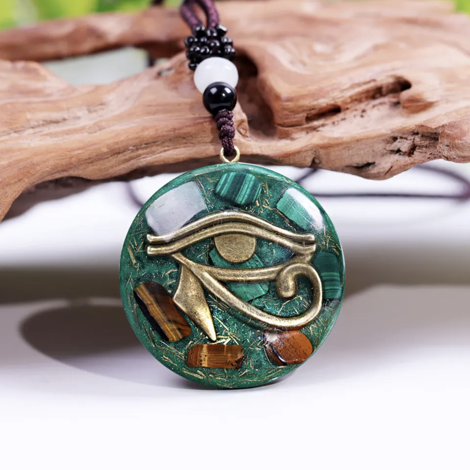 Pandantiv Orgonic pentru femei si barbati din cristale de Malachit si Ochi de Tigru cu simbol Ochiul lui Horus